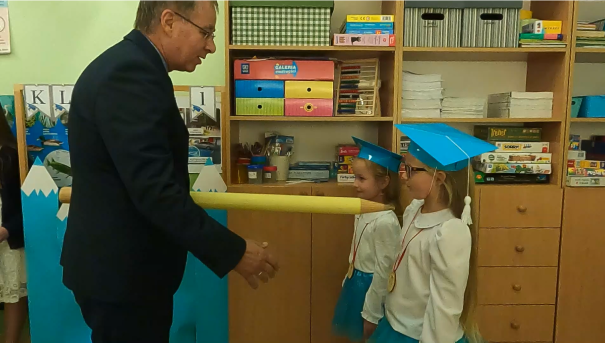 Dyrektor Szkoły po uroczystym ślubowaniu klasy I symbolicznie pasował każdego.ucznia.