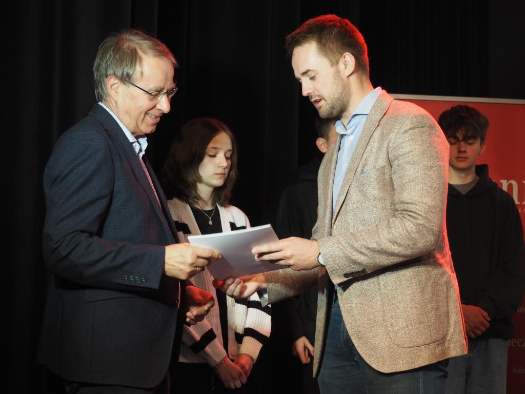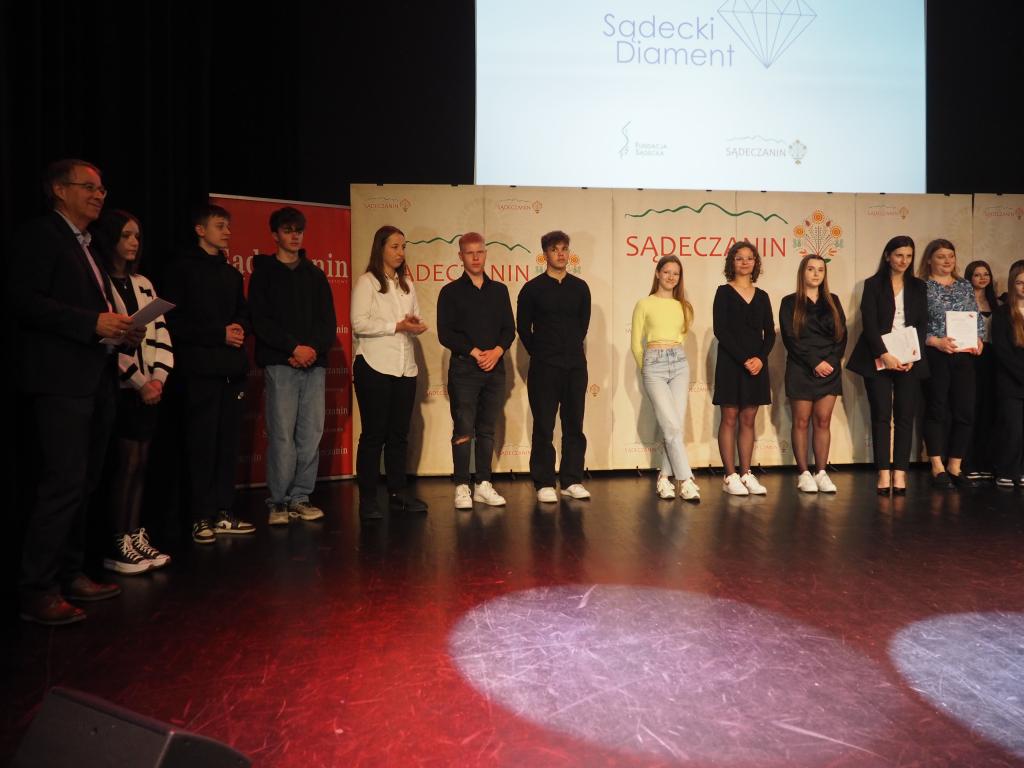 Prezes Społeczno-Kulturalnego Towarzystwa Sądeczanin Jarosław Baziak podczas gali wręczył pamiątkowe dyplomy uczniom Zespołu Szkół Samochodowych im. Tadeusza Tańskiego w Nowym Sączu, Zespołu Szkół nr 1 im. Komisji Edukacji Narodowej w Nowym Sączu, Szkoły Podstawowej im. św. Ojca Stanisława Papczyńskiego w Podegrodziu i Szkoły Podstawowej nr 2 w Piwnicznej-Kosarzyskach.
