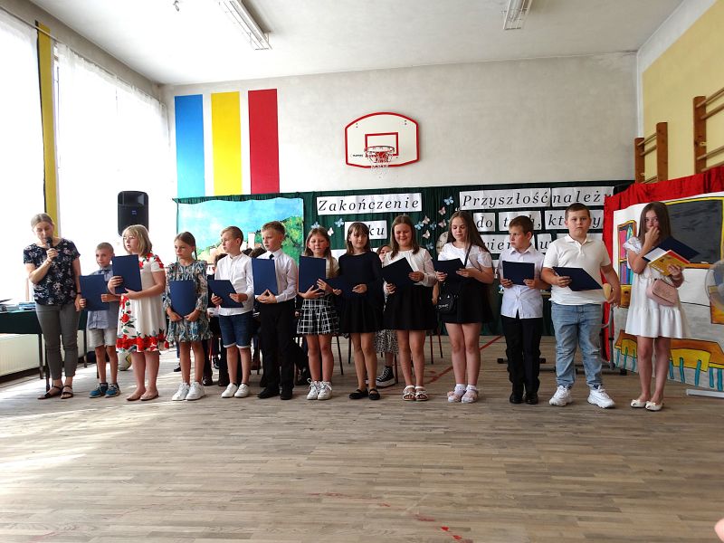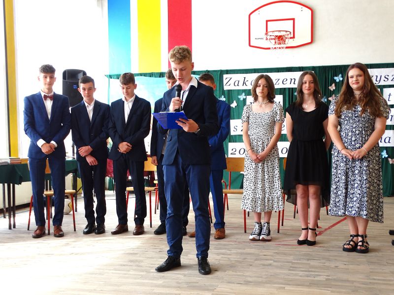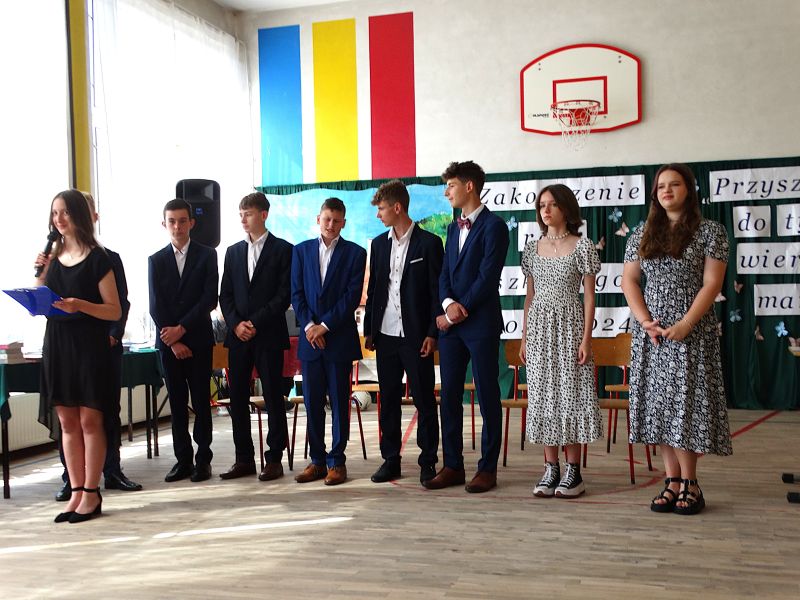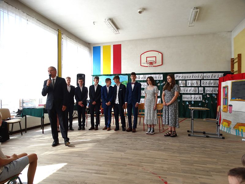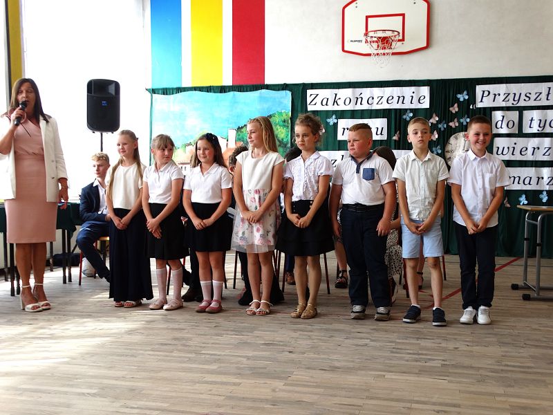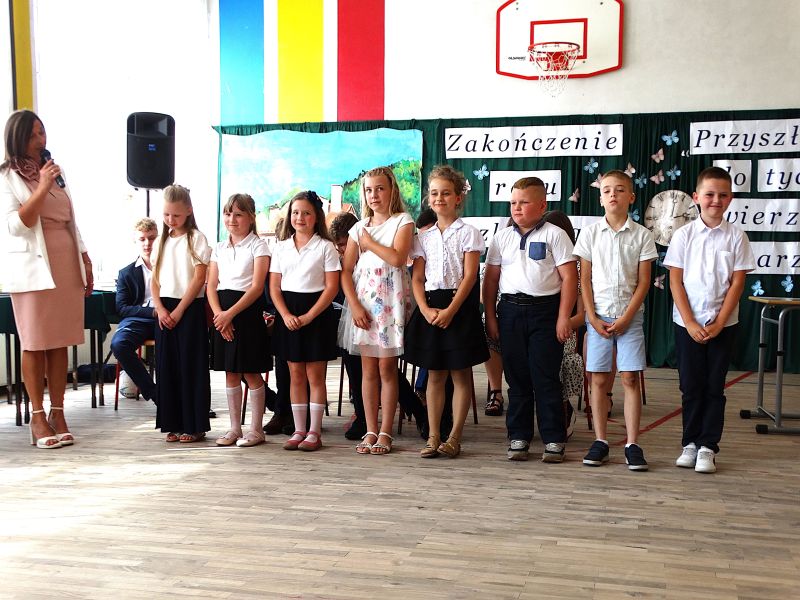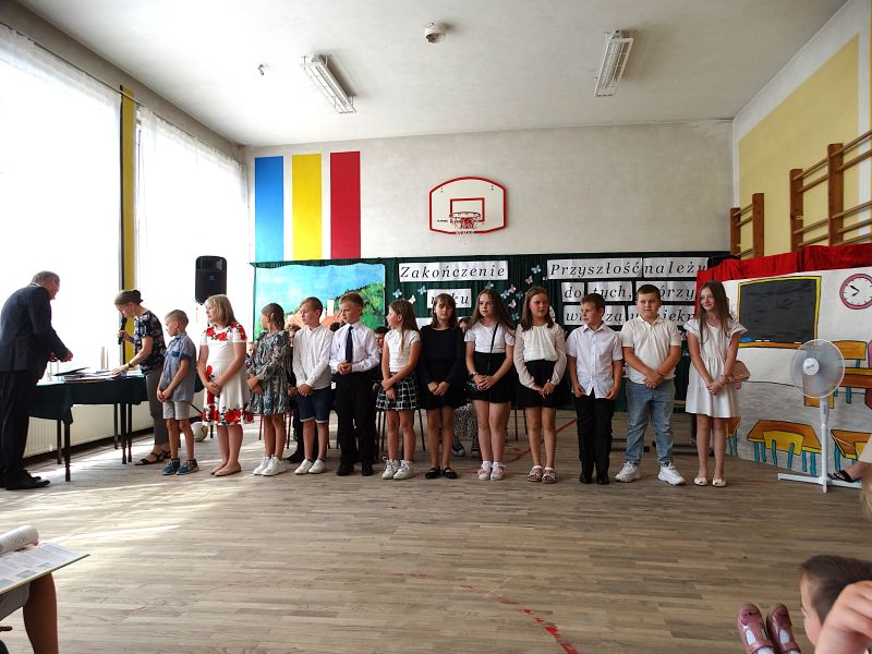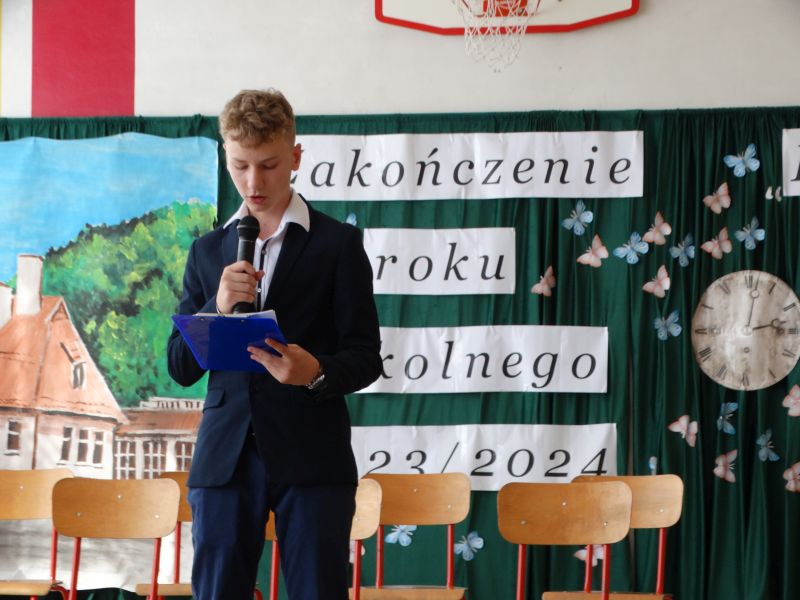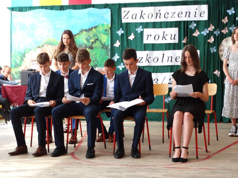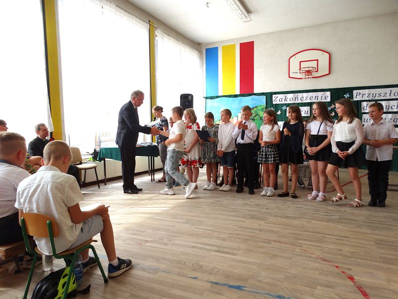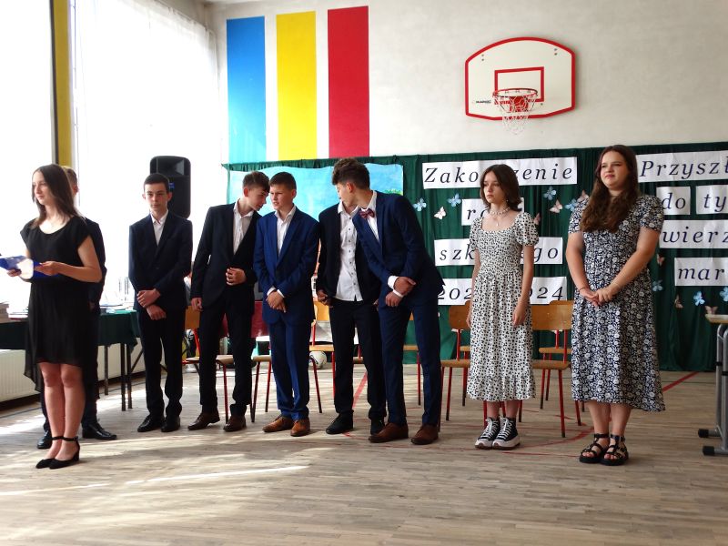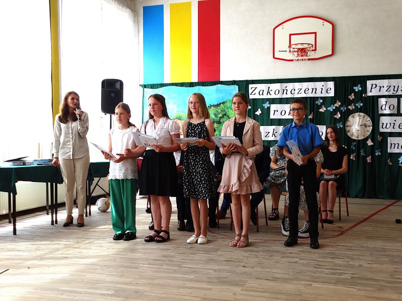W dniu 21.06.2024r. odbyło się uroczyste zakończenie roku szkolnego 2023/2024. Uroczystość rozpoczęła się od wprowadzenia sztandaru i odśpiewania hymnu. Następnie absolwenci klasy VIII złożyli uroczyste ślubowanie, po którym głos zabrał Pan Dyrektor – Marian Dobosz, nawiązując przede wszystkim do uczniów klasy VIII, przebiegu ich szkolnej kariery. Następnie tegoroczni absolwenci zaprezentowali krótki program artystyczny, po którym nadszedł moment uroczystego wręczenia świadectw i dyplomów absolwentom, listów gratulacyjnych Rodzicom wyróżnionych uczniów, a także specjalnych podziękowań za współpracę. Na zakończenie wychowawca klasy, Pani Anna Janeczek, w krótkiej przemowie podsumowała lata pracy wychowawczej oraz współpracy z Rodzicami.