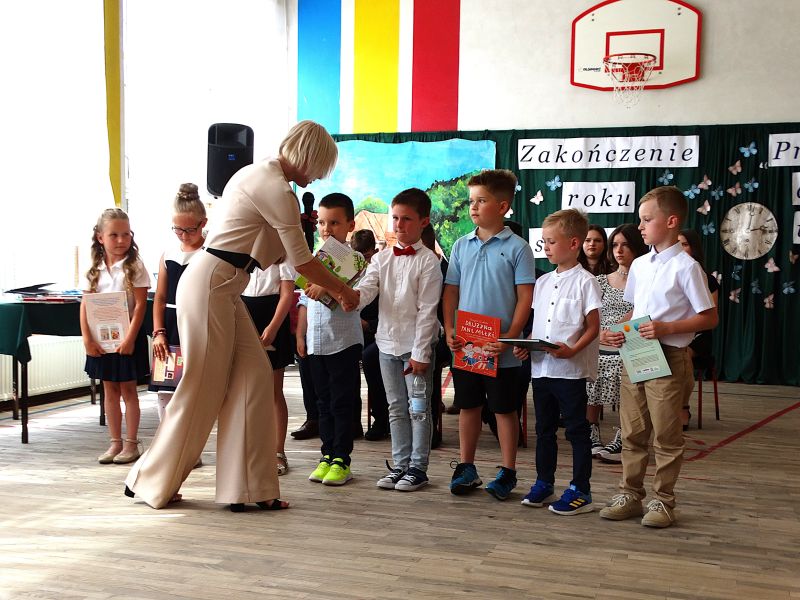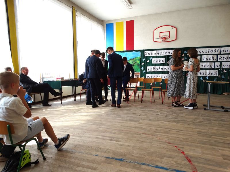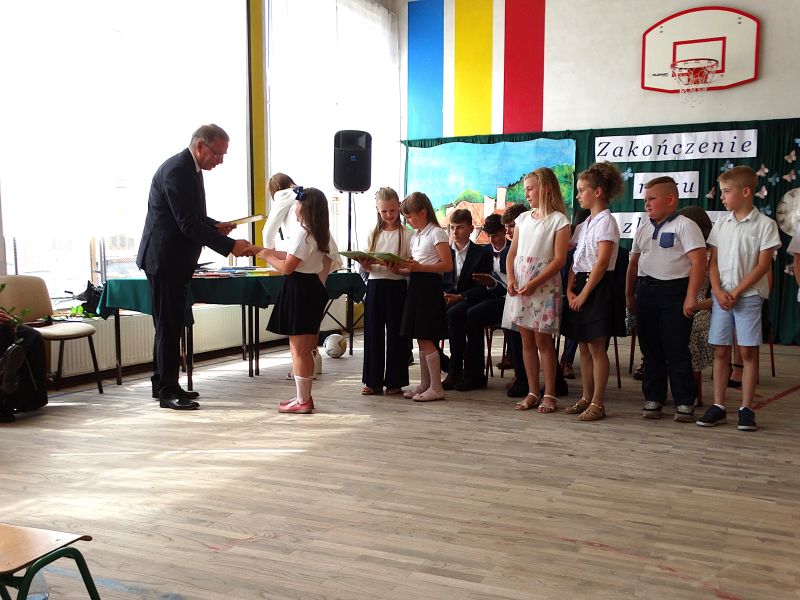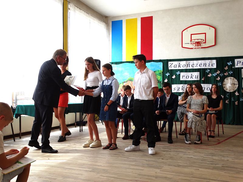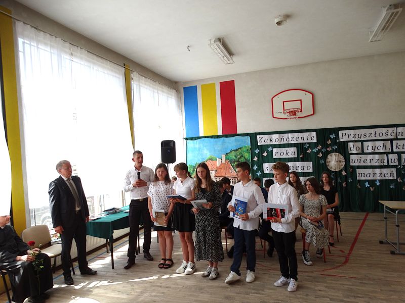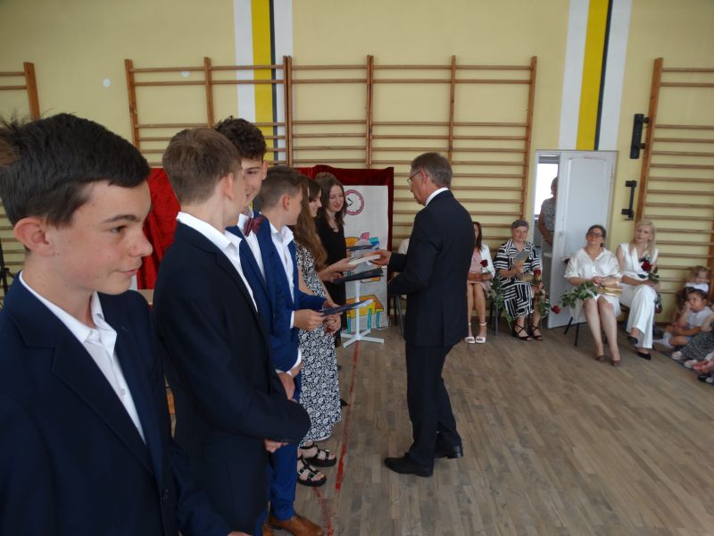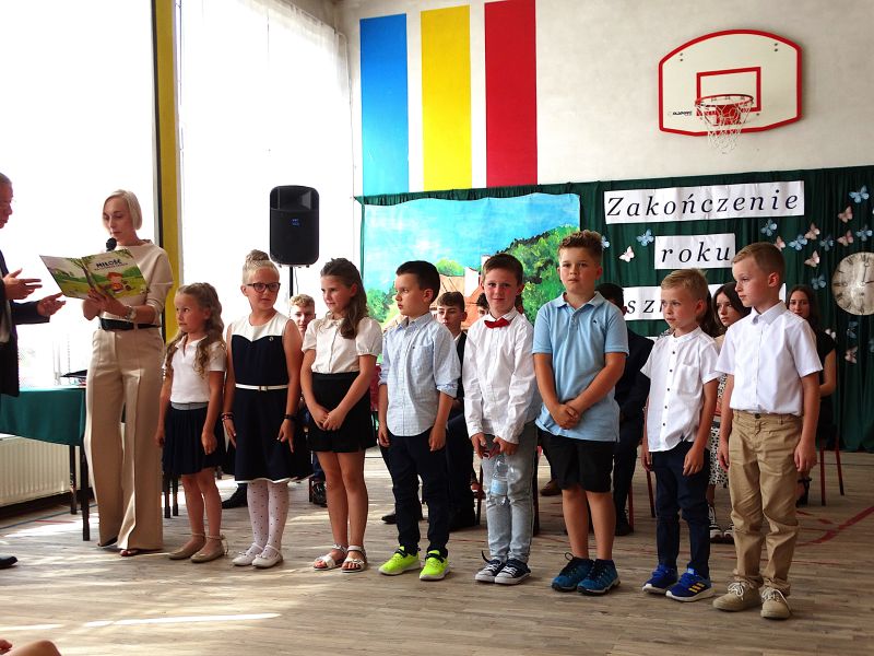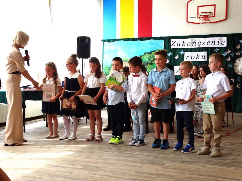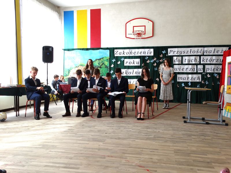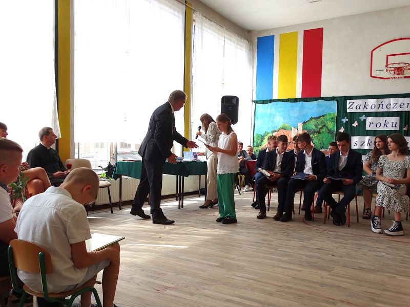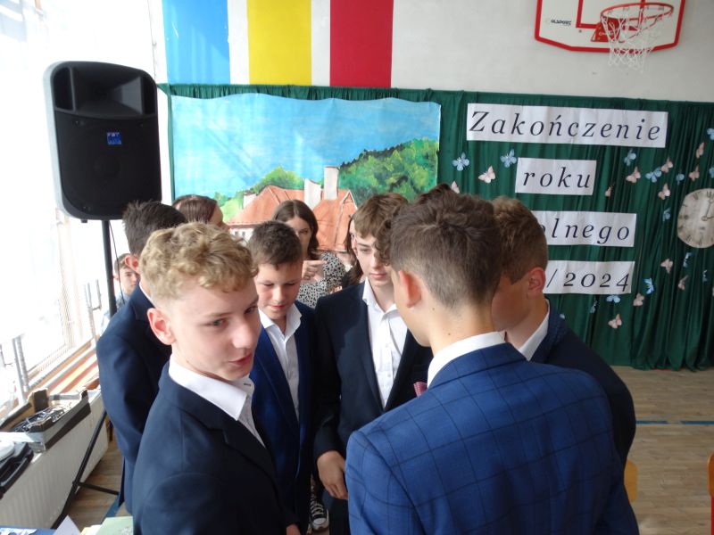 W dniu 21.06.2024r. odbyło się uroczyste zakończenie roku szkolnego 2023/2024. Uroczystość rozpoczęła się od wprowadzenia sztandaru i odśpiewania hymnu. Następnie absolwenci klasy VIII złożyli uroczyste ślubowanie, po którym głos zabrał Pan Dyrektor – Marian Dobosz, nawiązując przede wszystkim do uczniów klasy VIII, przebiegu ich szkolnej kariery. Następnie tegoroczni absolwenci zaprezentowali krótki program artystyczny, po którym nadszedł moment uroczystego wręczenia świadectw i dyplomów absolwentom, listów gratulacyjnych Rodzicom wyróżnionych uczniów, a także specjalnych podziękowań za współpracę. Na zakończenie wychowawca klasy, Pani Anna Janeczek, w krótkiej przemowie podsumowała lata pracy wychowawczej oraz współpracy z Rodzicami.