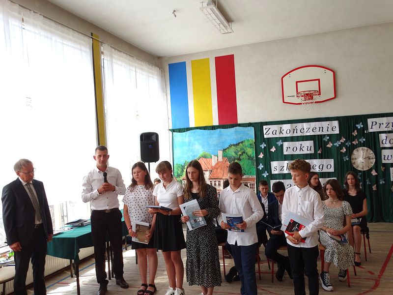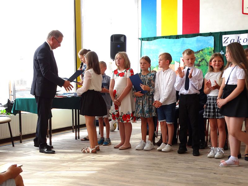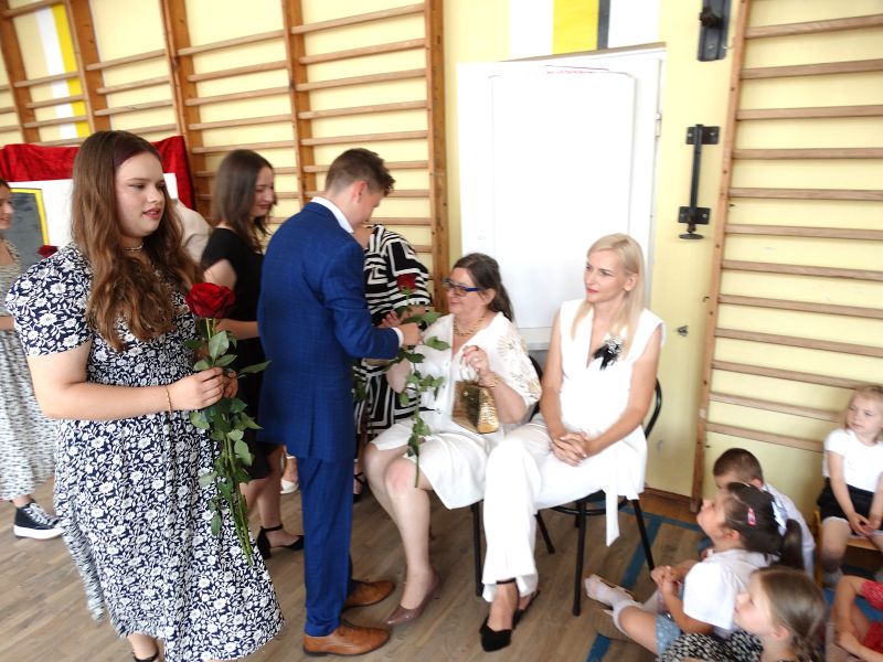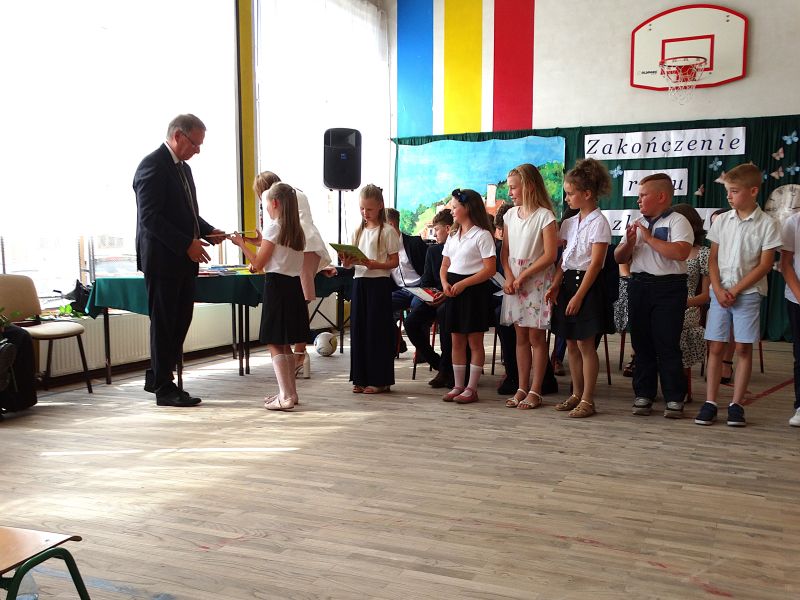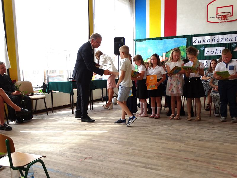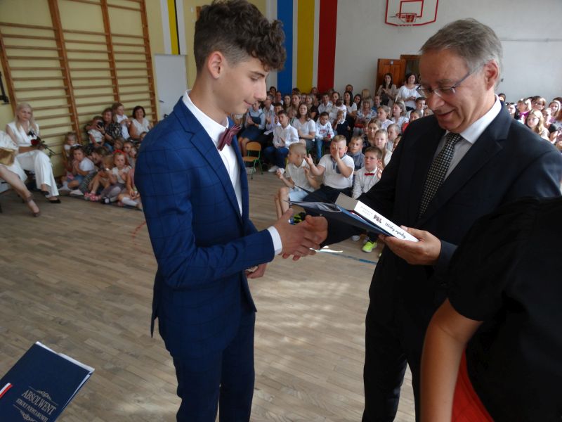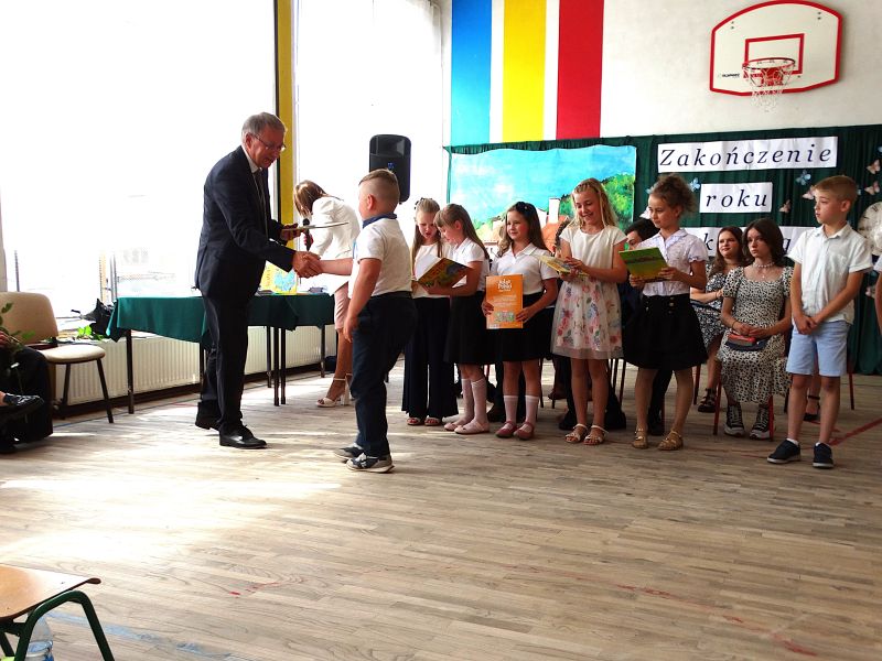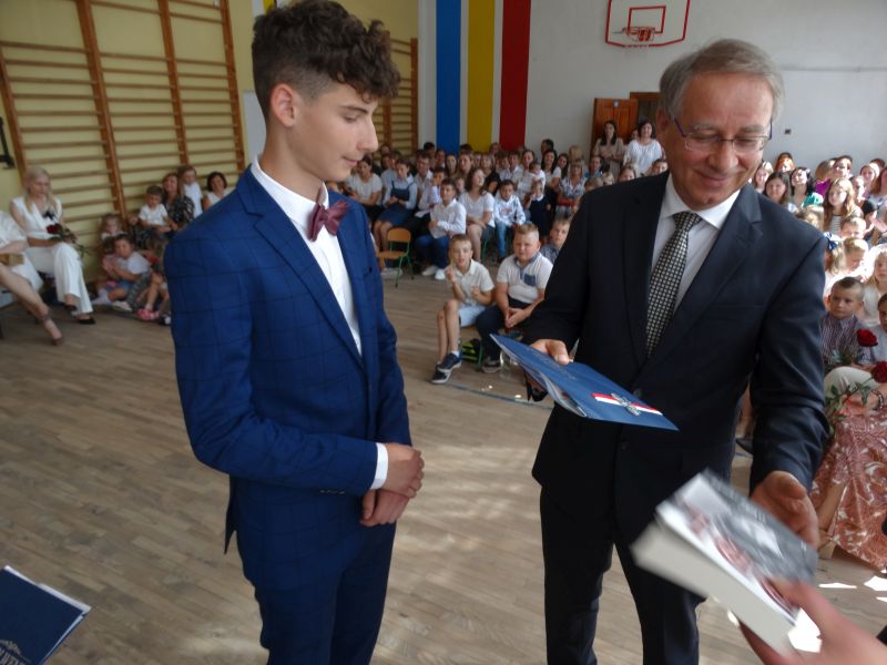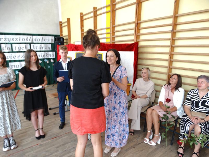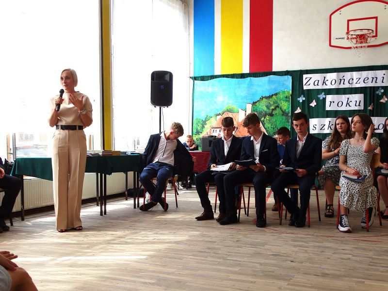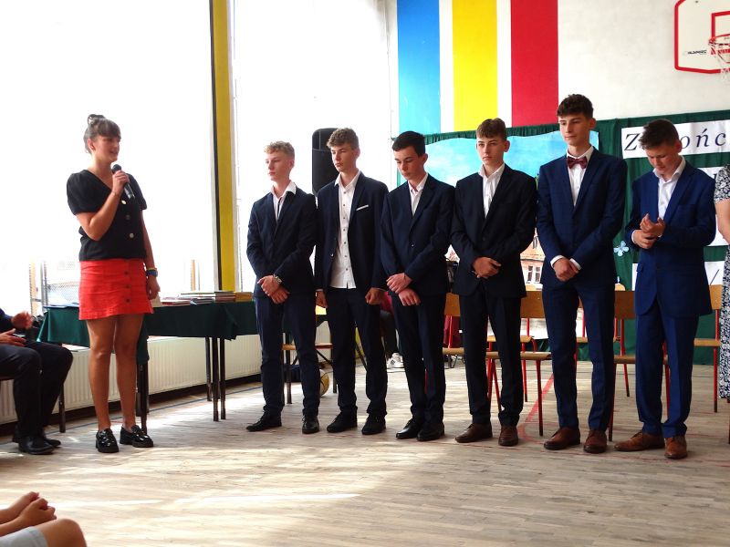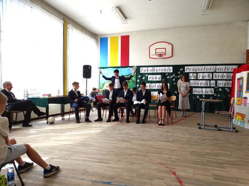 W dniu 21.06.2024r. odbyło się uroczyste zakończenie roku szkolnego 2023/2024. Uroczystość rozpoczęła się od wprowadzenia sztandaru i odśpiewania hymnu. Następnie absolwenci klasy VIII złożyli uroczyste ślubowanie, po którym głos zabrał Pan Dyrektor – Marian Dobosz, nawiązując przede wszystkim do uczniów klasy VIII, przebiegu ich szkolnej kariery. Następnie tegoroczni absolwenci zaprezentowali krótki program artystyczny, po którym nadszedł moment uroczystego wręczenia świadectw i dyplomów absolwentom, listów gratulacyjnych Rodzicom wyróżnionych uczniów, a także specjalnych podziękowań za współpracę. Na zakończenie wychowawca klasy, Pani Anna Janeczek, w krótkiej przemowie podsumowała lata pracy wychowawczej oraz współpracy z Rodzicami.