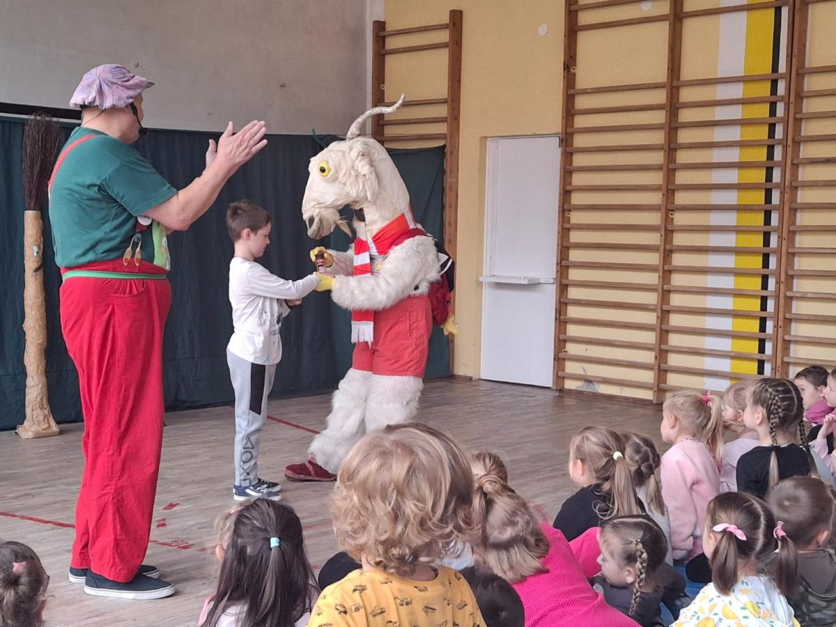 o przygodach Koziołka Matołka na podstawie bajki Kornela Makuszyńskiego. Dzieci miały okazję nie tylko do zapoznania się z historią Koziołka Matołka ale również posłuchania muzyki pochodzącej z bajki i odpowiadania na zagadki związane z przysłowiami o kozach. Niektóre dzieci, a także wychowawczynie grup mogły odpowiadać na pytania dotyczące twórczości Kornela Makuszyńskiego, za co każdy został nagrodzony gromkimi brawami oraz stosowną pieczątką „Klubu Koziołka Matołka”. Ponadto starsze dzieci uczestniczyły w symbolicznym podkuwaniu bohatera przedstawienia otrzymując do tego zadania odpowiednie rekwizyty. Na zakończenie wszyscy uczestnicy otrzymali wspomniane pieczątki, tym samym dołączając do „Klubu Koziołka Matołka”. Dziękujemy za mile spędzony czas i przybliżenie nam postaci bohatera bajki z dawnych lat.