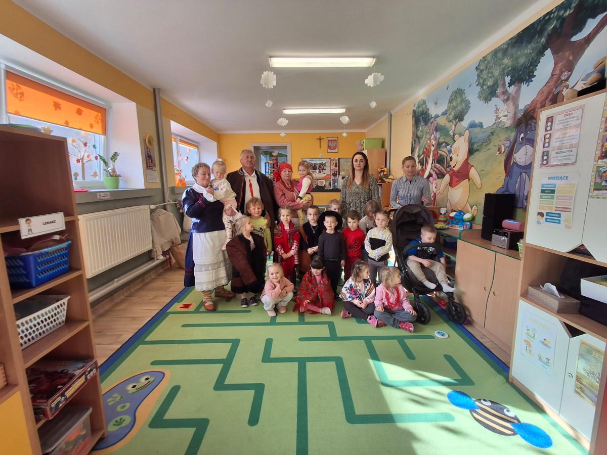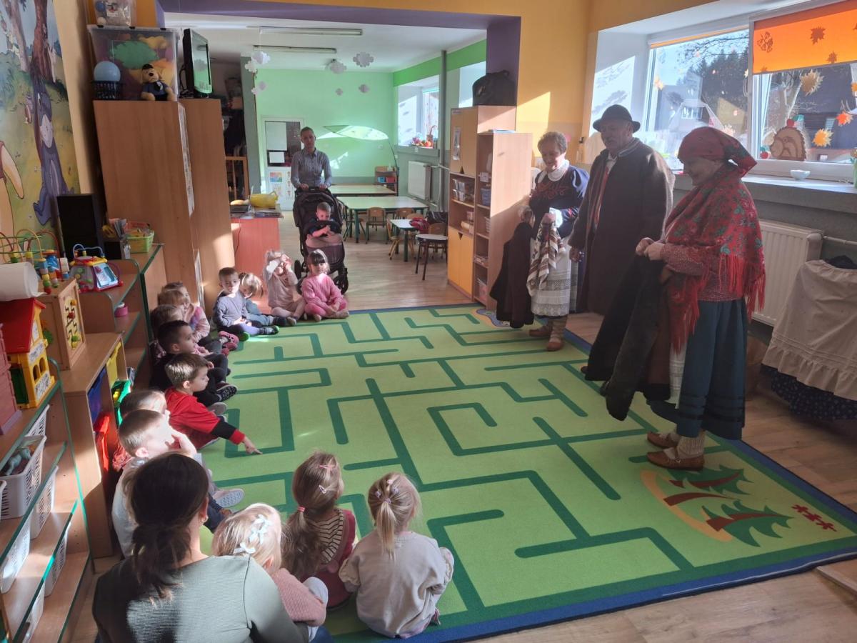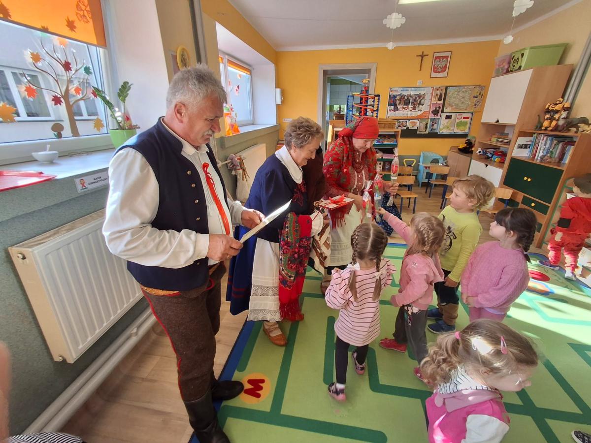 Dnia 07.11.2024 r. przedszkolaki z Oddziału Przedszkolnego miały zaszczyt gościć członków zespołu regionalnego „Dolina Popradu”. W tym dniu w naszym przedszkolu zjawili się pani Helena i Stanisław Źrałka oraz pani Maria Malik. Członkowie zespołu omówili