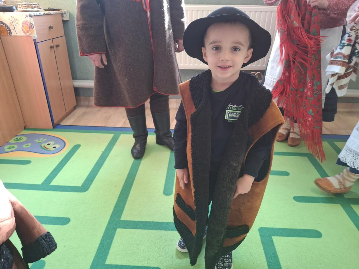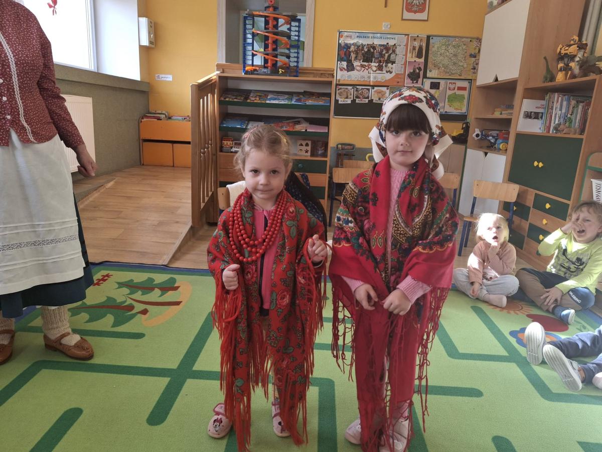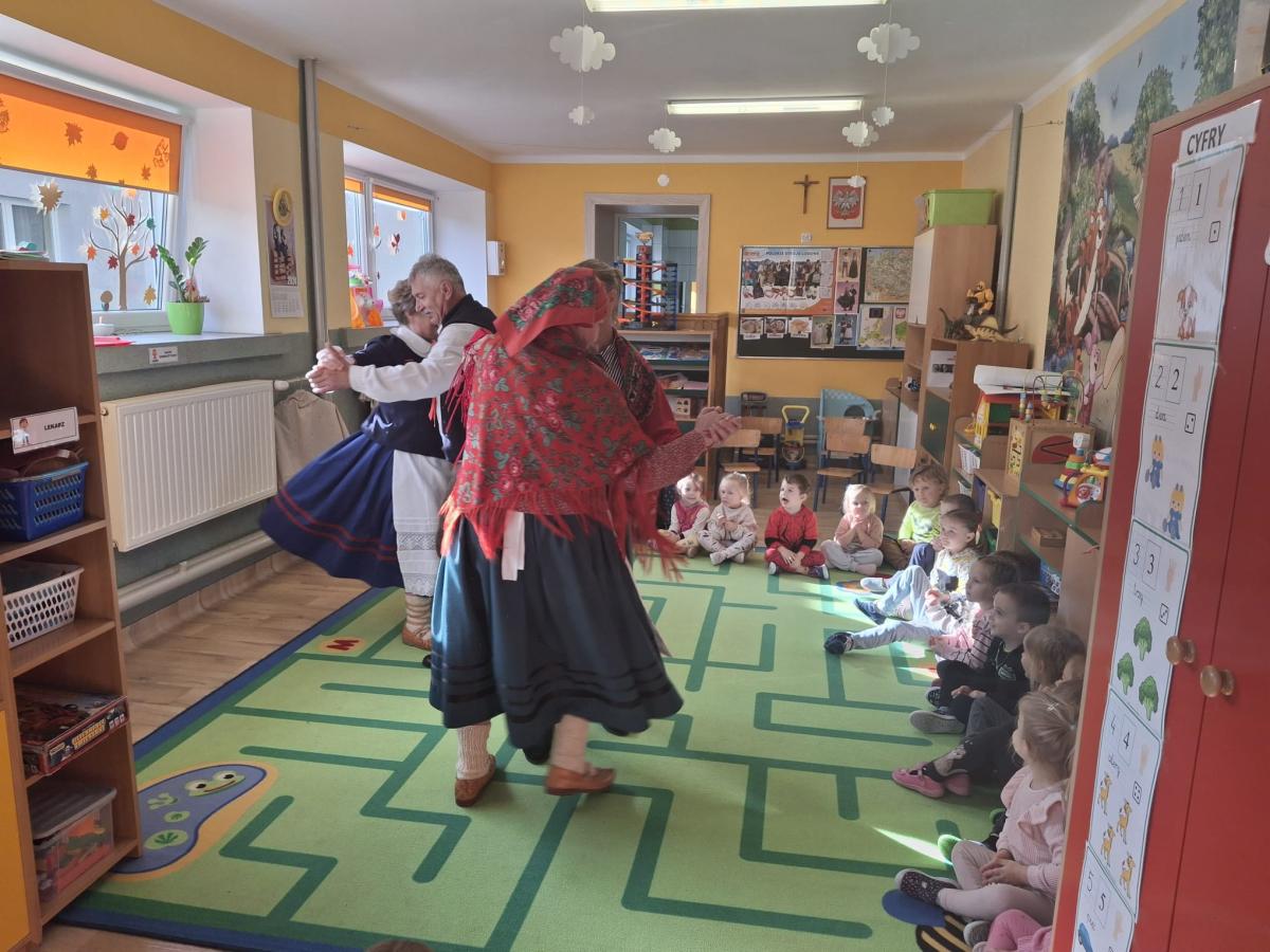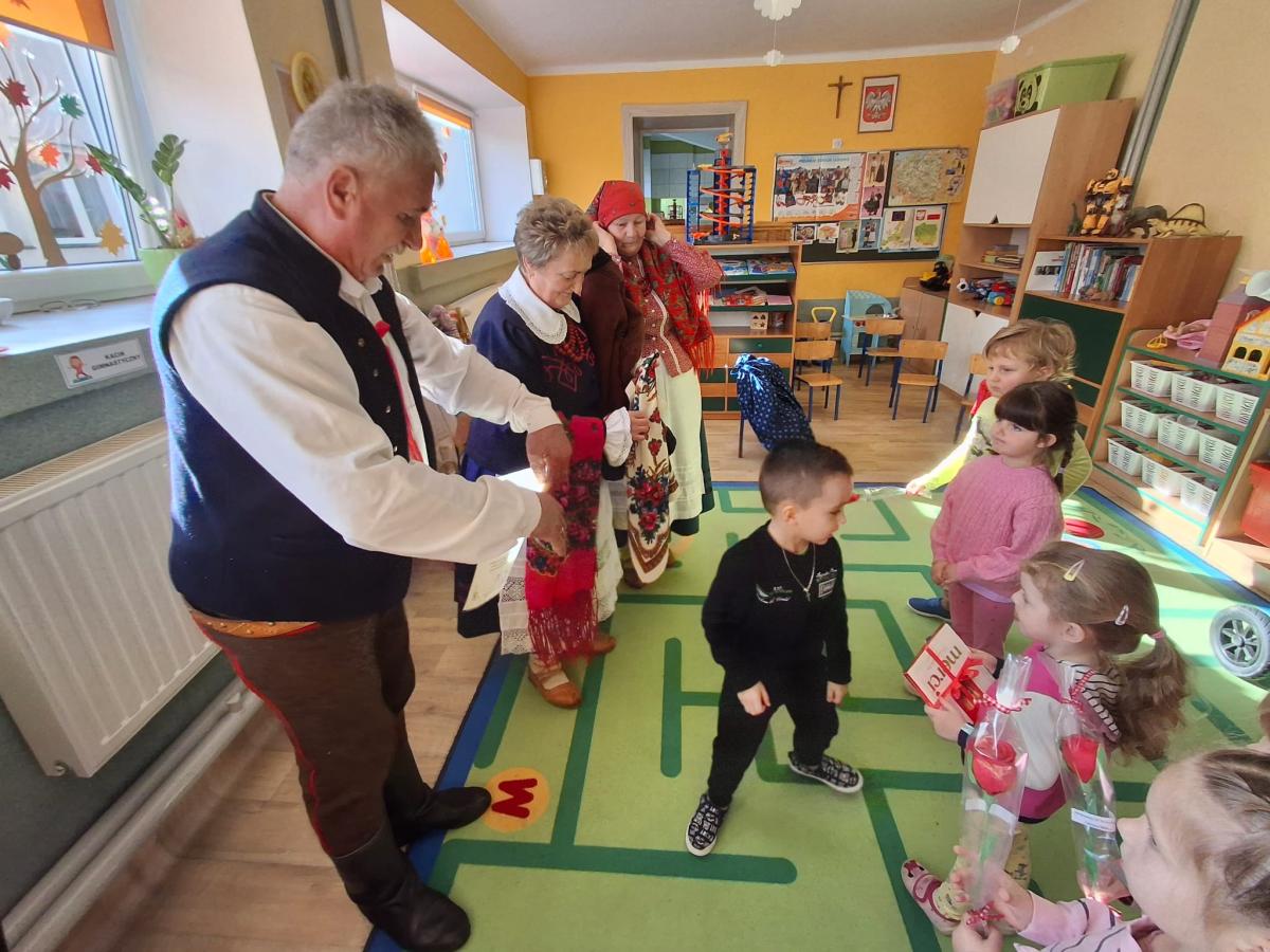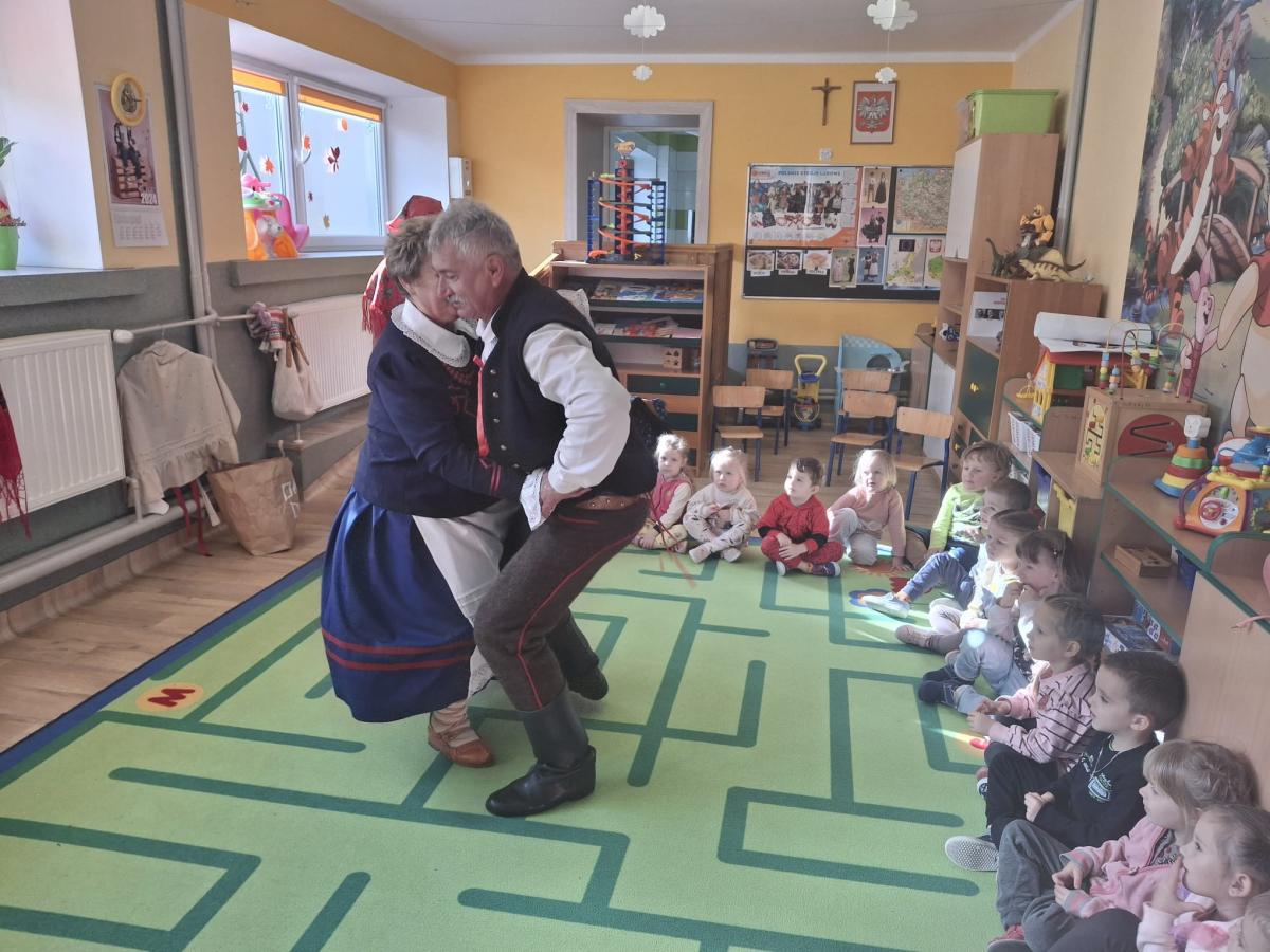 i zaprezentowali strój kobiecy i męski czarnych górali ich nazewnictwo, a także wyjaśnili znaczenie niektórych wyrażeń gwarowych. Dzieci w skupieniu słuchały pana Stanisława Źrałki, który w ciekawy sposób potrafił przekazać wiadomości o nadpopradzkich góralach. Przedszkolaki miały także możliwość przymierzenia elementów stroju. Czekała na nas także atrakcja w postaci możliwości zatańczenia tańca „Wściekło polka” oraz „Zamiatany”, obydwoma tańcami dzieci były zachwycone, co wyrażały poprzez śmiech i wesołe pląsy do muzyki. Na zakończenie przedszkolaki wręczyły gościom pamiątkowy dyplom oraz róże