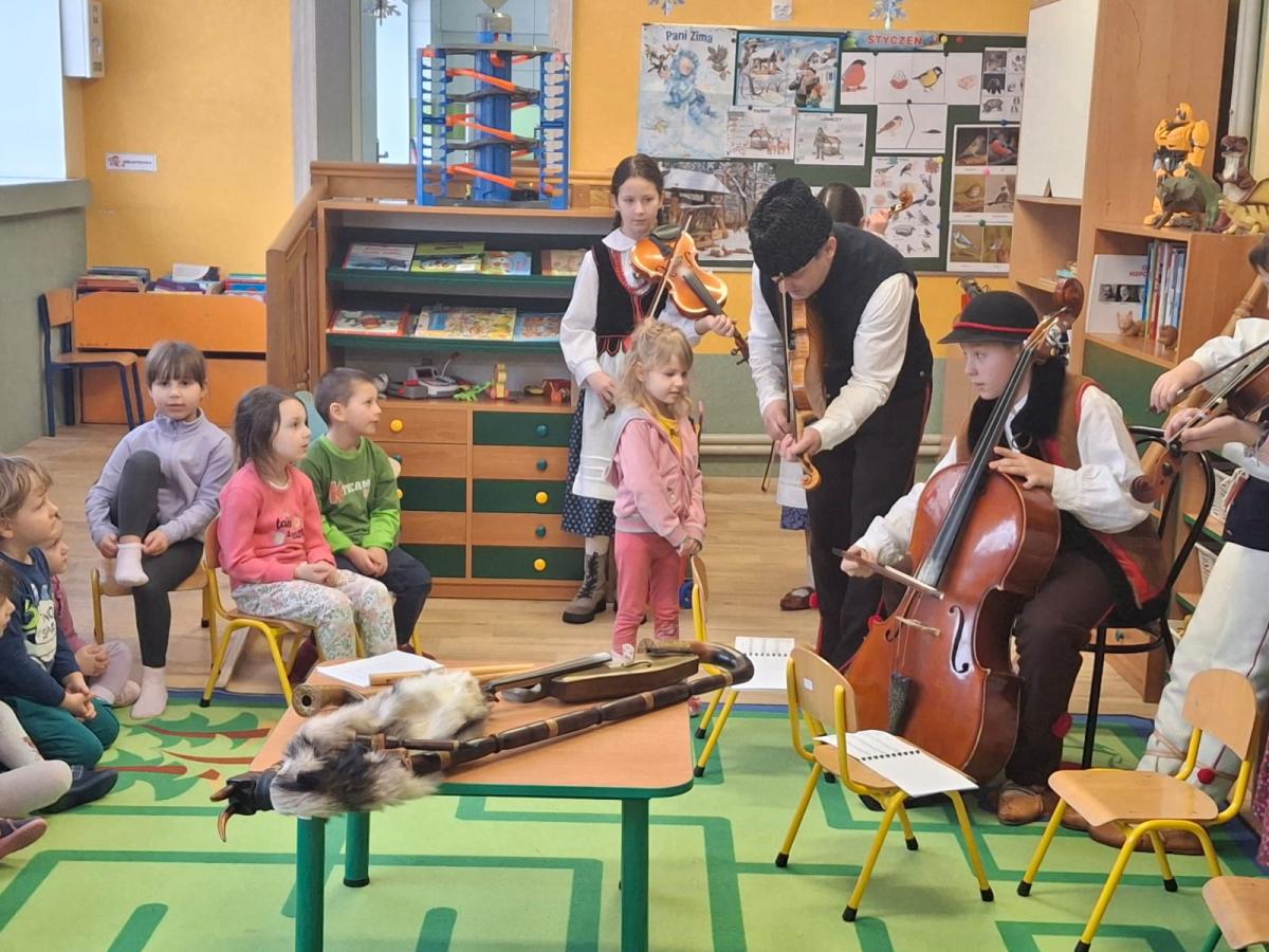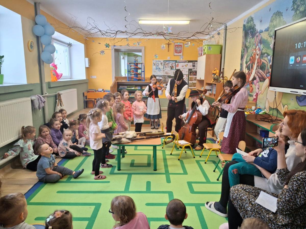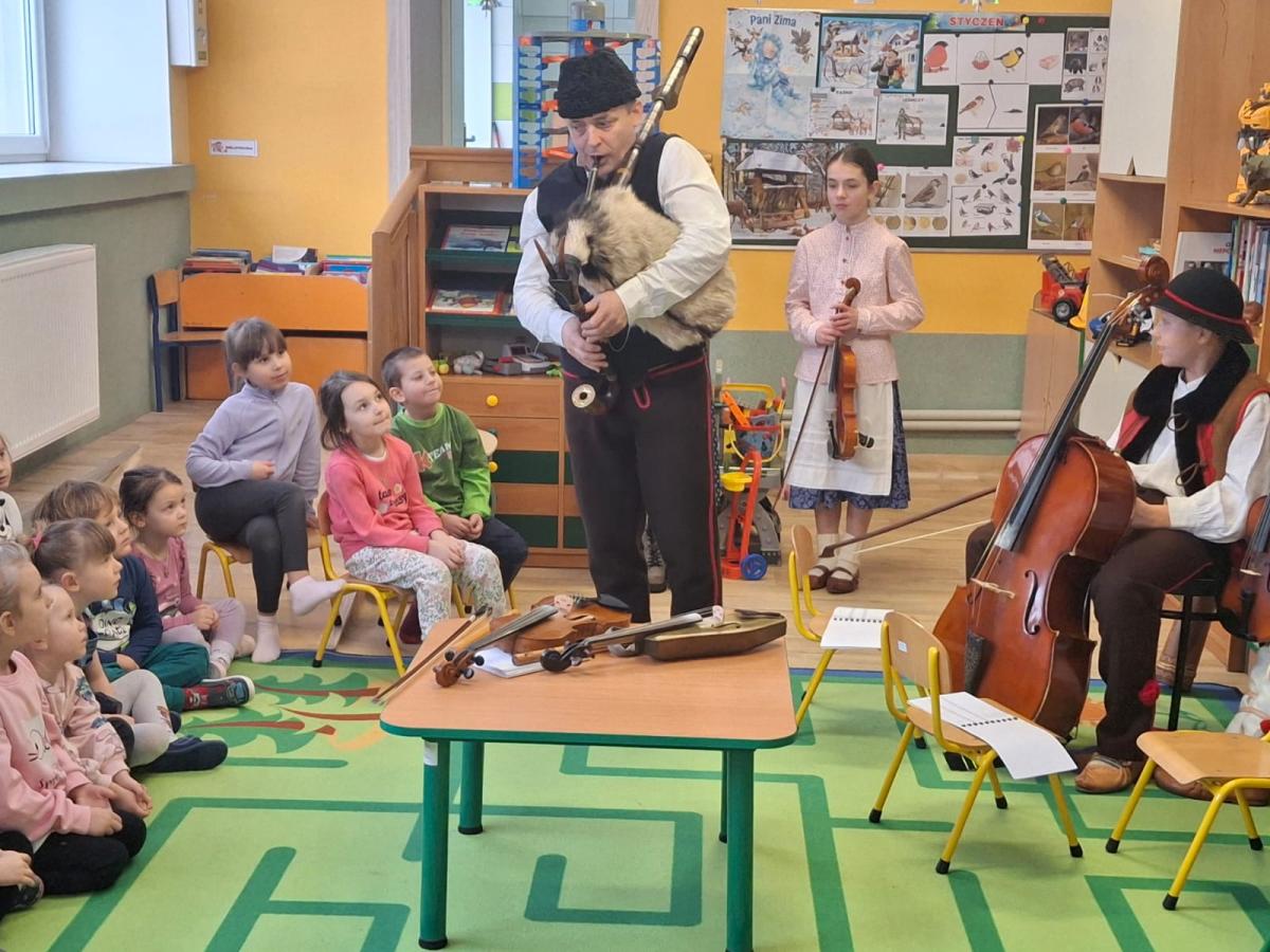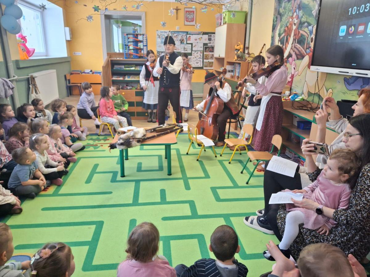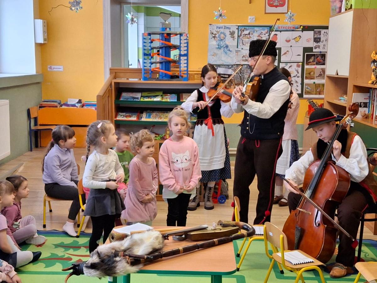 i starsza, mogły zobaczyć i usłyszeć różne instrumenty muzyczne powszechne kiedyś w naszym regionie, a były to piszczałki, dudy, trąbita, basy oraz „gęśle”. Dzieci z zaciekawieniem oglądały i słuchały brzmień instrumentów. Następnie nadszedł czas na kolędowanie. Wspólne kolędowanie buduje więź, uczucie bliskości, jest też przejawem poszanowania naszych polskich tradycji. Sala przedszkolna rozbrzmiewała dźwiękami najpiękniejszych kolęd