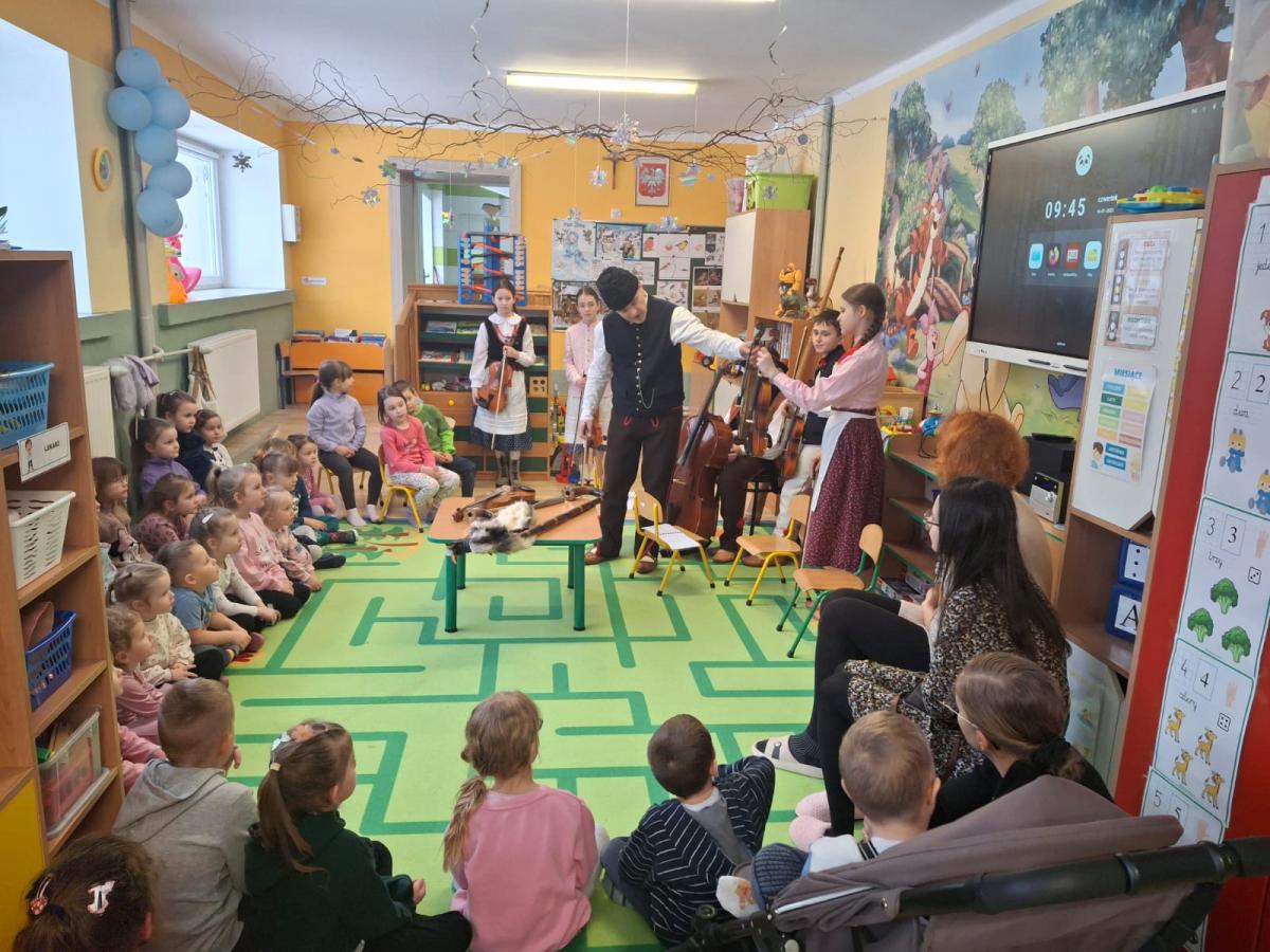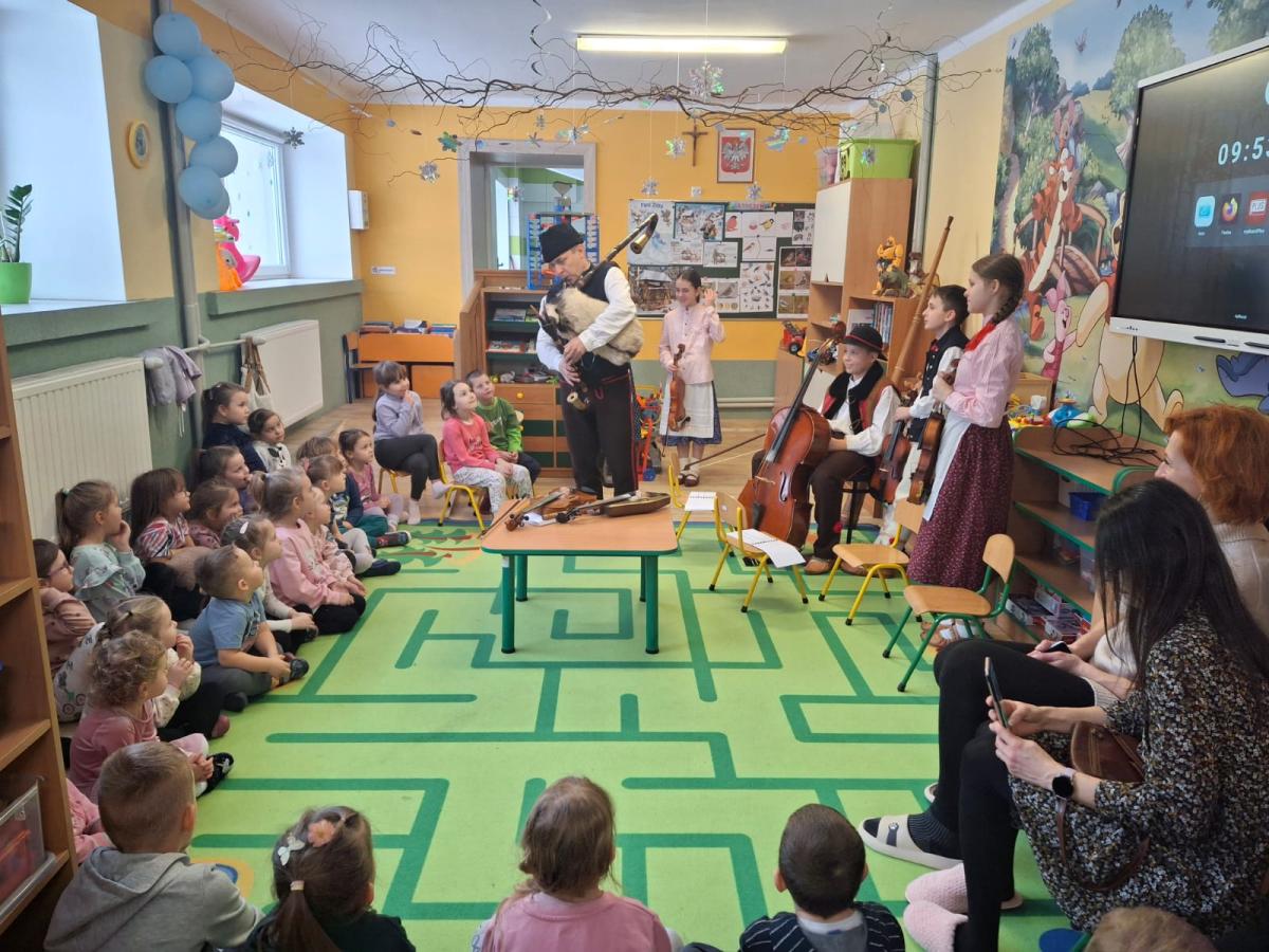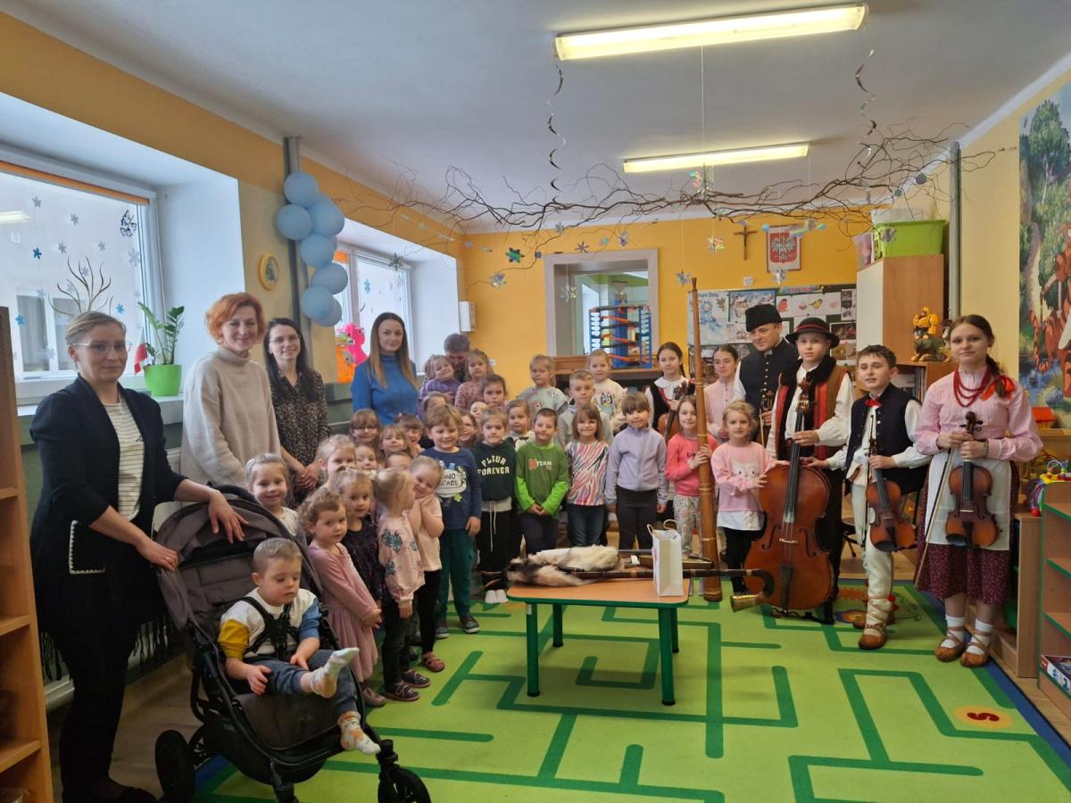 Dnia 16.01.2025 r. w przedszkolu odbyło się kolędowanie przy akompaniamencie muzyka i etnografa p. Piotra Kuliga oraz kapeli „Rytrzoki”. W tym dniu towarzyszyły nam również mamy niektórych przedszkolaków. Dzieci z oddziału przedszkolnego grupa młodsza