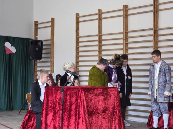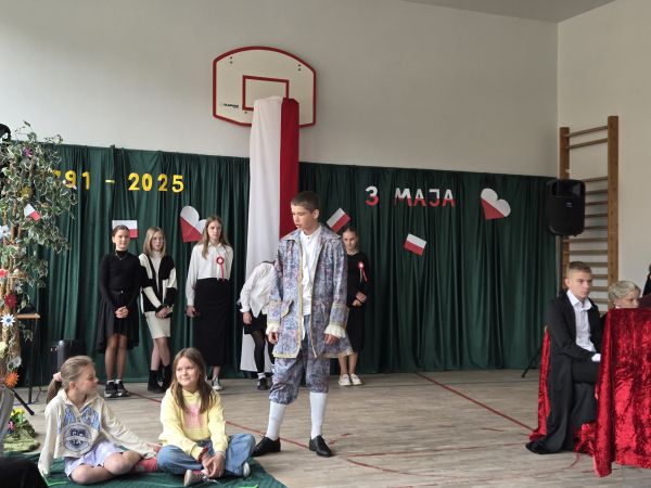 Uczniowie zaprezentowali spektakl, którego akcja rozgrywała się w dwóch płaszczyznach czasowych: współcześnie oraz w XVIII wieku. Przypomnieli społeczności szkolnej najważniejsze zdarzenia, poprzedzające uchwalenie pierwszej w Europie, a drugiej na świecie, po Stanach Zjednoczonych, konstytucji, a także sam moment jej zatwierdzenia. Dzięki temu przedstawieniu mogliśmy poznać najwybitniejszych ludzi tej epoki, decydujących o losach państwa, wśród nich ostatniego króla Polski Stanisława Augusta Poniatowskiego.