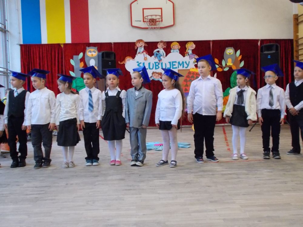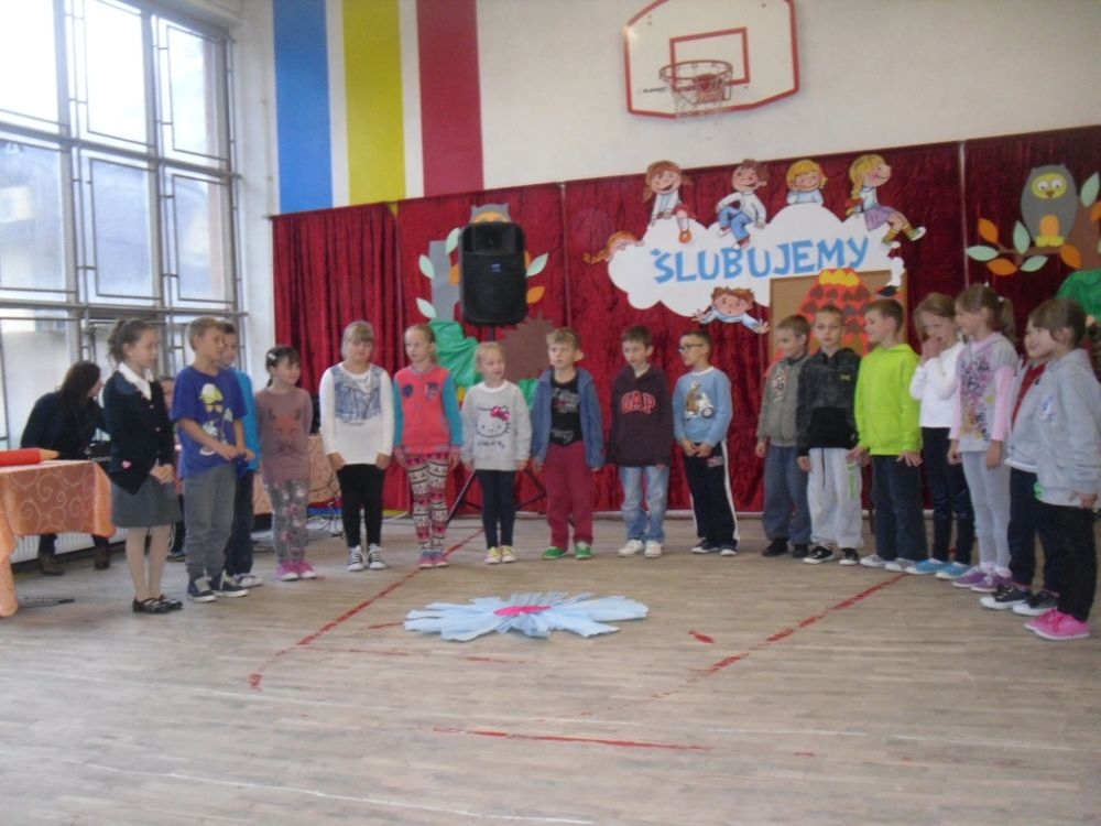 W podniosłej atmosferze, przed sztandarem pierwszoklasiści ślubowali starać się być dobrymi i uczciwymi, strzec honoru i dobrego imienia szkoły, szanować swoich rodziców, nauczycieli i kolegów, uczyć się tego, co dobre i piękne, kochać swoją Ojczyznę, a swoją nauką i zachowaniem sprawiać radość rodzicom i nauczycielom. Po złożeniu ślubowania odbyło się symboliczne pasowanie na uczniów.
