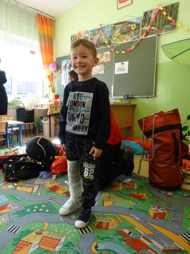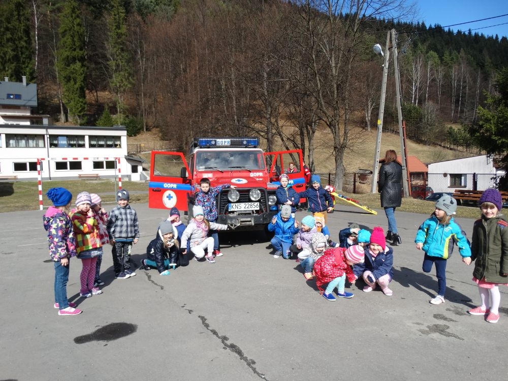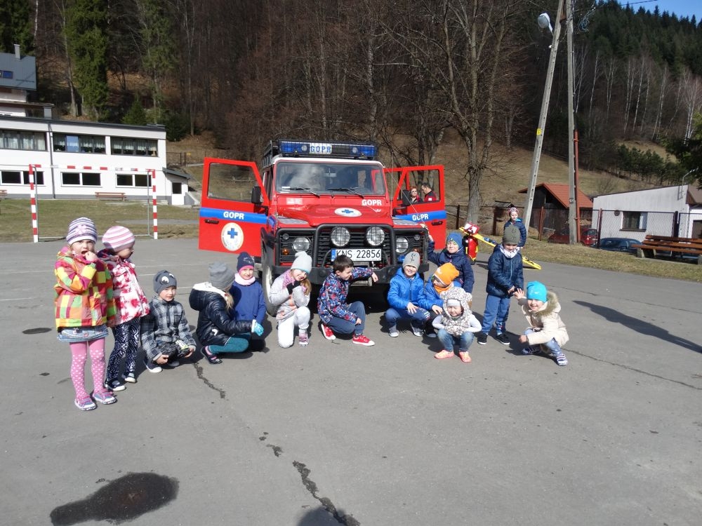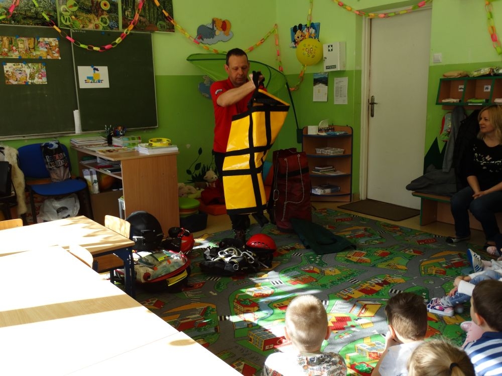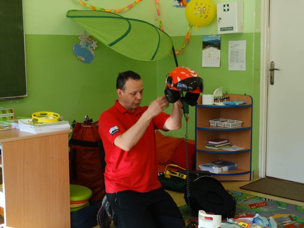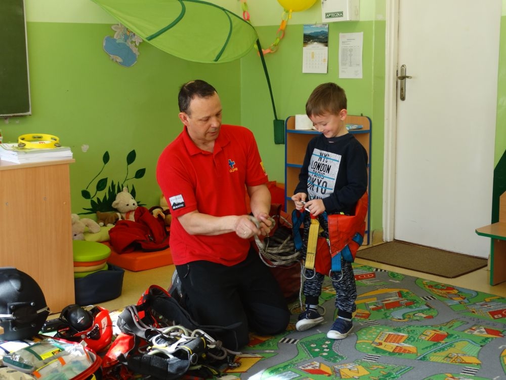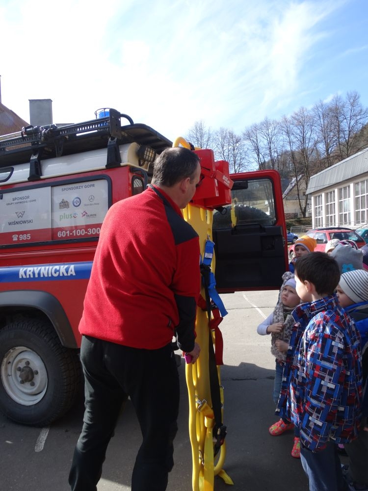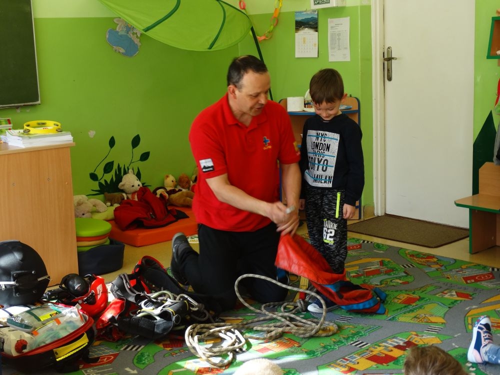 7 marca mieliśmy przyjemność gościć w przedszkolu ratownika Górskiego Ochotniczego Pogotowia Ratunkowego, pana Macieja Maślanką. Na spotkanie przybyły również dzieci z oddziału „0” oraz klasy pierwszej wraz z wychowawczyniami. Pan Maciej opowiedział o zadaniach ratownika, niebezpieczeństwach i różnych sytuacjach jakie mogą się pojawić podczas akcji ratunkowej. Zaprezentowany specjalistyczny sprzęt ratunkowy zrobił ogromne wrażenie na zebranych słuchaczach. Wszyscy dostali cenną lekcję jak się należy zachować w razie wypadku w górach i jak należy wezwać pomoc.