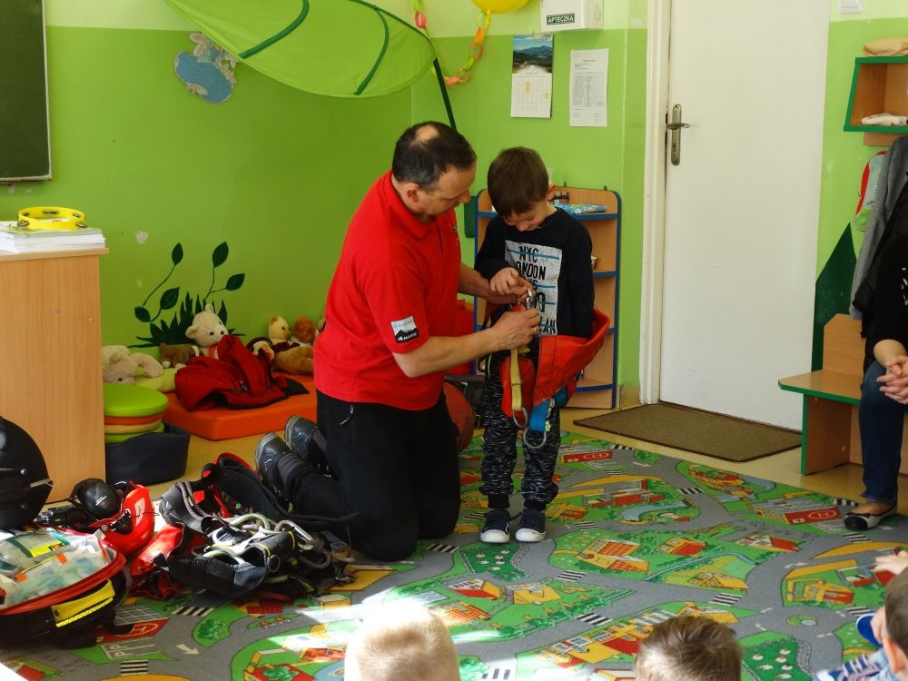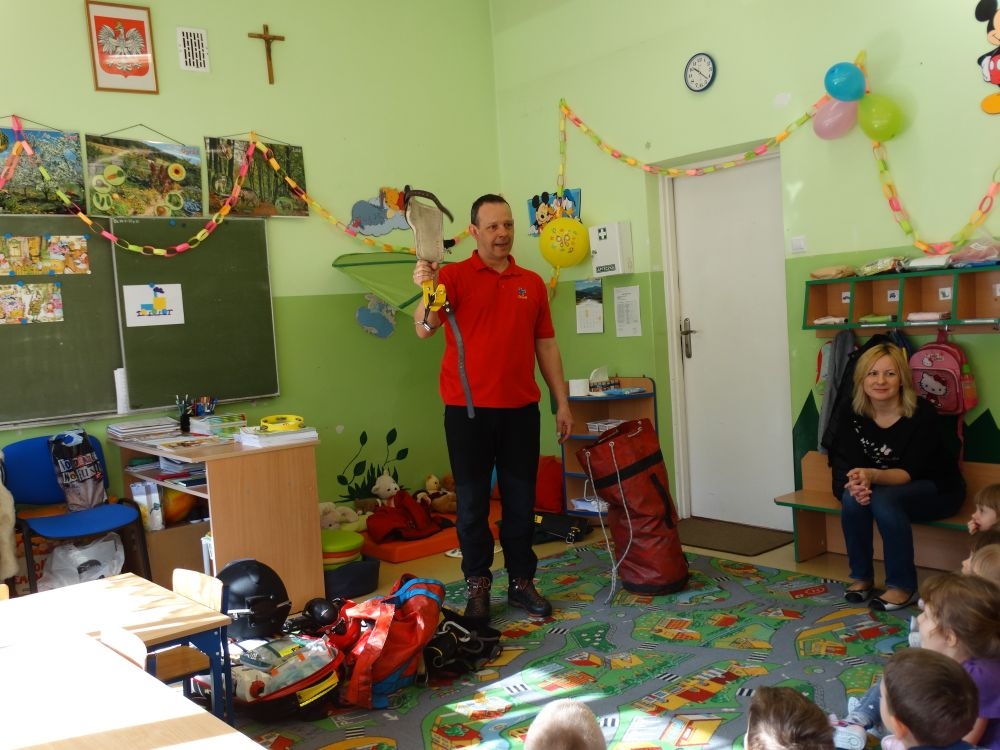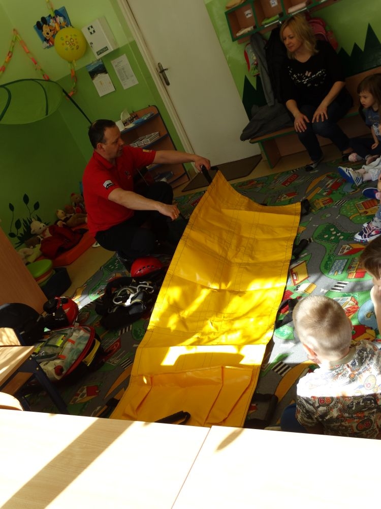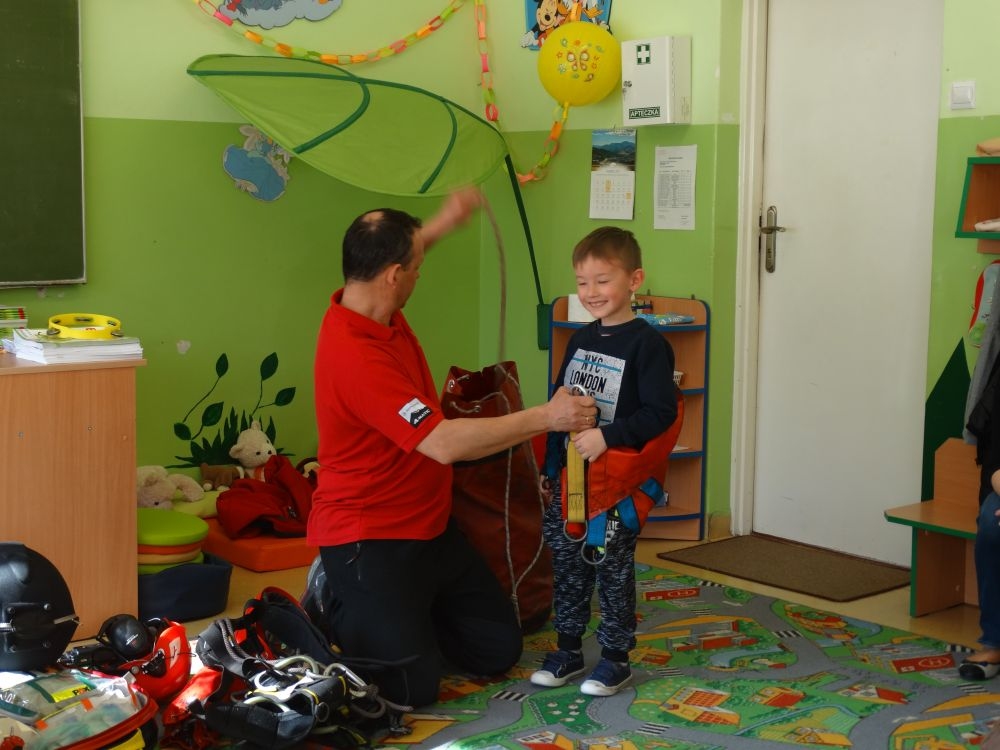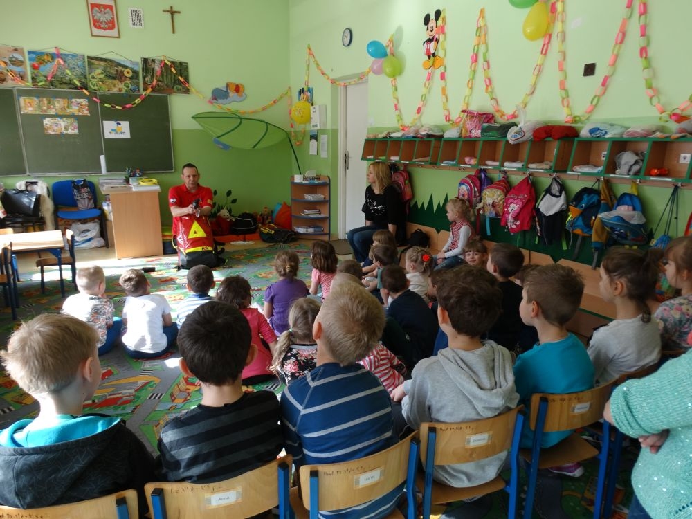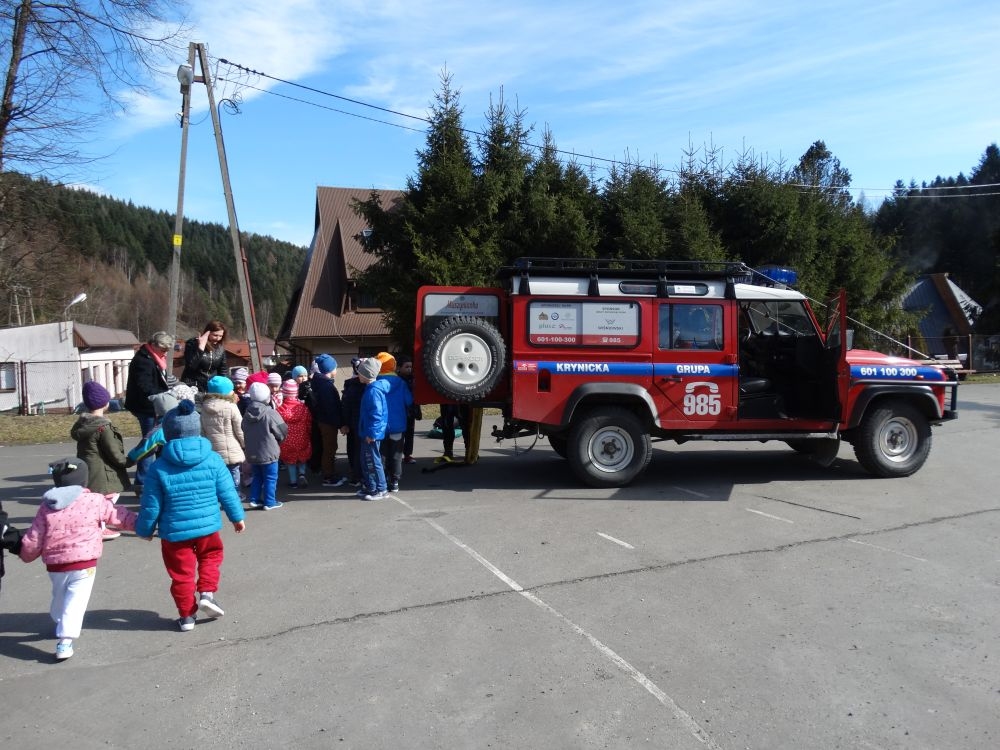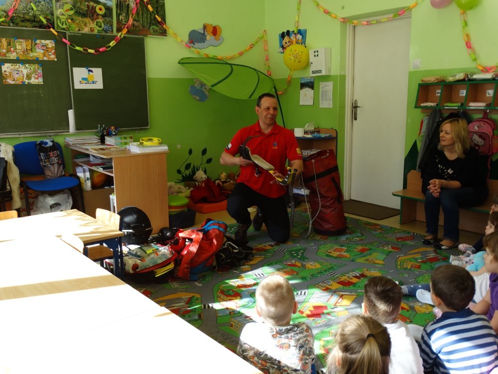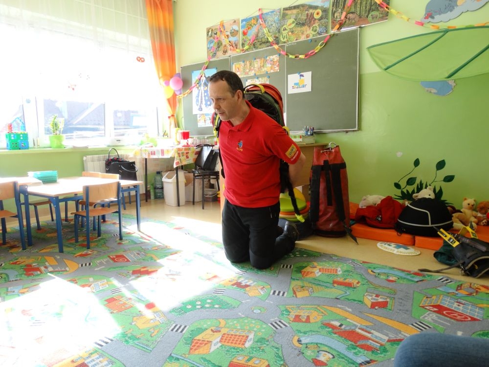 7 marca mieliśmy przyjemność gościć w przedszkolu ratownika Górskiego Ochotniczego Pogotowia Ratunkowego, pana Macieja Maślanką. Na spotkanie przybyły również dzieci z oddziału „0” oraz klasy pierwszej wraz z wychowawczyniami. Pan Maciej opowiedział o zadaniach ratownika, niebezpieczeństwach i różnych sytuacjach jakie mogą się pojawić podczas akcji ratunkowej. Zaprezentowany specjalistyczny sprzęt ratunkowy zrobił ogromne wrażenie na zebranych słuchaczach. Wszyscy dostali cenną lekcję jak się należy zachować w razie wypadku w górach i jak należy wezwać pomoc.