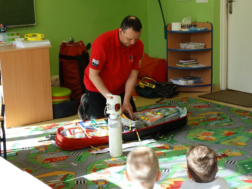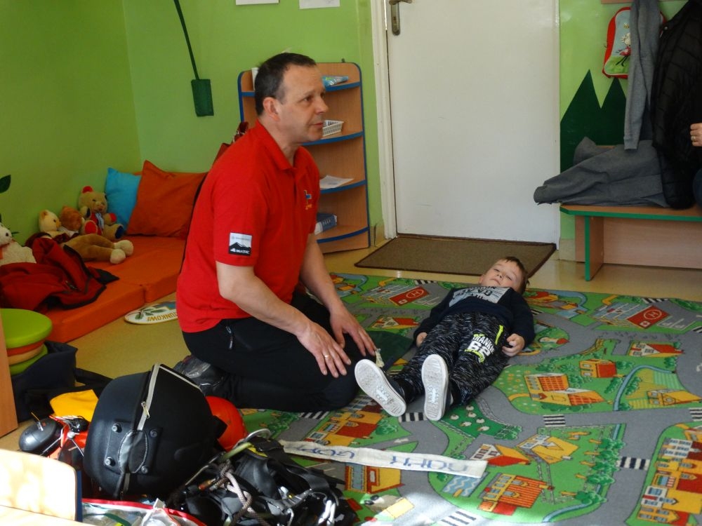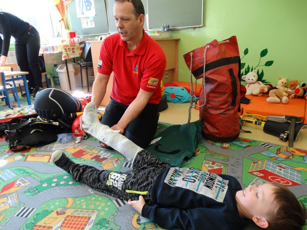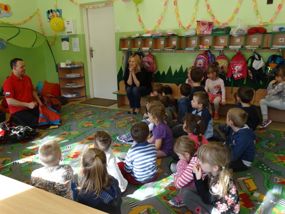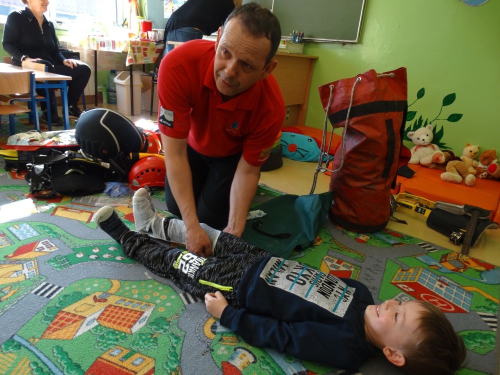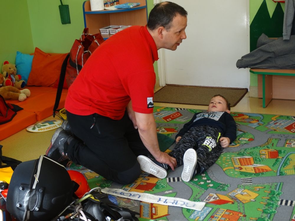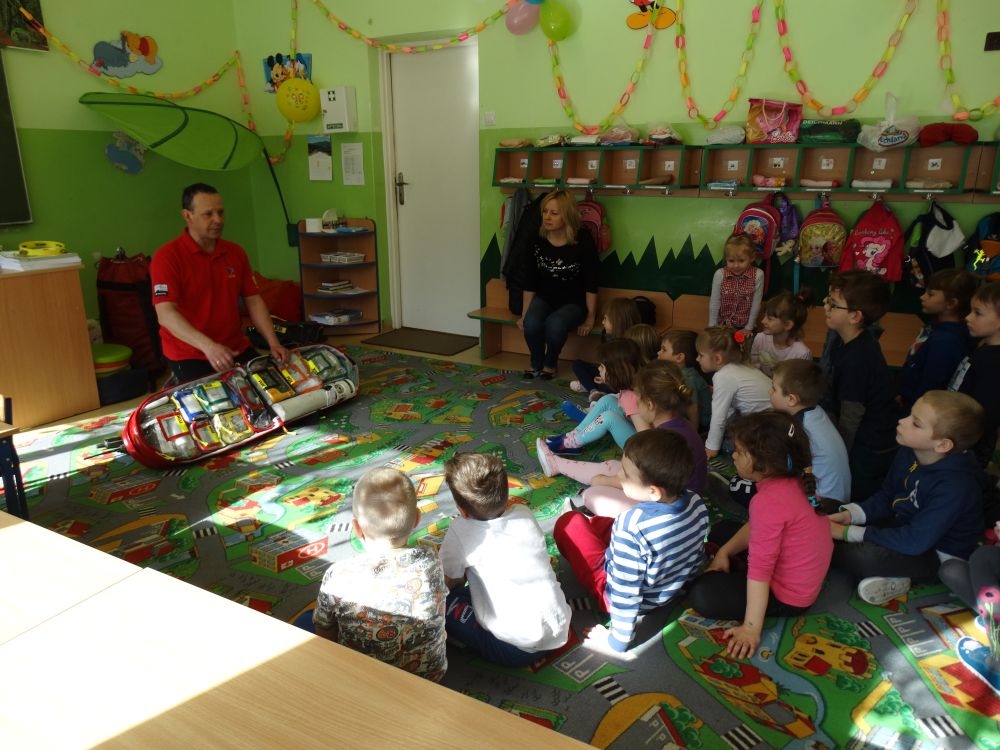 7 marca mieliśmy przyjemność gościć w przedszkolu ratownika Górskiego Ochotniczego Pogotowia Ratunkowego, pana Macieja Maślanką. Na spotkanie przybyły również dzieci z oddziału „0” oraz klasy pierwszej wraz z wychowawczyniami. Pan Maciej opowiedział o zadaniach ratownika, niebezpieczeństwach i różnych sytuacjach jakie mogą się pojawić podczas akcji ratunkowej. Zaprezentowany specjalistyczny sprzęt ratunkowy zrobił ogromne wrażenie na zebranych słuchaczach. Wszyscy dostali cenną lekcję jak się należy zachować w razie wypadku w górach i jak należy wezwać pomoc.