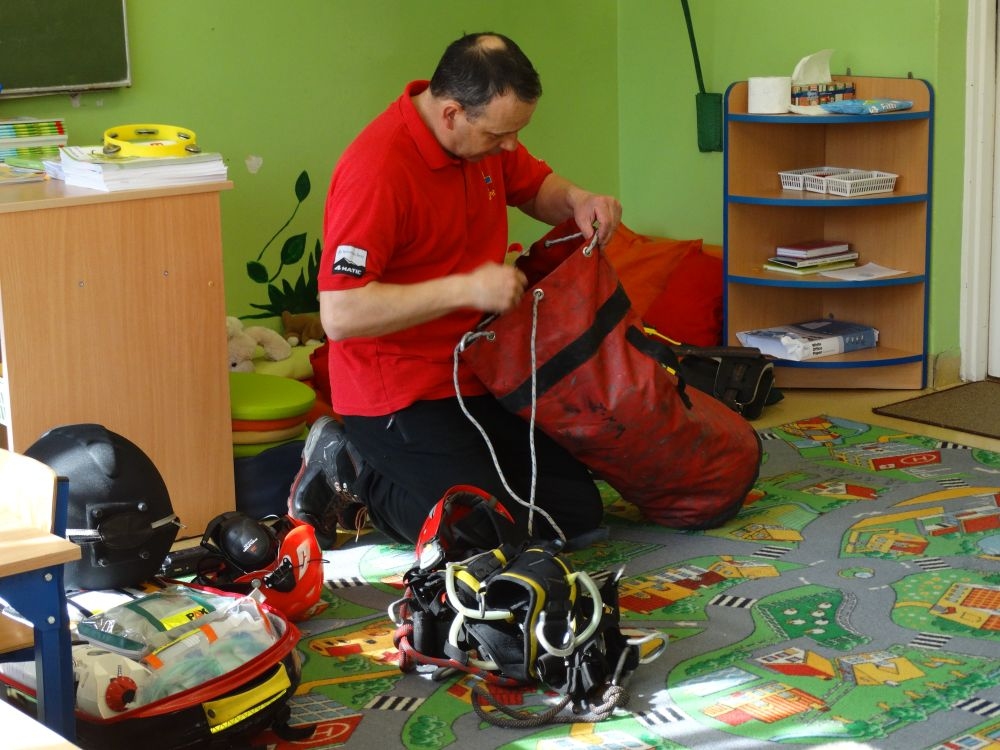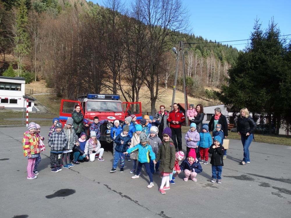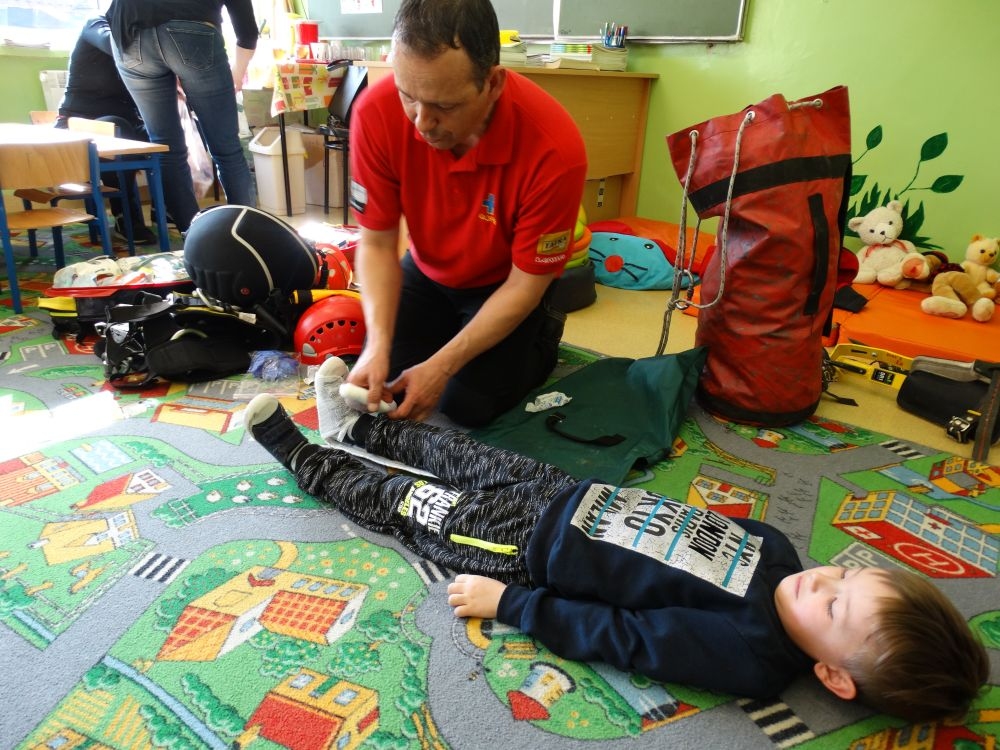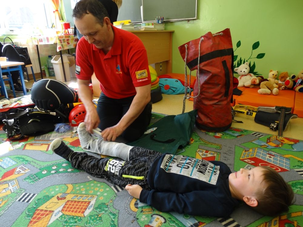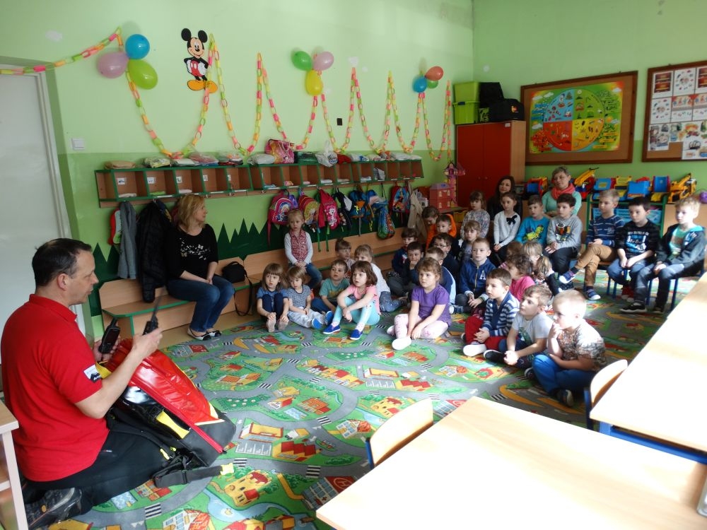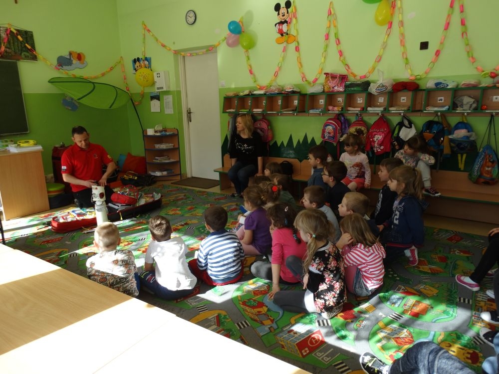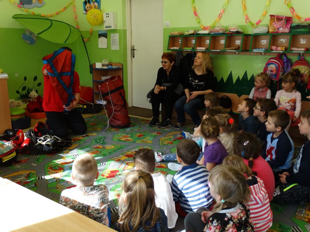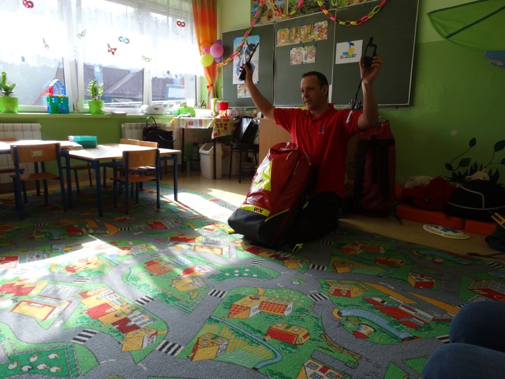 7 marca mieliśmy przyjemność gościć w przedszkolu ratownika Górskiego Ochotniczego Pogotowia Ratunkowego, pana Macieja Maślanką. Na spotkanie przybyły również dzieci z oddziału „0” oraz klasy pierwszej wraz z wychowawczyniami. Pan Maciej opowiedział o zadaniach ratownika, niebezpieczeństwach i różnych sytuacjach jakie mogą się pojawić podczas akcji ratunkowej. Zaprezentowany specjalistyczny sprzęt ratunkowy zrobił ogromne wrażenie na zebranych słuchaczach. Wszyscy dostali cenną lekcję jak się należy zachować w razie wypadku w górach i jak należy wezwać pomoc.
