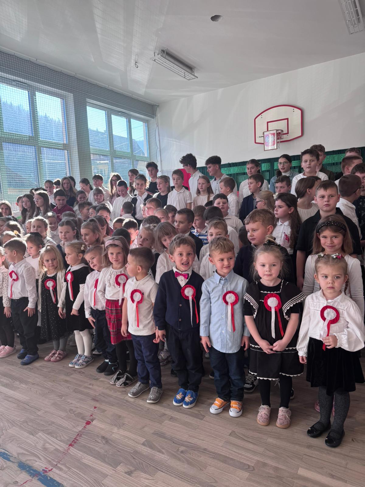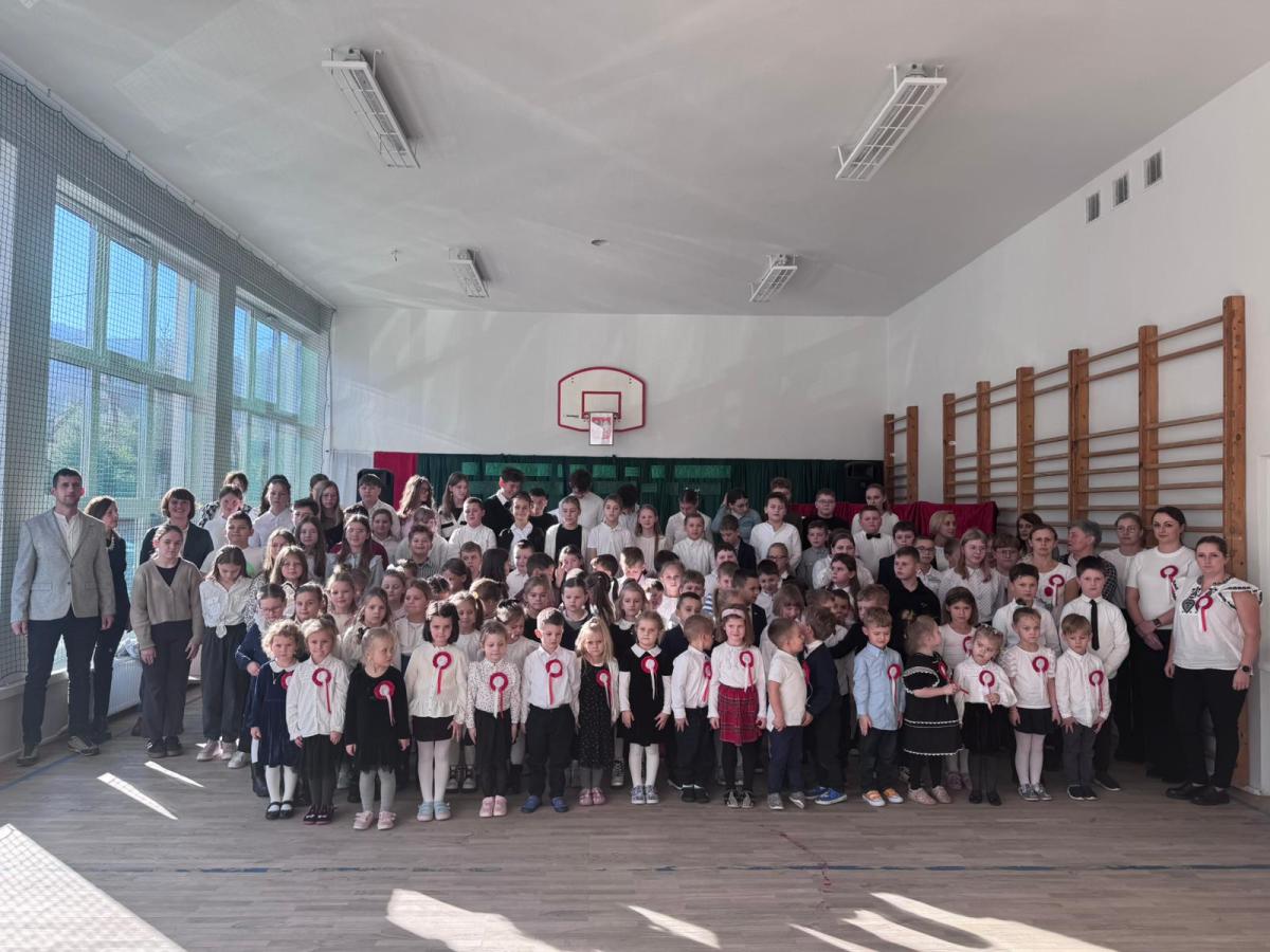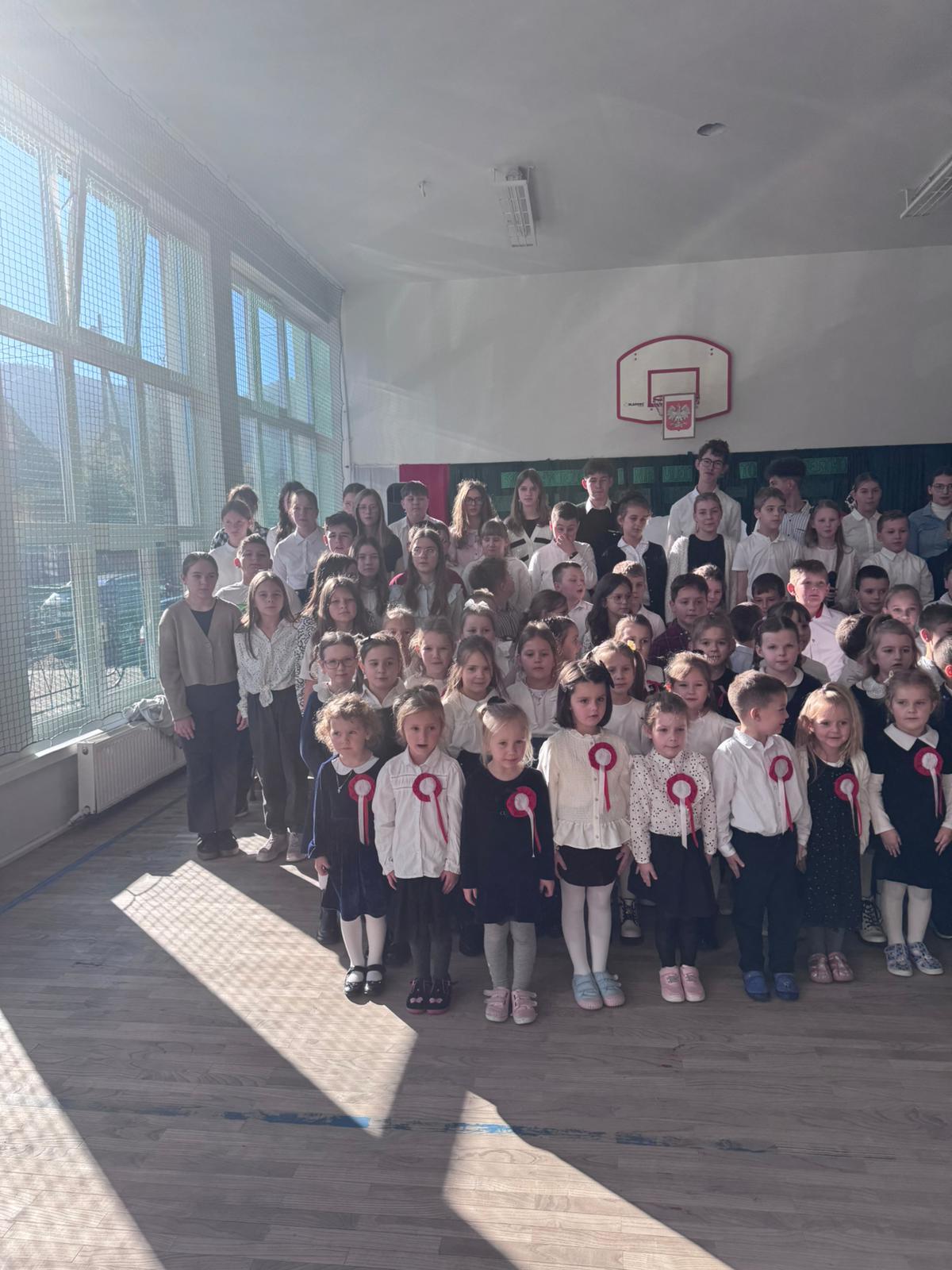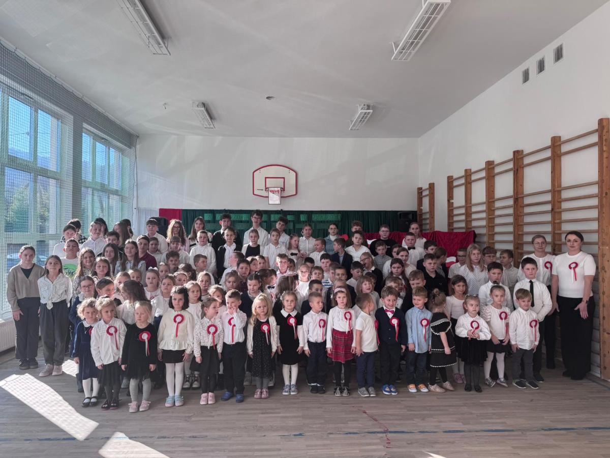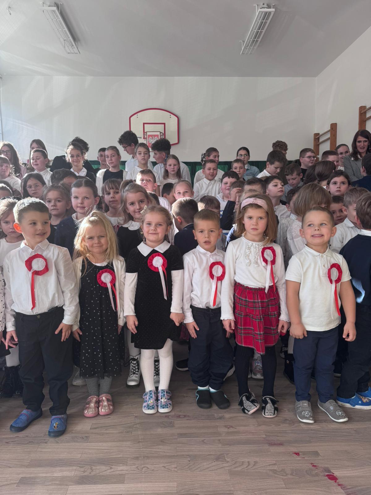 W piątek, 7 listopada 2025 roku, nasza szkoła po raz kolejny włączyła się w ogólnopolską akcję „Szkoła do hymnu”, organizowaną przez Ministerstwo Edukacji Narodowej z okazji Narodowego Święta Niepodległości. Celem inicjatywy jest wspólne odśpiewanie „Mazurka Dąbrowskiego” przez uczniów i nauczycieli w całej Polsce, jako symbol jedności, patriotyzmu i szacunku do historii naszego kraju. Punktualnie o godzinie 11:11 cała społeczność szkolna zebrała się w sali gimnastycznej, by wspólnie zaśpiewać hymn państwowy. Uczniowie i nauczyciele wystąpili w strojach galowych, a wielu z nich przypięło biało-czerwone kotyliony, podkreślające charakter uroczystości. Udział w akcji „Szkoła do hymnu” był dla nas nie tylko formą upamiętnienia ważnego wydarzenia historycznego, ale także okazją do wspólnego przeżywania radości z faktu, że możemy żyć w wolnej i niepodległej Polsce. Takie inicjatywy uczą młode pokolenie szacunku do symboli narodowych, rozwijają postawy patriotyczne i umacniają więź z ojczyzną. Jesteśmy dumni, że nasza szkoła mogła wziąć udział w tej pięknej, ogólnopolskiej inicjatywie, łączącej uczniów i nauczycieli w całym kraju pod wspólnym dźwiękiem hymnu narodowego.