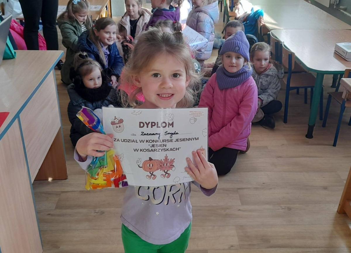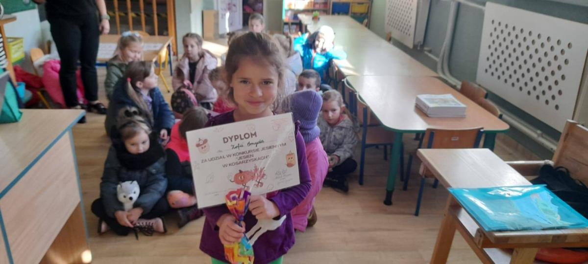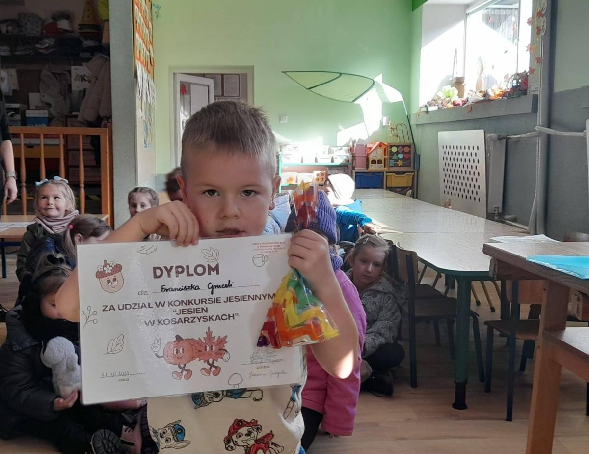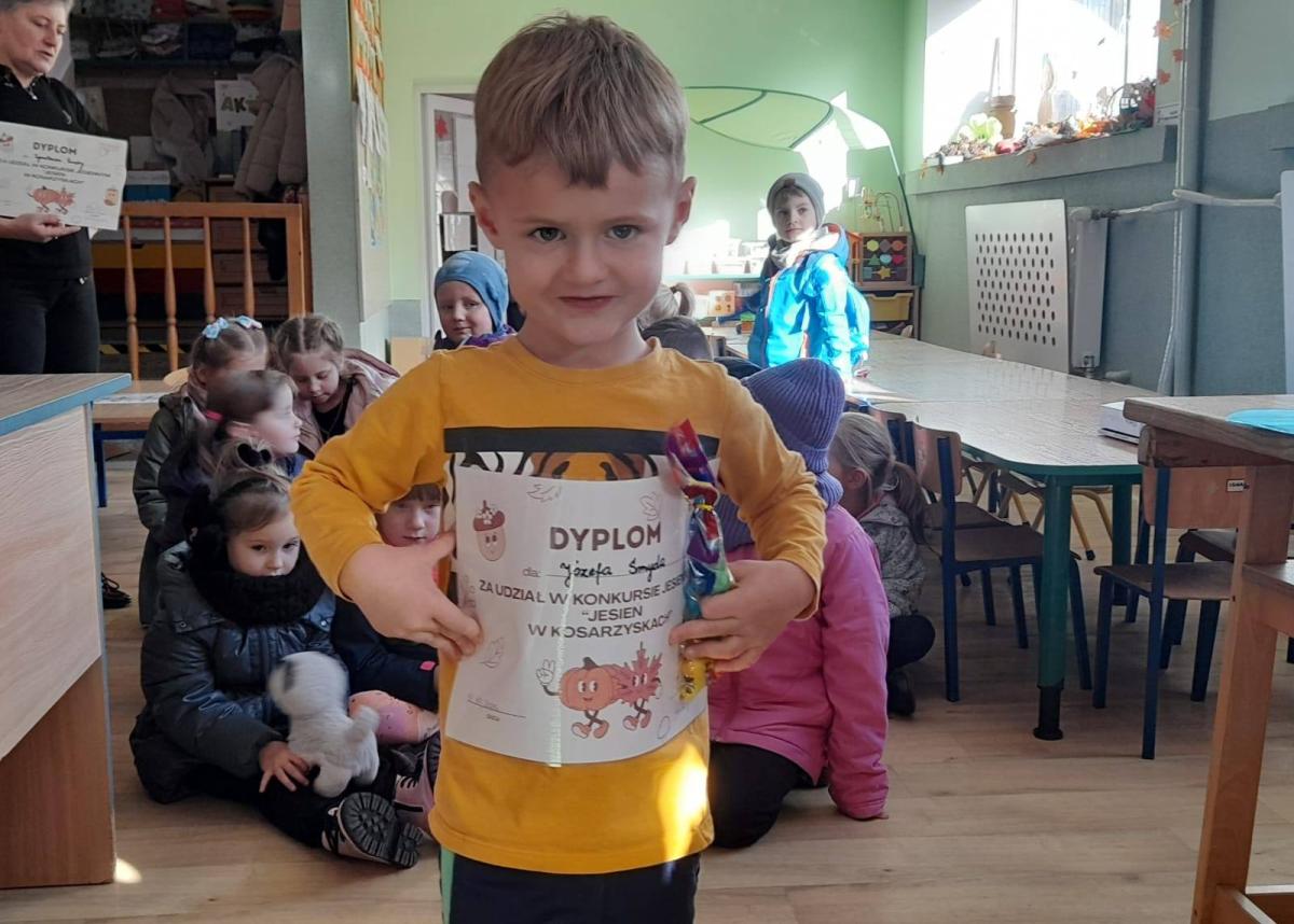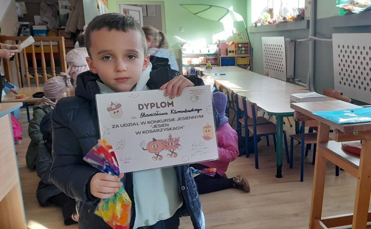 Każde dziecko otrzymało pamiątkowy dyplom oraz drobną nagrodę. Gratulujemy wszystkim uczestnikom i dziękujemy za zaangażowanie w tworzenie prac oddających urok jesieni w Kosarzyskach!