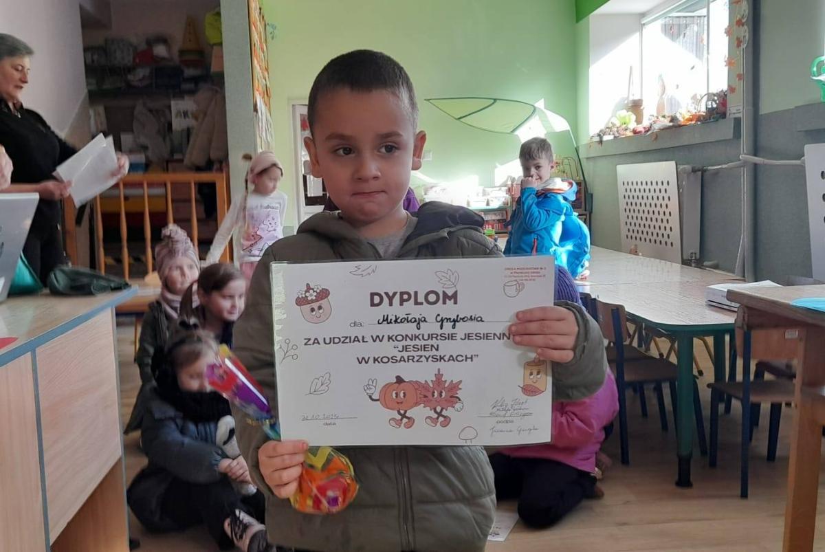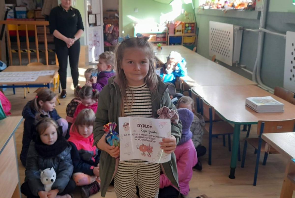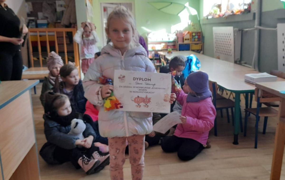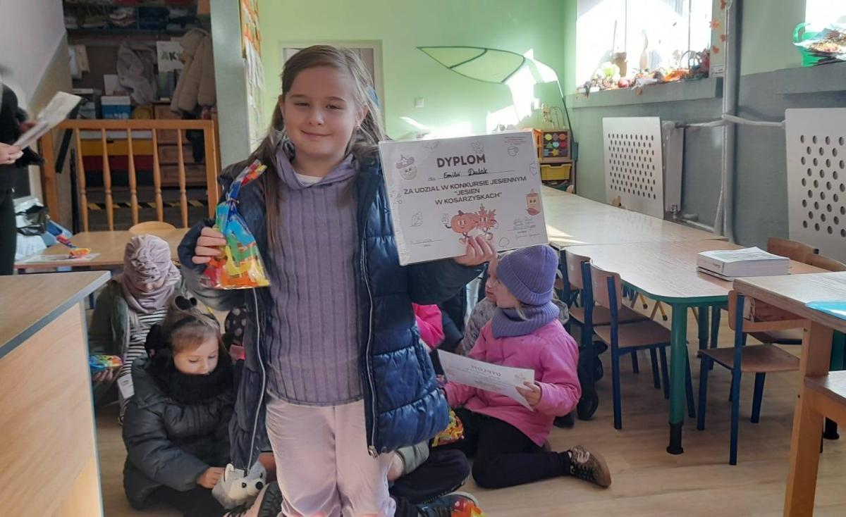 Każde dziecko otrzymało pamiątkowy dyplom oraz drobną nagrodę. Gratulujemy wszystkim uczestnikom i dziękujemy za zaangażowanie w tworzenie prac oddających urok jesieni w Kosarzyskach!