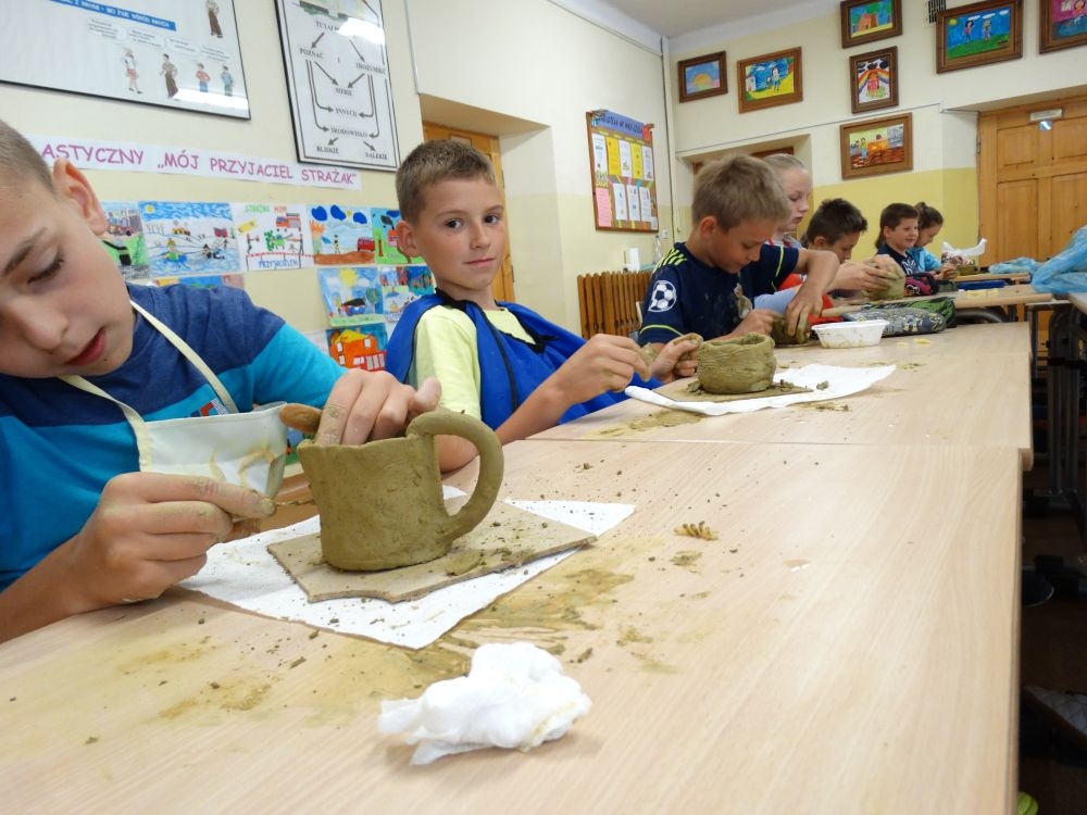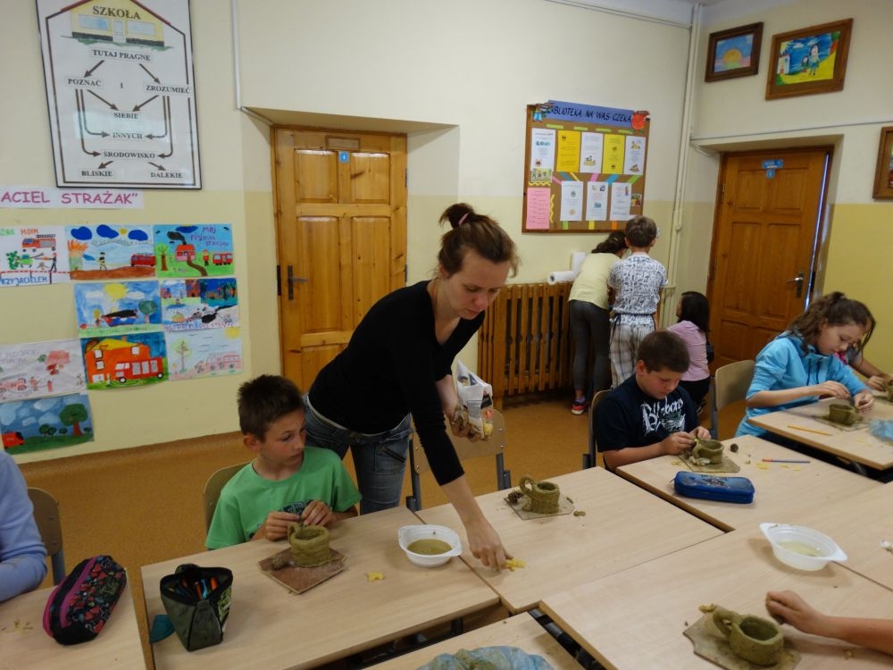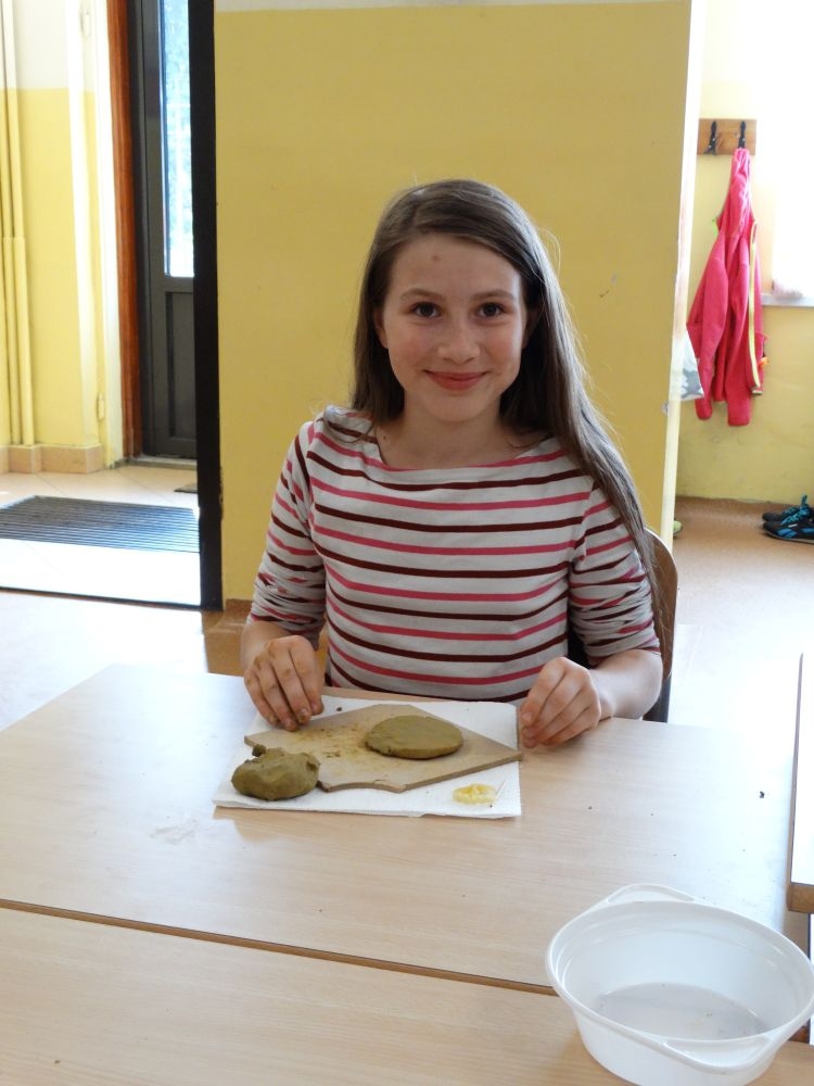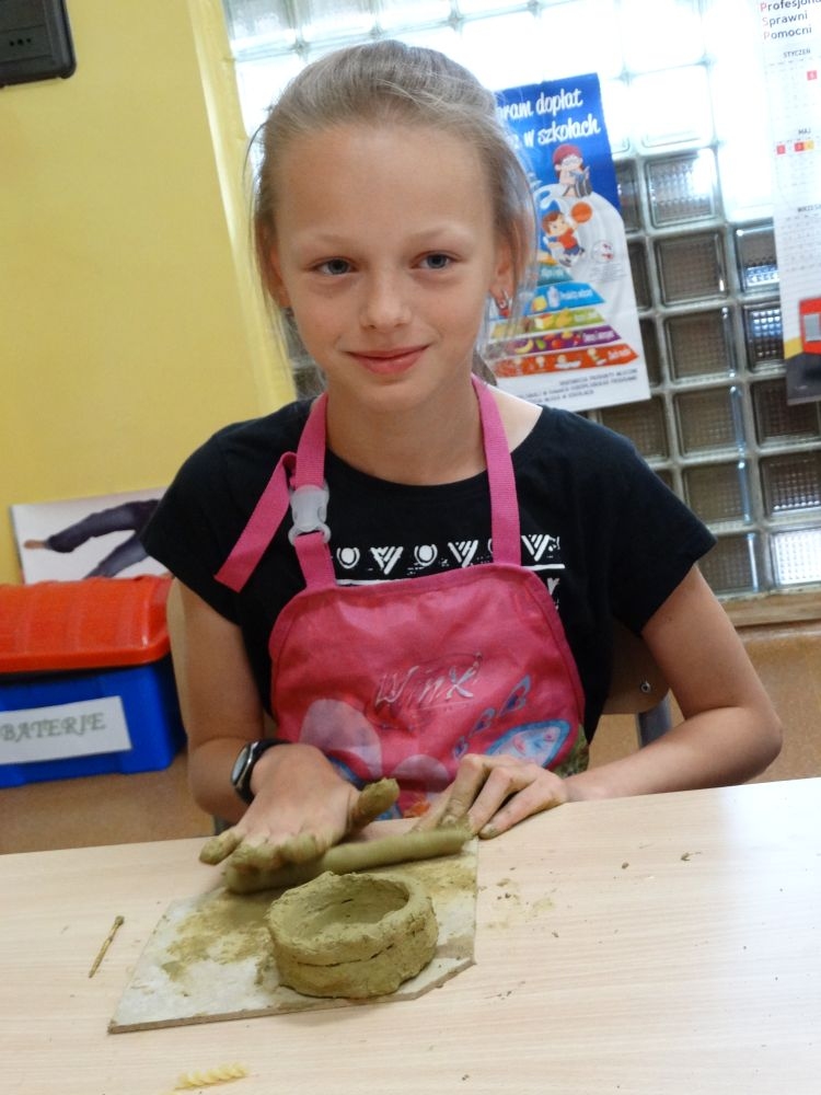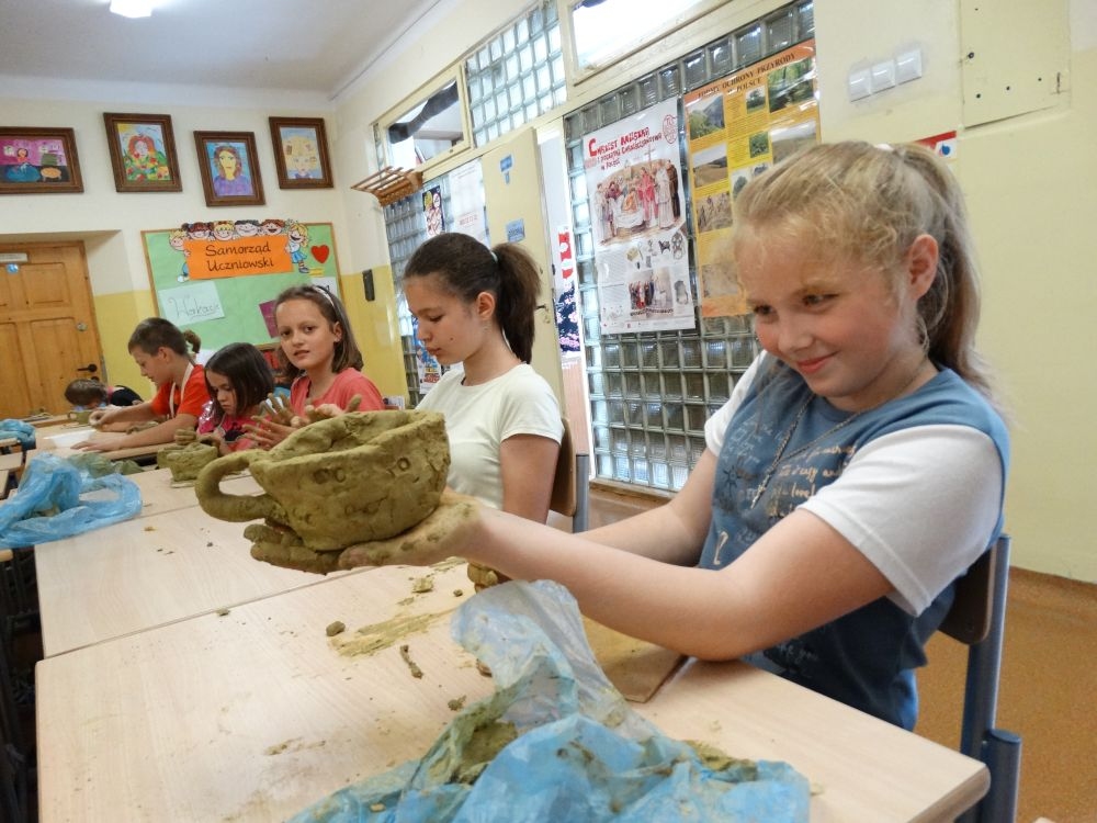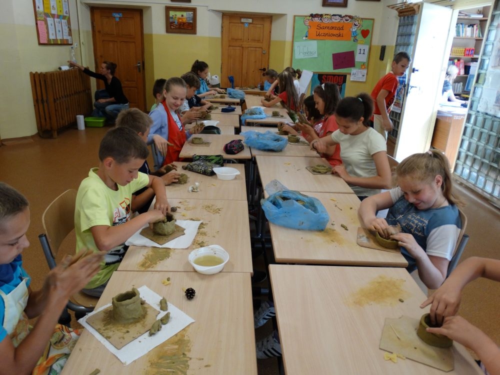 W piękny, słoneczny poranek, 21 czerwca w Szkole Podstawowej pojawił się specjalny gość. Była to pani Justyna Deryng – właścicielka pracowni ceramicznej, radna Miasta i Gminy Piwniczna – Zdrój. Nasza artystka poprowadziła dla uczniów klas IV – VI niecodzienne zajęcia lepienia z gliny. Na początku spotkania pani Justyna wyjaśniła dzieciom, jak należy obchodzić się z gliną. Później omówiła, krok po kroku, poszczególne etapy pracy a zarazem świetnej zabawy. Podczas spotkania praca wrzała. Dzieci bardzo starannie ugniatały glinę, po czym powstawały piękne gliniane arcydzieła: kubki, kubeczki, miski, miseczki… Największą atrakcją było ozdabianie prac za pomocą szyszek, makaronu i wykałaczek. Mali „rzeźbiarze” stworzyli dzieła o różnorodnych wzorach i kształtach. Efekt był cudowny! Widać było, że lepienie sprawia im wiele radości i satysfakcji z wykonywanej rzeźby. Sama zabawa gliną była dla naszych uczniów przyjemnością, a kiedy powstały ich małe dzieła, byli z siebie bardzo dumni. Mamy nadzieję, iż lepienia z gliny na stale zagoszczą w szkolnym kalendarzu i będą cyklicznym wydarzeniem w naszej szkole.