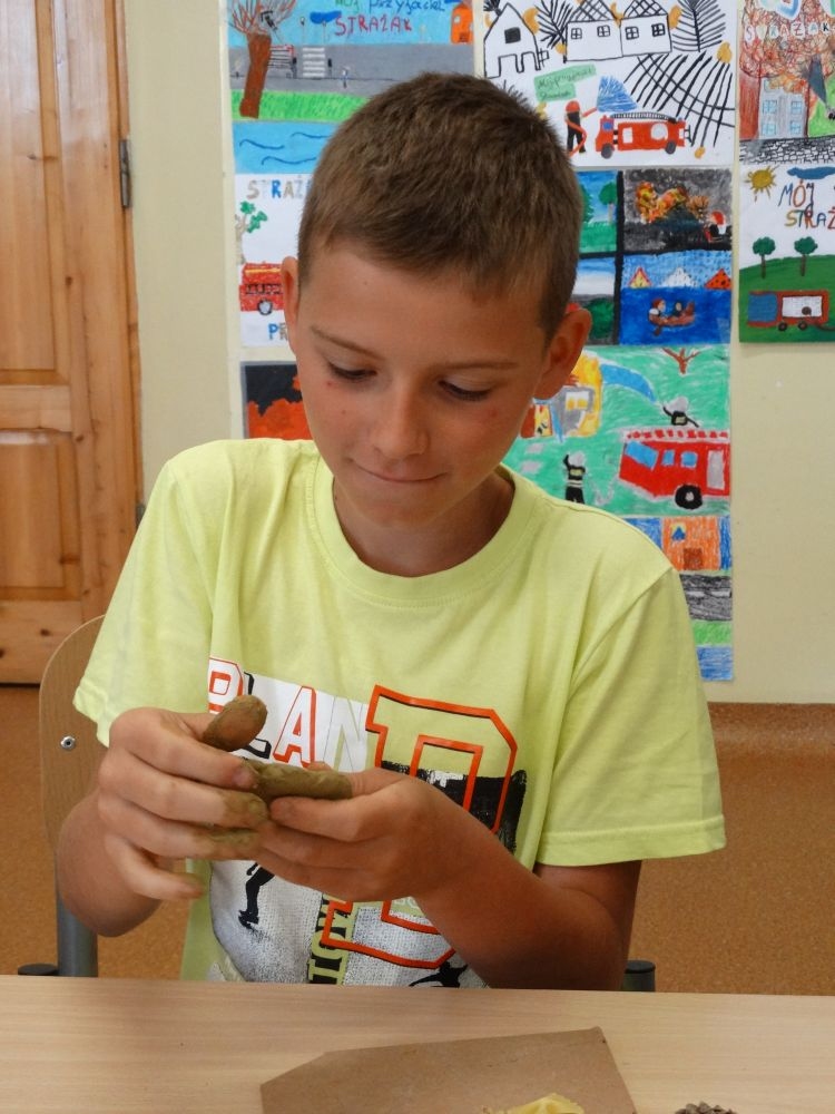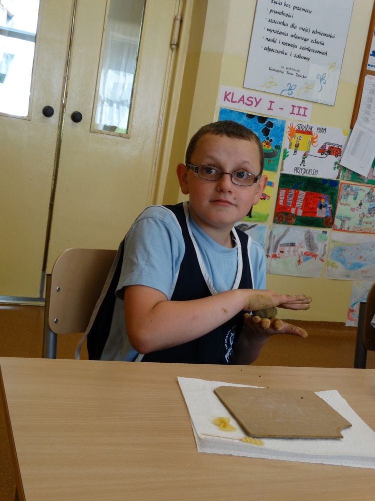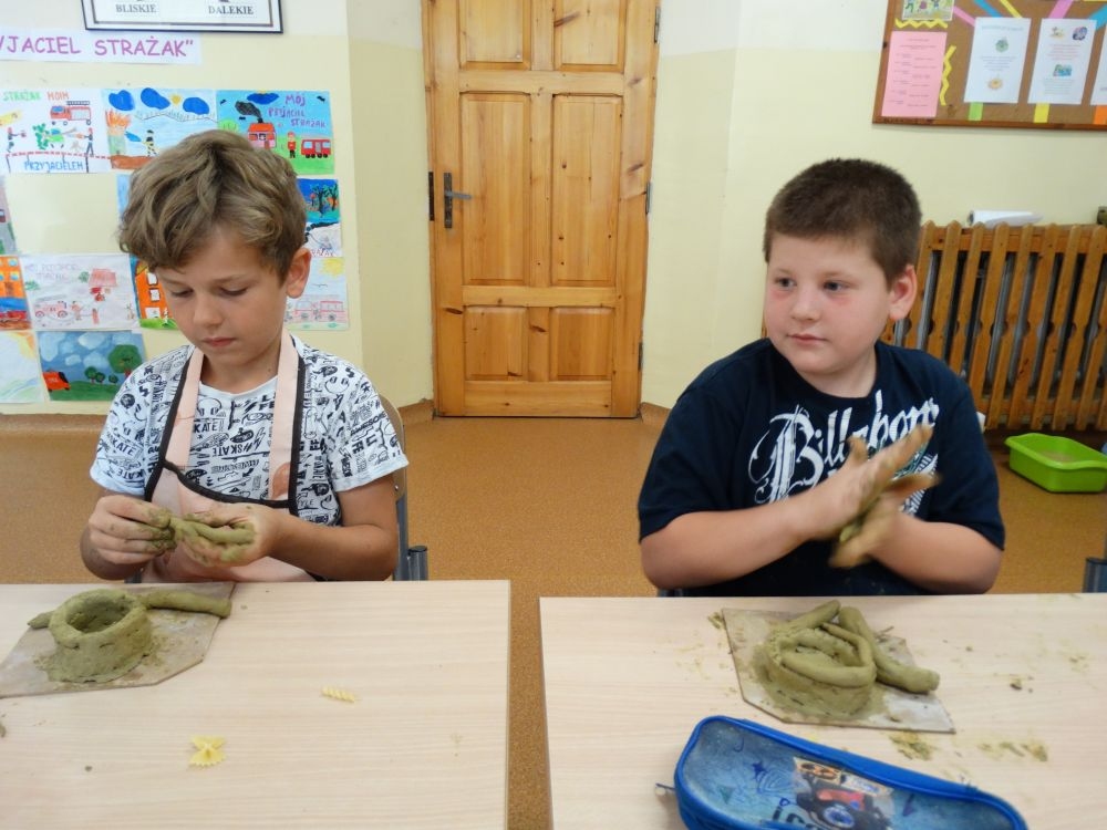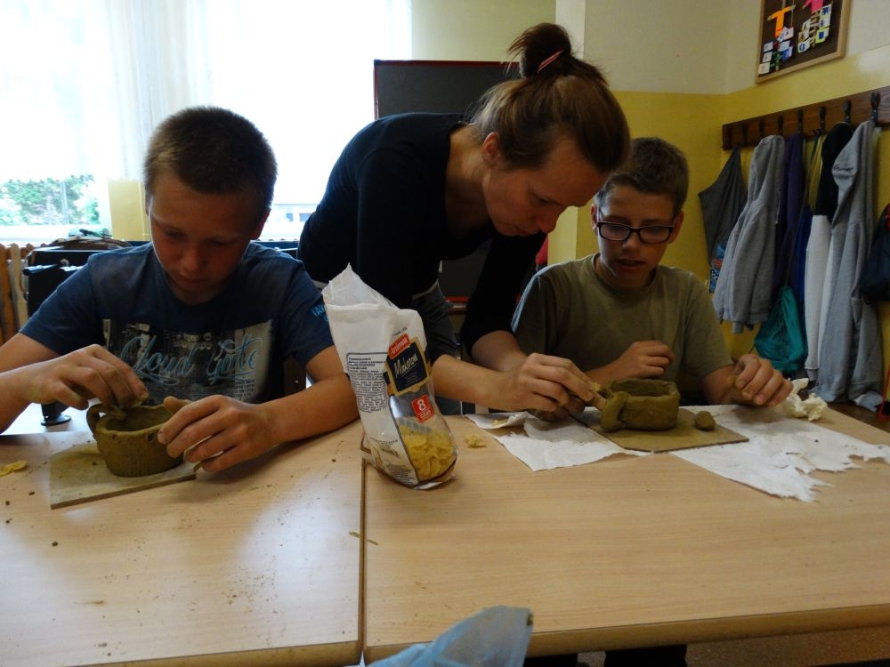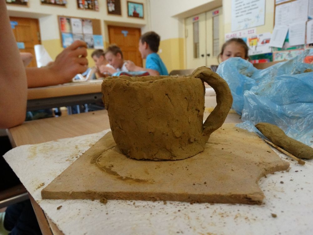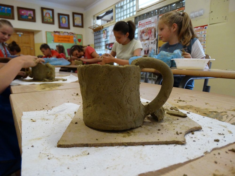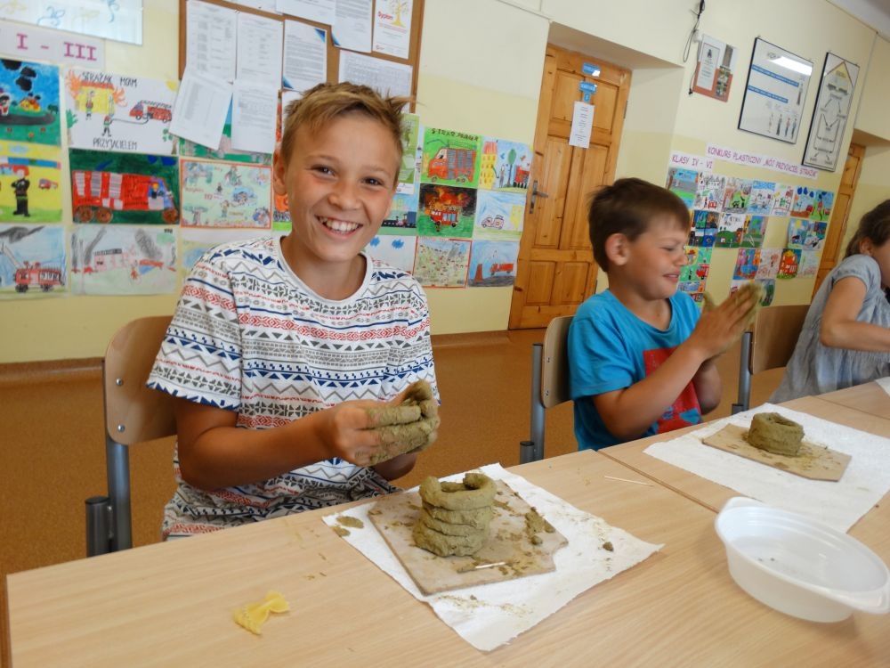 W piękny, słoneczny poranek, 21 czerwca w Szkole Podstawowej pojawił się specjalny gość. Była to pani Justyna Deryng – właścicielka pracowni ceramicznej, radna Miasta i Gminy Piwniczna – Zdrój. Nasza artystka poprowadziła dla uczniów klas IV – VI niecodzienne zajęcia lepienia z gliny. Na początku spotkania pani Justyna wyjaśniła dzieciom, jak należy obchodzić się z gliną. Później omówiła, krok po kroku, poszczególne etapy pracy a zarazem świetnej zabawy. Podczas spotkania praca wrzała. Dzieci bardzo starannie ugniatały glinę, po czym powstawały piękne gliniane arcydzieła: kubki, kubeczki, miski, miseczki… Największą atrakcją było ozdabianie prac za pomocą szyszek, makaronu i wykałaczek. Mali „rzeźbiarze” stworzyli dzieła o różnorodnych wzorach i kształtach. Efekt był cudowny! Widać było, że lepienie sprawia im wiele radości i satysfakcji z wykonywanej rzeźby. Sama zabawa gliną była dla naszych uczniów przyjemnością, a kiedy powstały ich małe dzieła, byli z siebie bardzo dumni. Mamy nadzieję, iż lepienia z gliny na stale zagoszczą w szkolnym kalendarzu i będą cyklicznym wydarzeniem w naszej szkole.