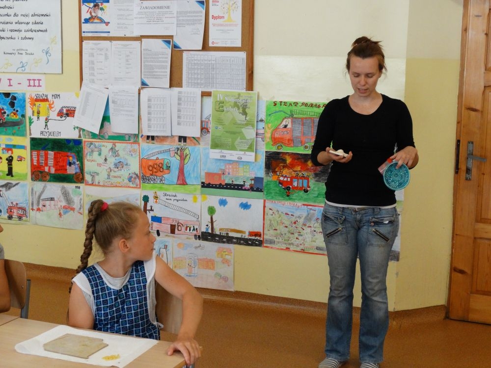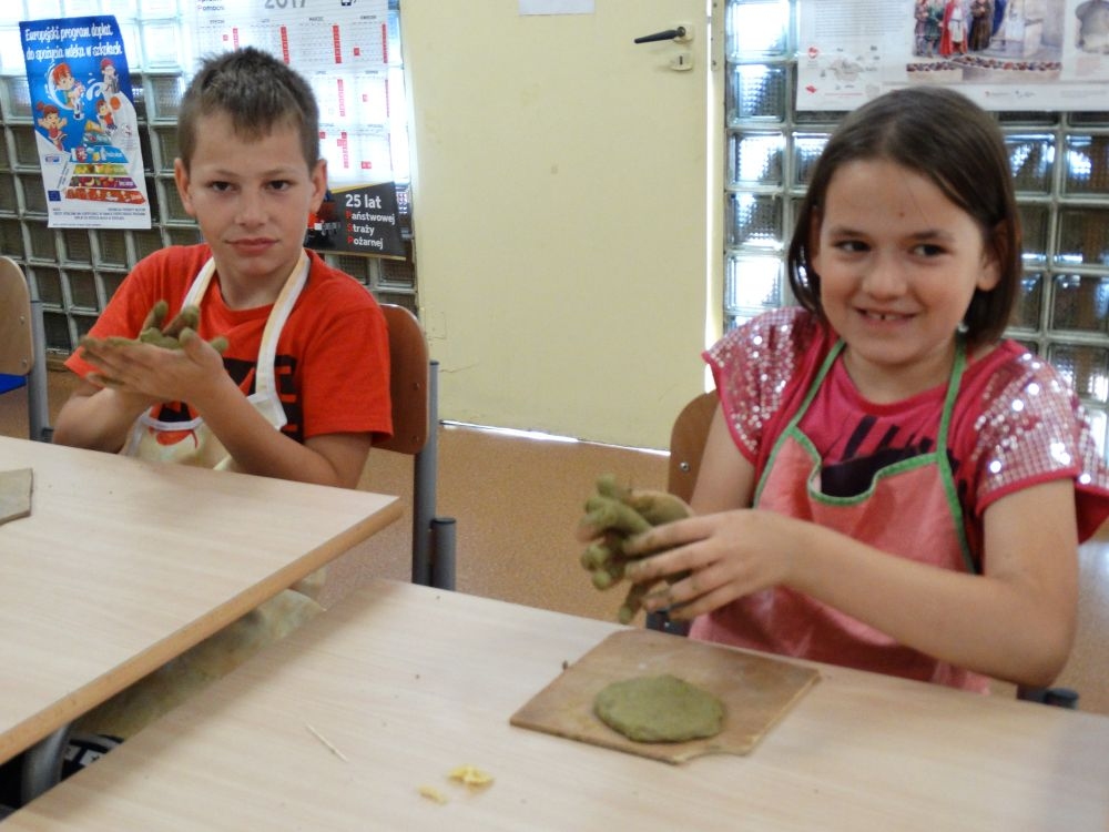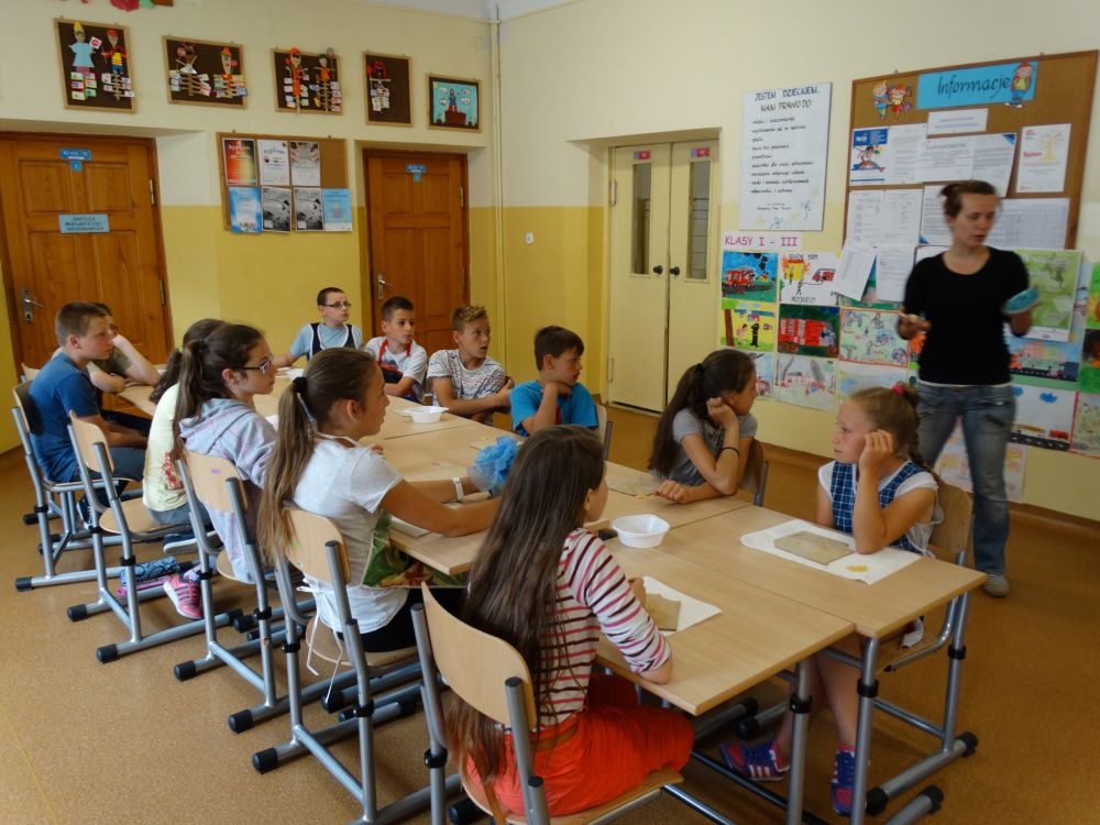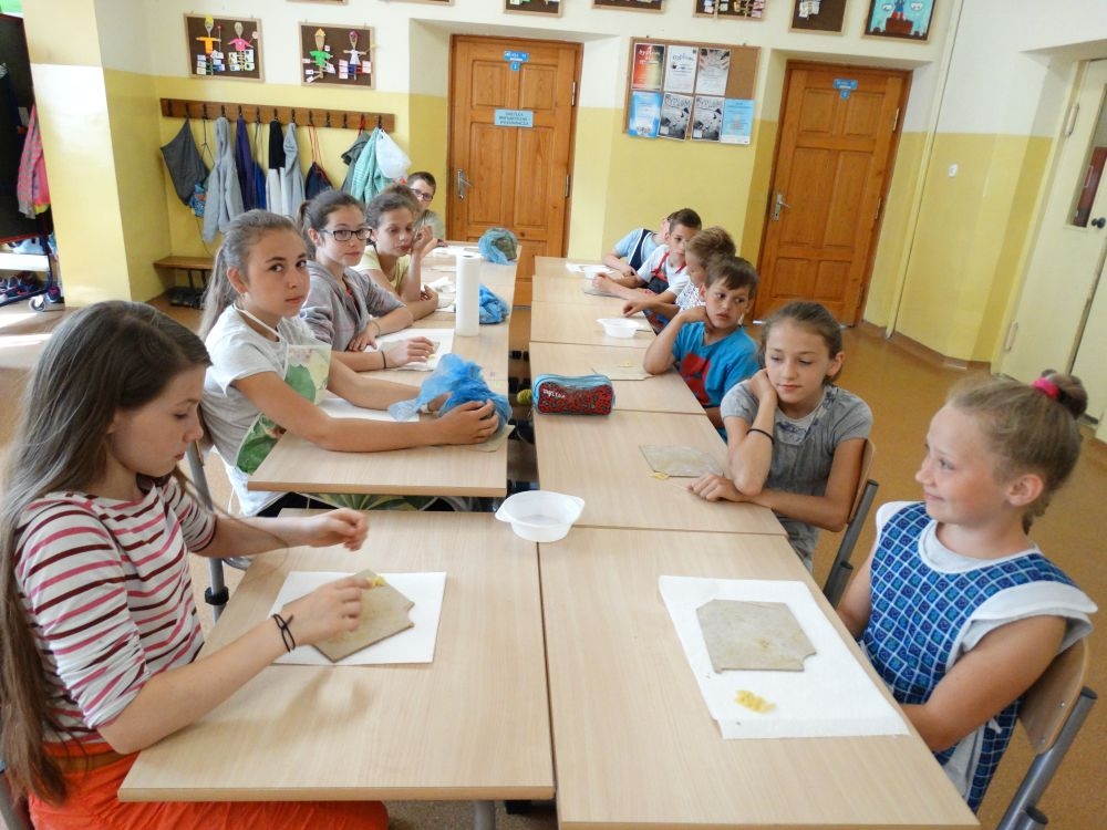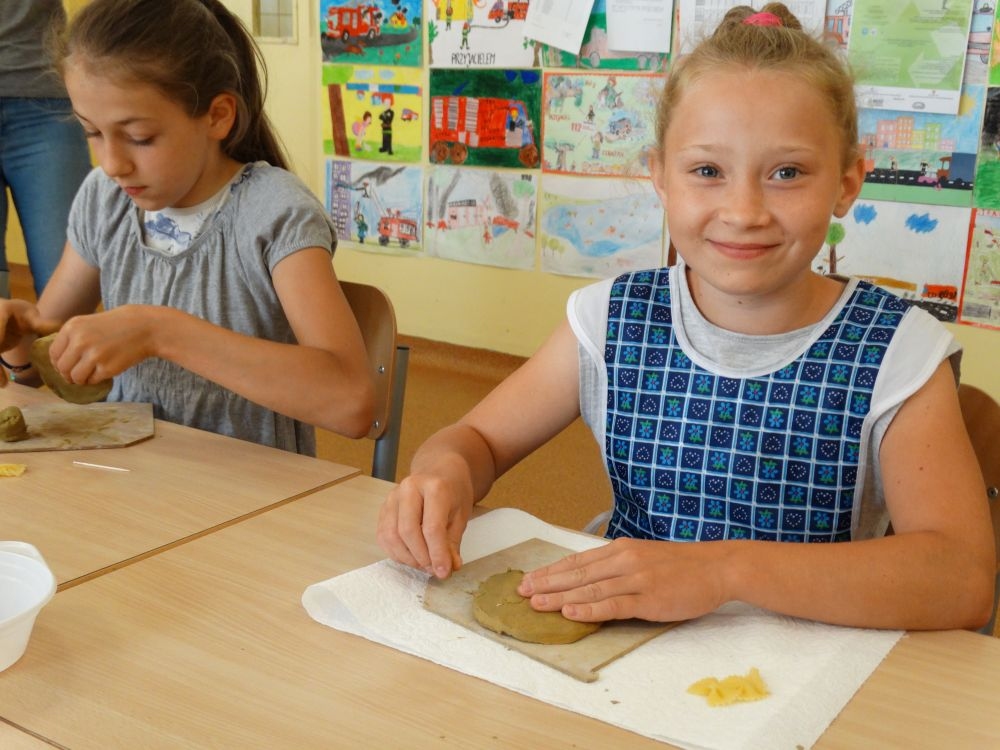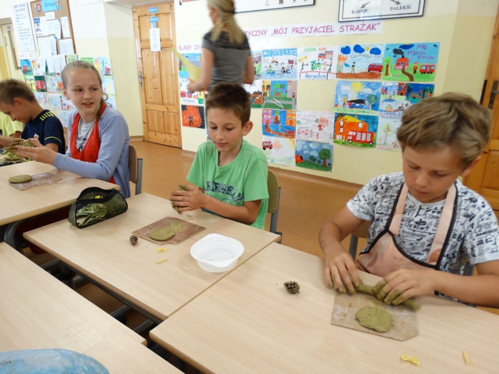 W piękny, słoneczny poranek, 21 czerwca w Szkole Podstawowej pojawił się specjalny gość. Była to pani Justyna Deryng – właścicielka pracowni ceramicznej, radna Miasta i Gminy Piwniczna – Zdrój. Nasza artystka poprowadziła dla uczniów klas IV – VI niecodzienne zajęcia lepienia z gliny. Na początku spotkania pani Justyna wyjaśniła dzieciom, jak należy obchodzić się z gliną. Później omówiła, krok po kroku, poszczególne etapy pracy a zarazem świetnej zabawy. Podczas spotkania praca wrzała. Dzieci bardzo starannie ugniatały glinę, po czym powstawały piękne gliniane arcydzieła: kubki, kubeczki, miski, miseczki… Największą atrakcją było ozdabianie prac za pomocą szyszek, makaronu i wykałaczek. Mali „rzeźbiarze” stworzyli dzieła o różnorodnych wzorach i kształtach. Efekt był cudowny! Widać było, że lepienie sprawia im wiele radości i satysfakcji z wykonywanej rzeźby. Sama zabawa gliną była dla naszych uczniów przyjemnością, a kiedy powstały ich małe dzieła, byli z siebie bardzo dumni. Mamy nadzieję, iż lepienia z gliny na stale zagoszczą w szkolnym kalendarzu i będą cyklicznym wydarzeniem w naszej szkole.