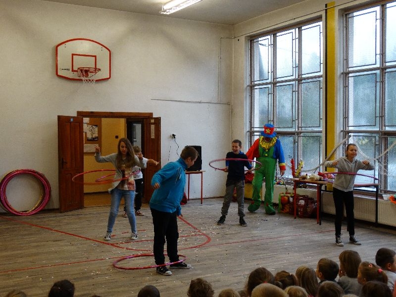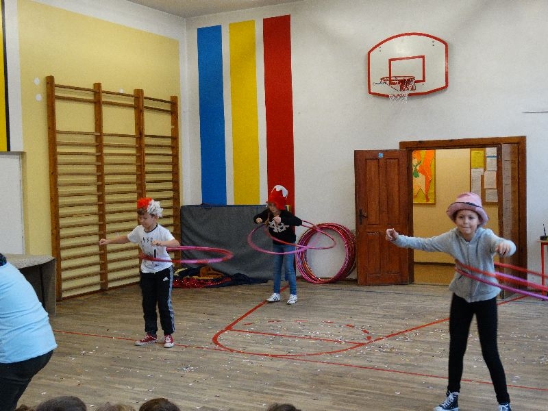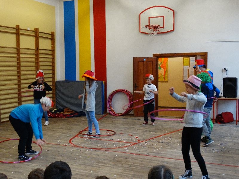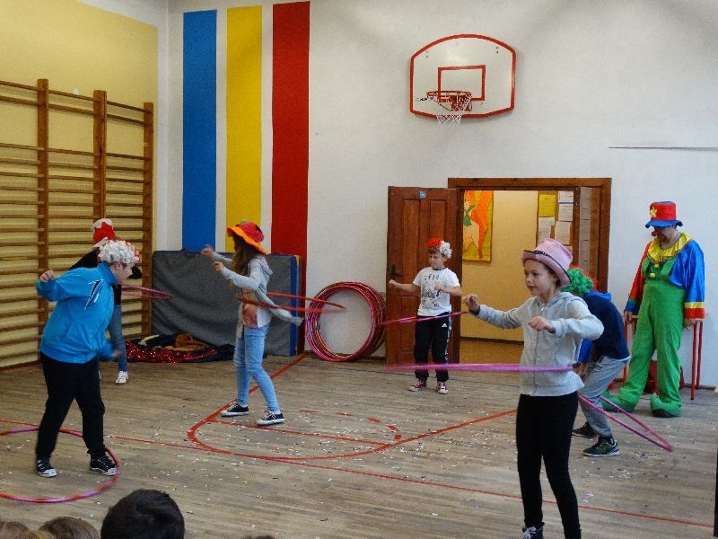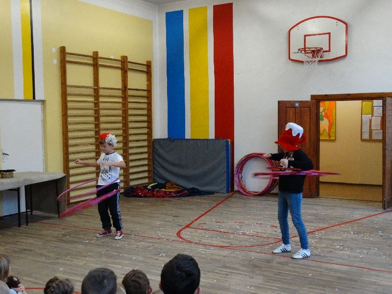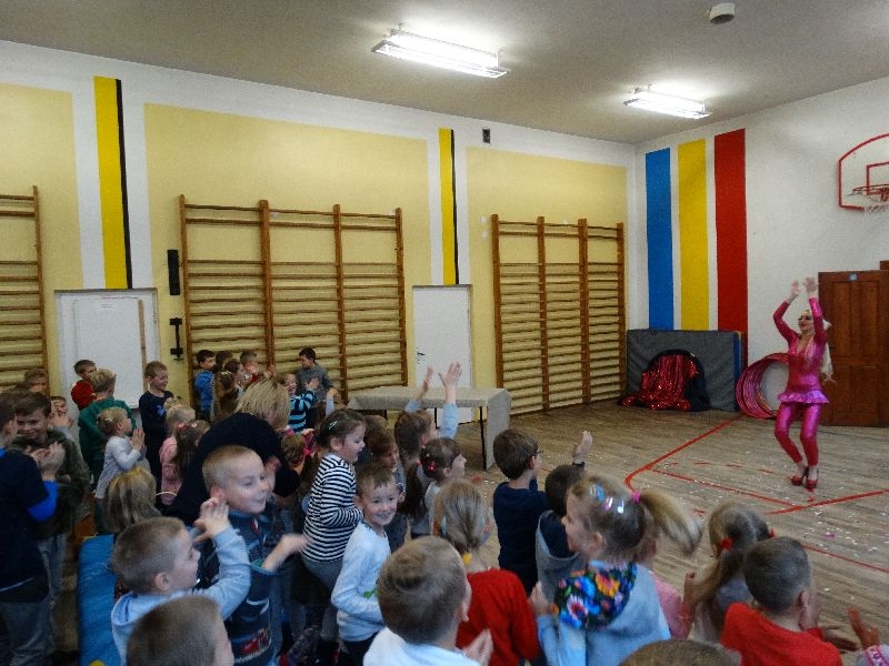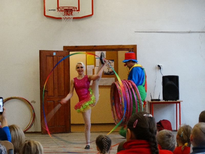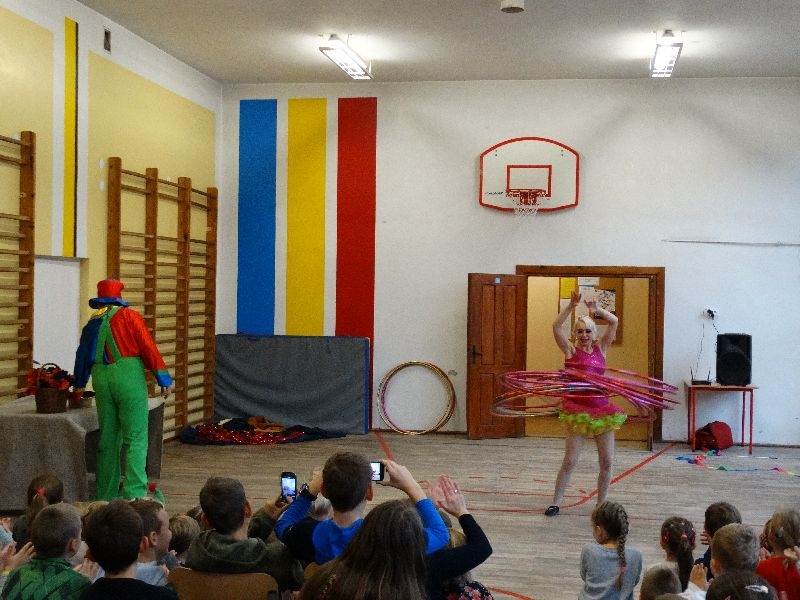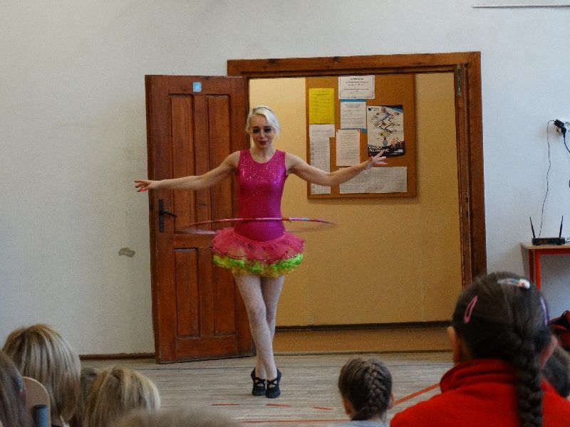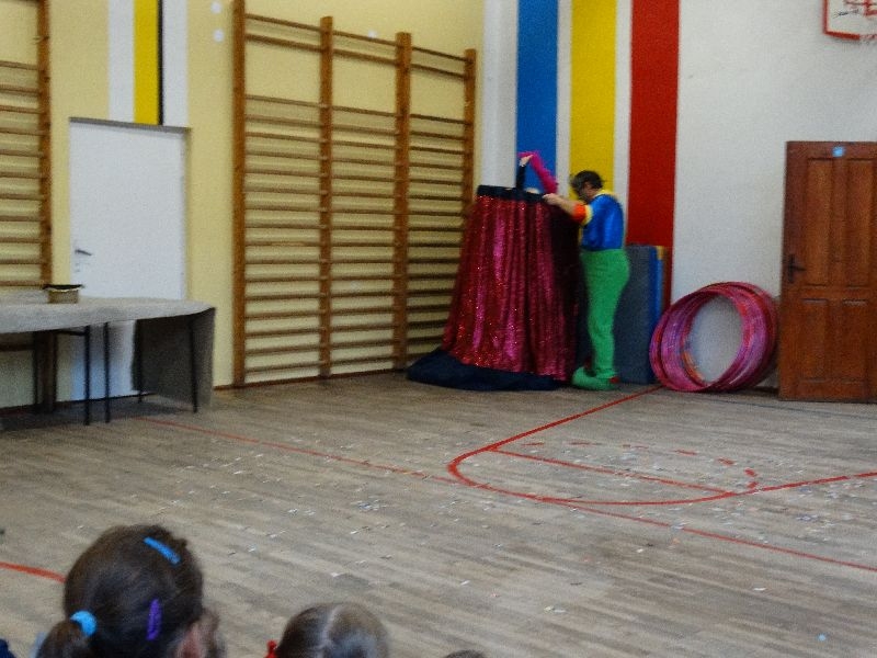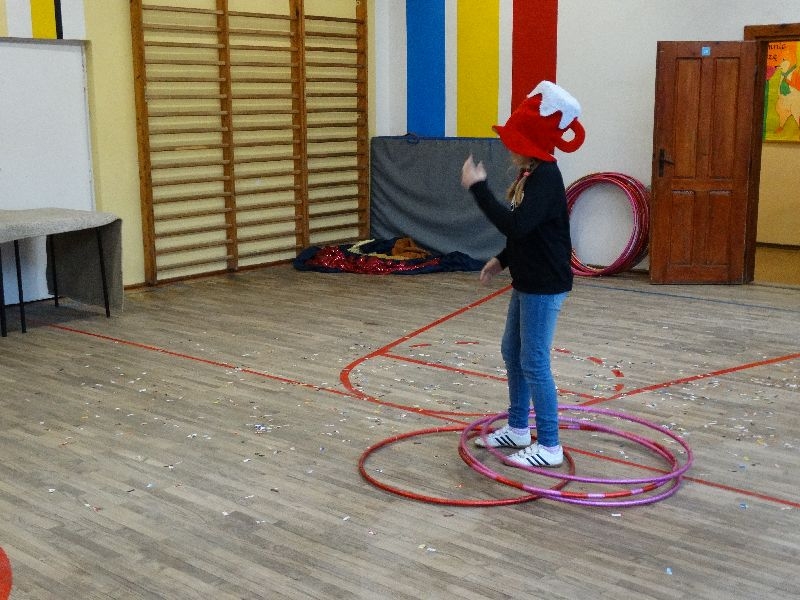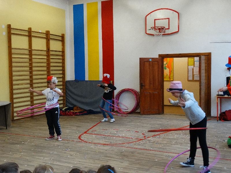 W tym dniu przybyła do nas dwuosobowa grupa cyrkowa ,która pokazała swoje umiejętności cyrkowe ,a szczególnie pani ,która popisywała się sprawnością i umiejętnościami żonglowania kółkiem hula hop. Mieli też swoje zwierzątka (króliki) ,które różniły się od tradycyjnych znanych ras i były specjalnie tresowane do wykonywania niektórych sztuczek m.in. przeskakiwania przez kółka i pchania wybranych zabawek. Ponadto było też kilka sztuczek magicznych z chusteczkami. Nasi uczniowie mogli także zademonstrować swoje umiejętności kręcenia kółkami hula hop. Na koniec uczniowie pod nadzorem prowadzącego wykonali pewną ewolucje gimnastyczną ,która polegała na utrzymaniu tzw. czworokąta przez kilka sekund .
