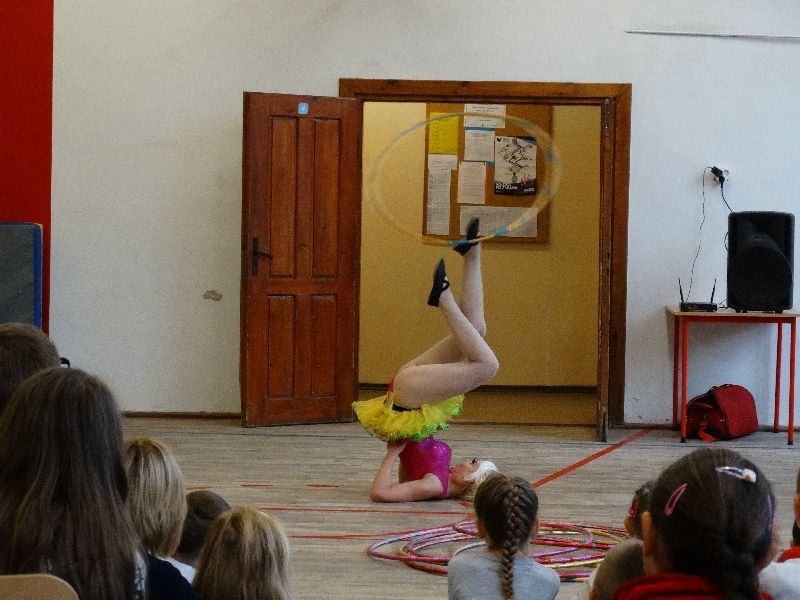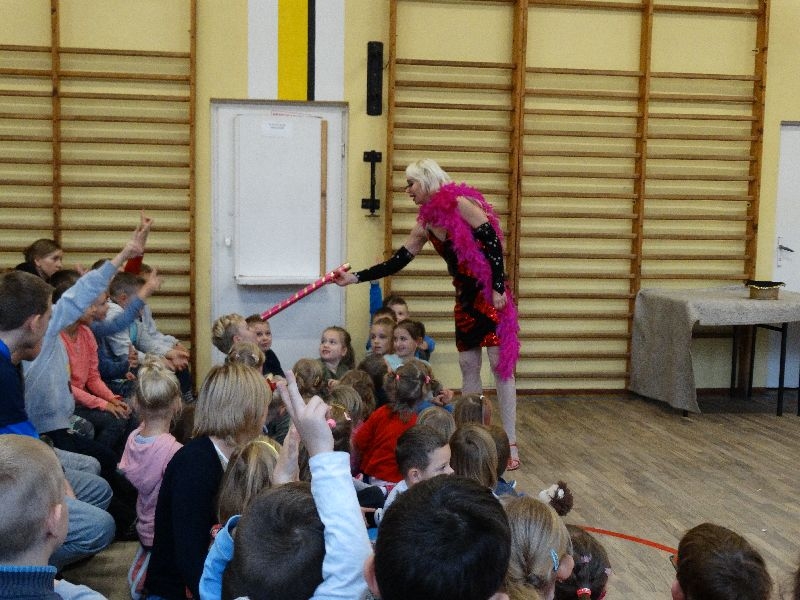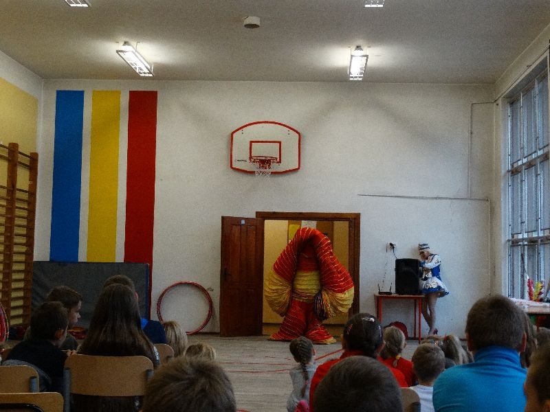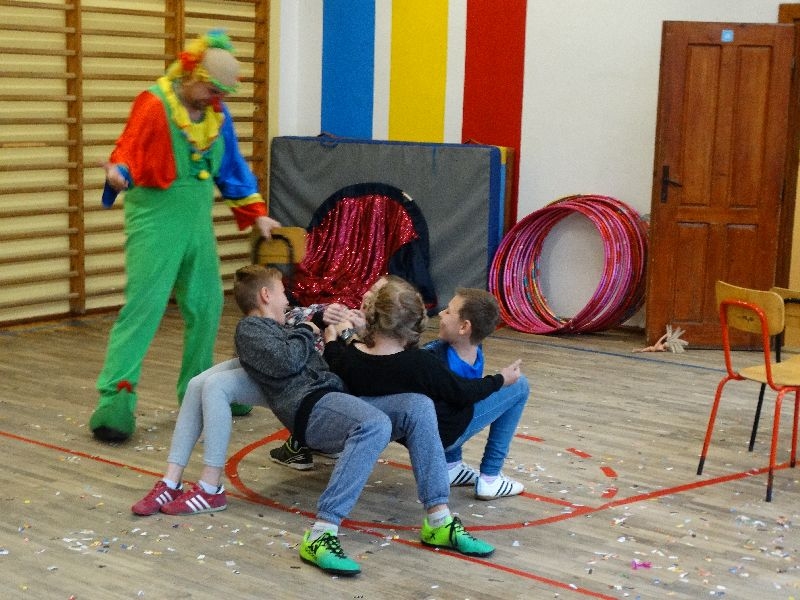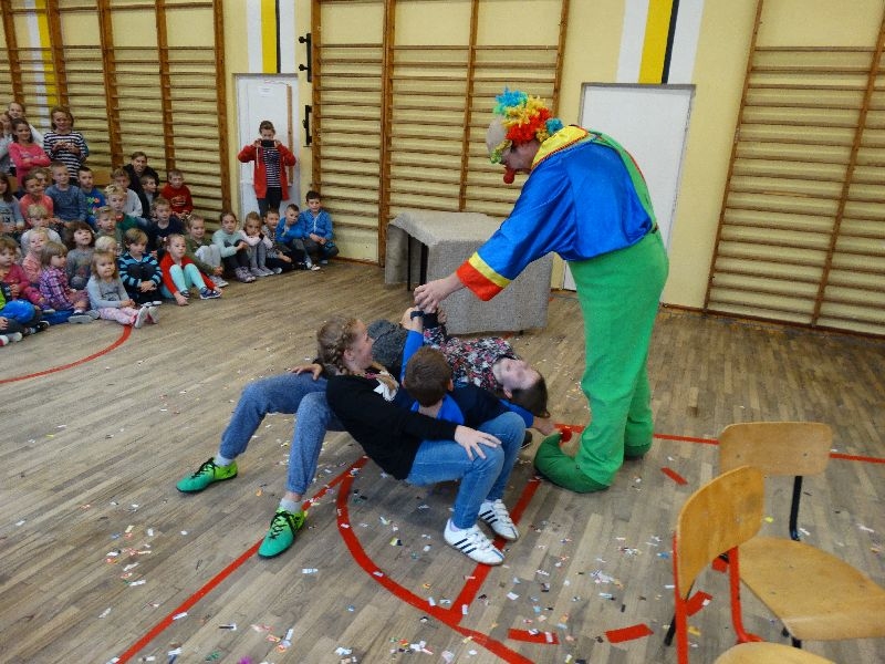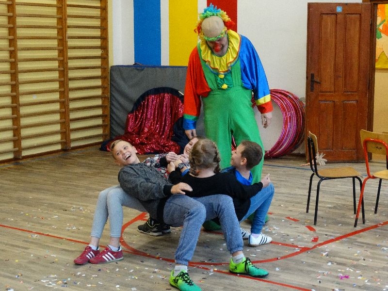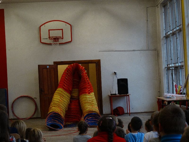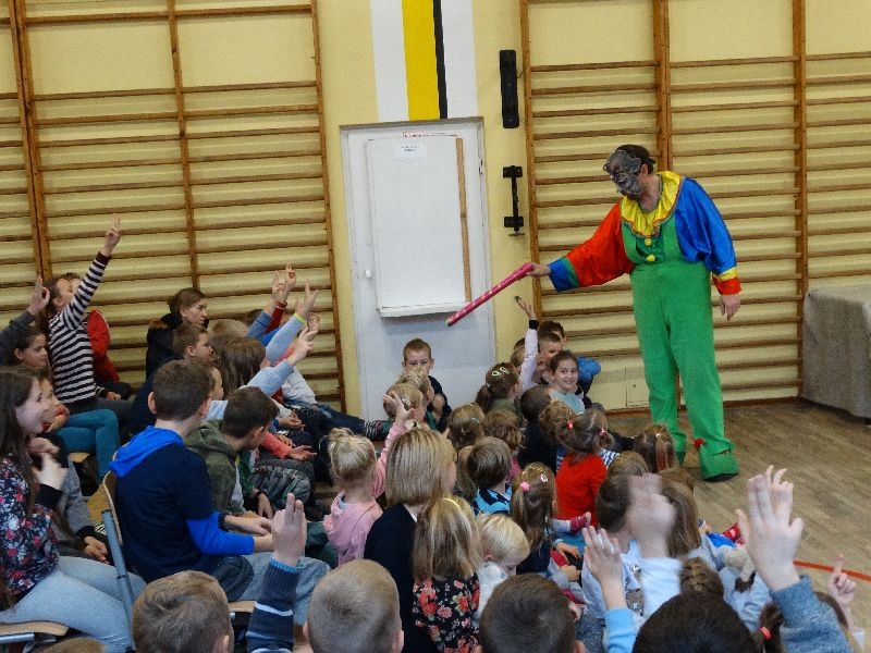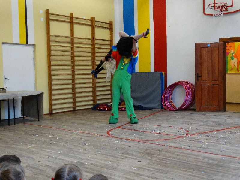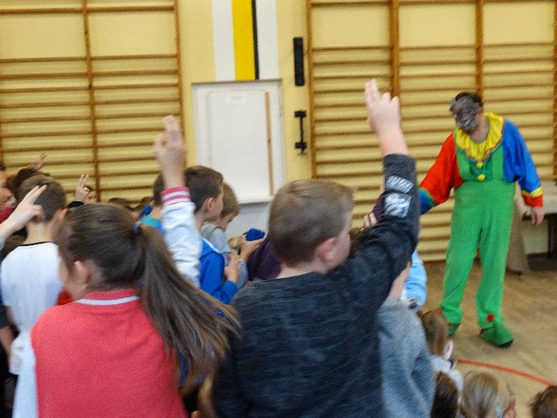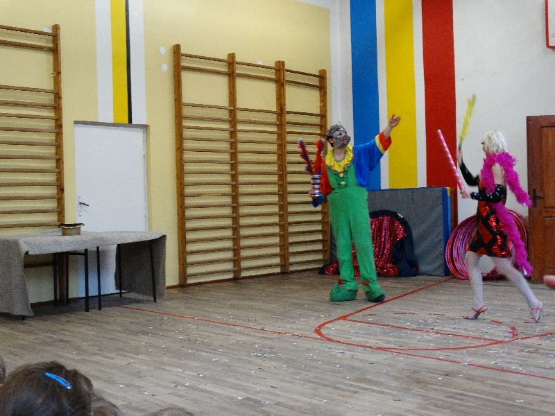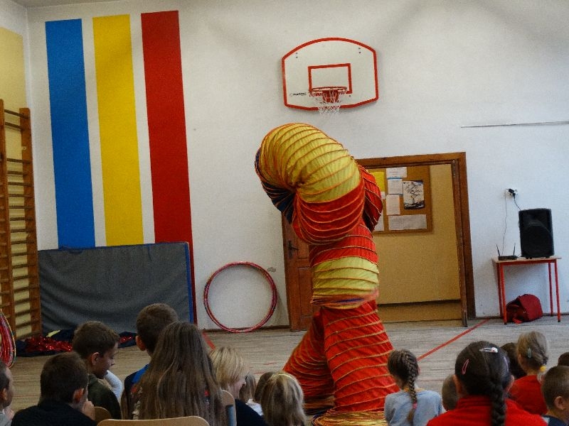 W tym dniu przybyła do nas dwuosobowa grupa cyrkowa ,która pokazała swoje umiejętności cyrkowe ,a szczególnie pani ,która popisywała się sprawnością i umiejętnościami żonglowania kółkiem hula hop. Mieli też swoje zwierzątka (króliki) ,które różniły się od tradycyjnych znanych ras i były specjalnie tresowane do wykonywania niektórych sztuczek m.in. przeskakiwania przez kółka i pchania wybranych zabawek. Ponadto było też kilka sztuczek magicznych z chusteczkami. Nasi uczniowie mogli także zademonstrować swoje umiejętności kręcenia kółkami hula hop. Na koniec uczniowie pod nadzorem prowadzącego wykonali pewną ewolucje gimnastyczną ,która polegała na utrzymaniu tzw. czworokąta przez kilka sekund .
