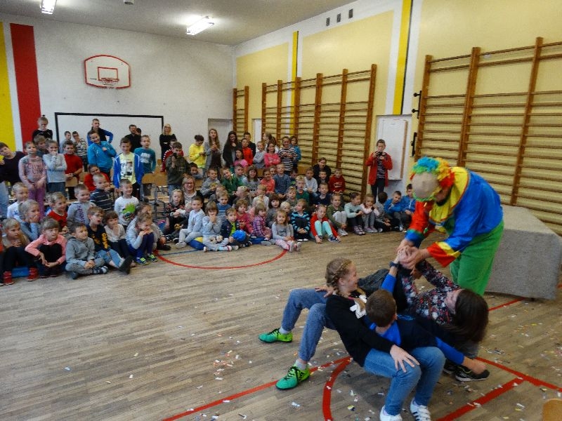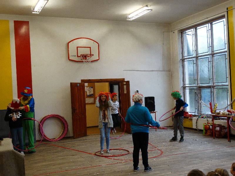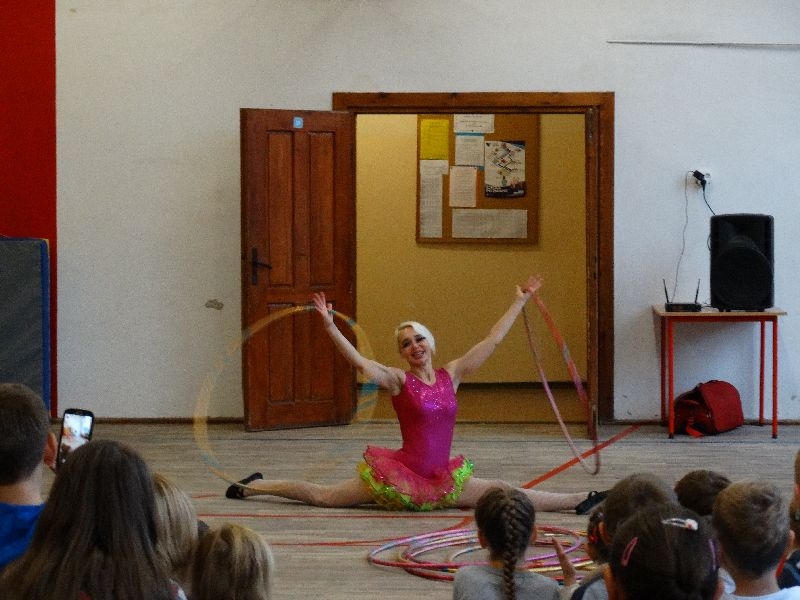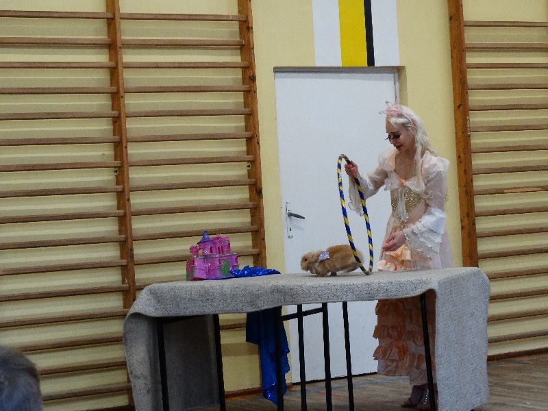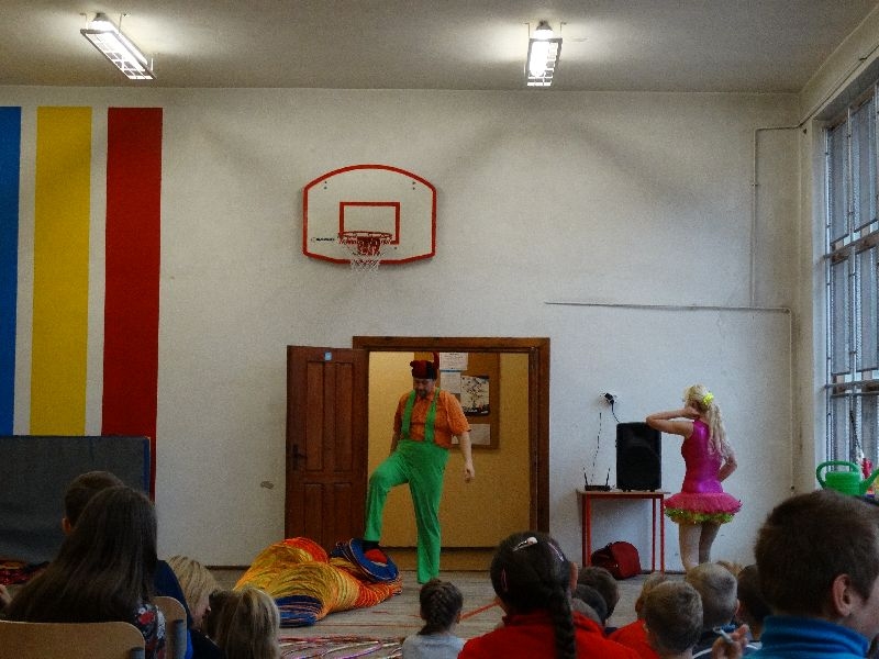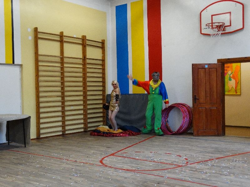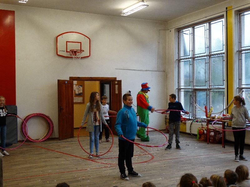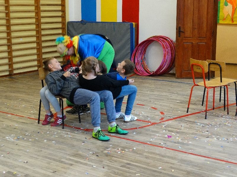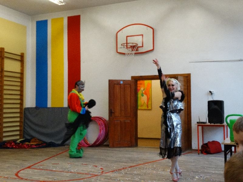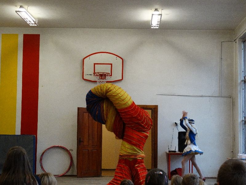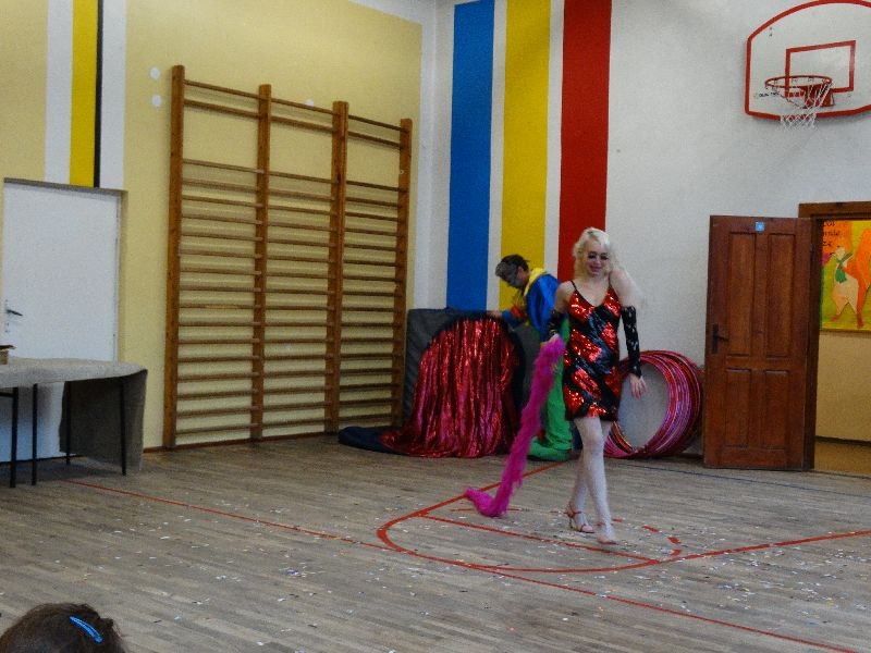 W tym dniu przybyła do nas dwuosobowa grupa cyrkowa ,która pokazała swoje umiejętności cyrkowe ,a szczególnie pani ,która popisywała się sprawnością i umiejętnościami żonglowania kółkiem hula hop. Mieli też swoje zwierzątka (króliki) ,które różniły się od tradycyjnych znanych ras i były specjalnie tresowane do wykonywania niektórych sztuczek m.in. przeskakiwania przez kółka i pchania wybranych zabawek. Ponadto było też kilka sztuczek magicznych z chusteczkami. Nasi uczniowie mogli także zademonstrować swoje umiejętności kręcenia kółkami hula hop. Na koniec uczniowie pod nadzorem prowadzącego wykonali pewną ewolucje gimnastyczną ,która polegała na utrzymaniu tzw. czworokąta przez kilka sekund .