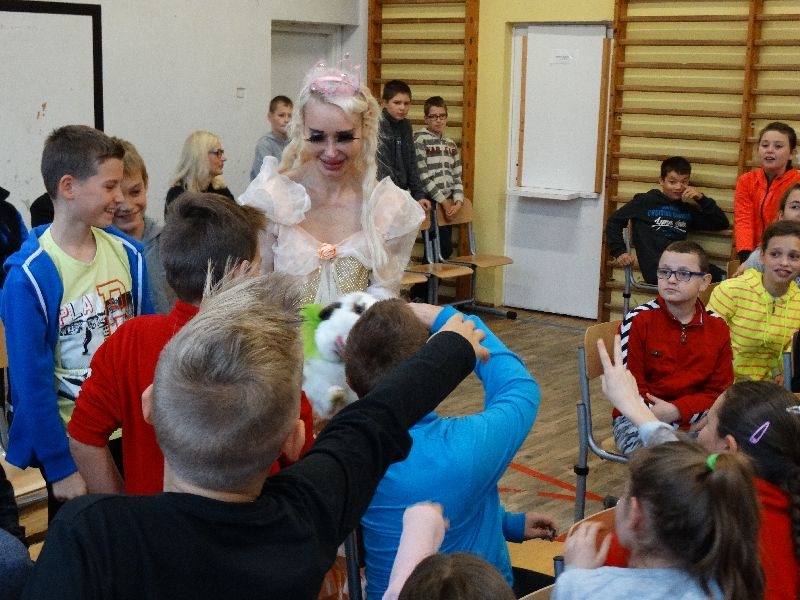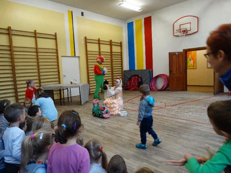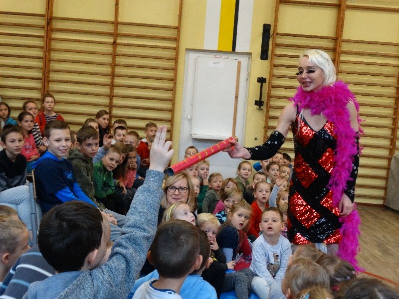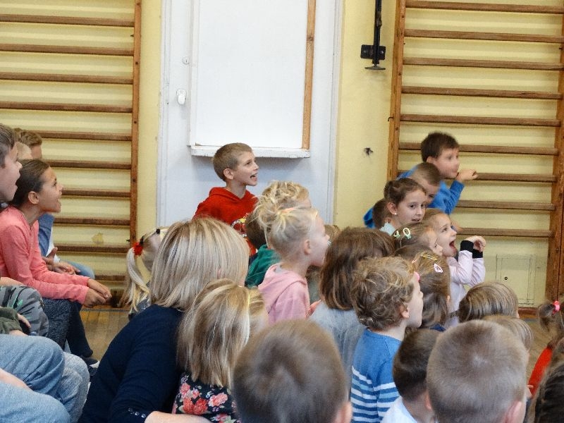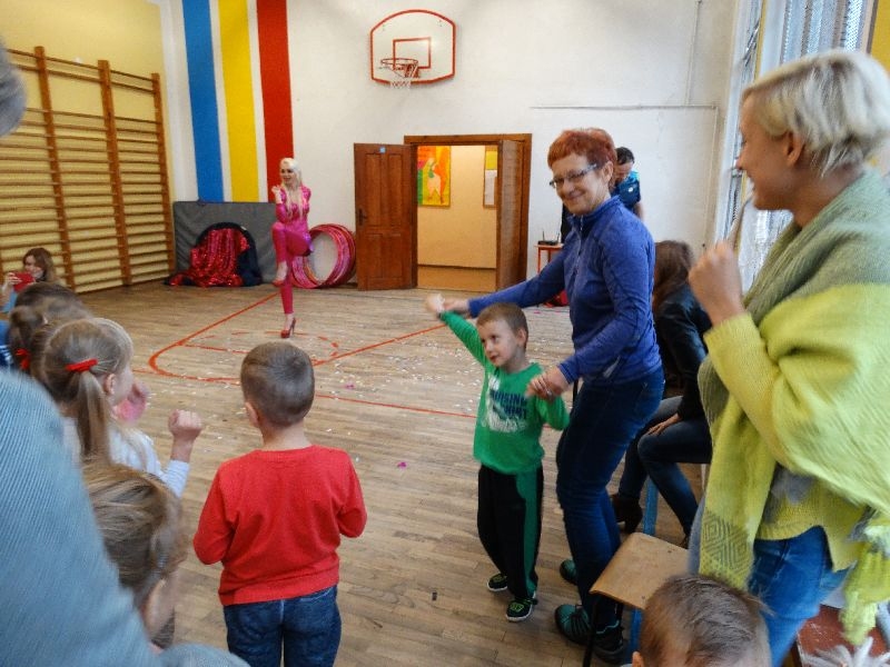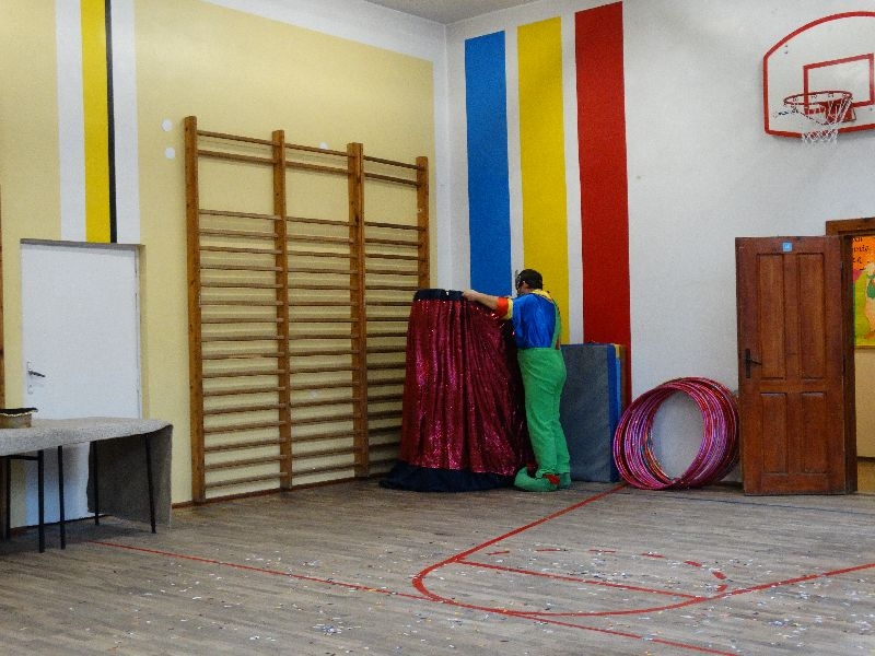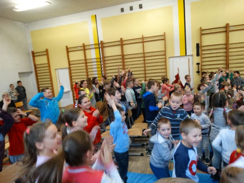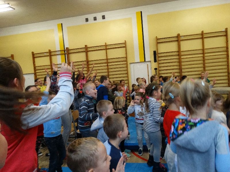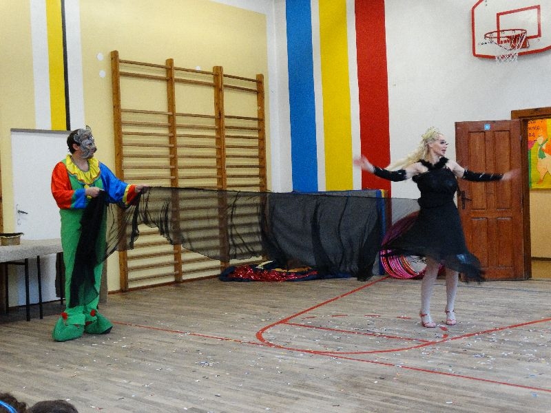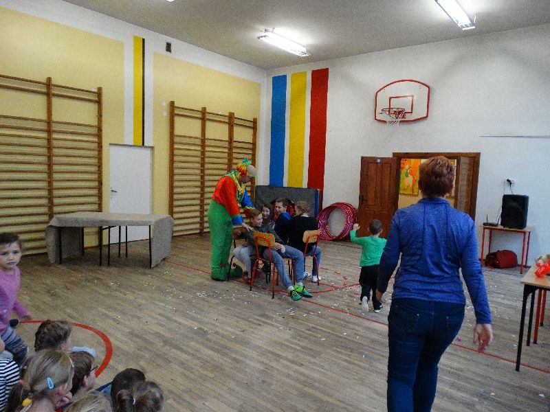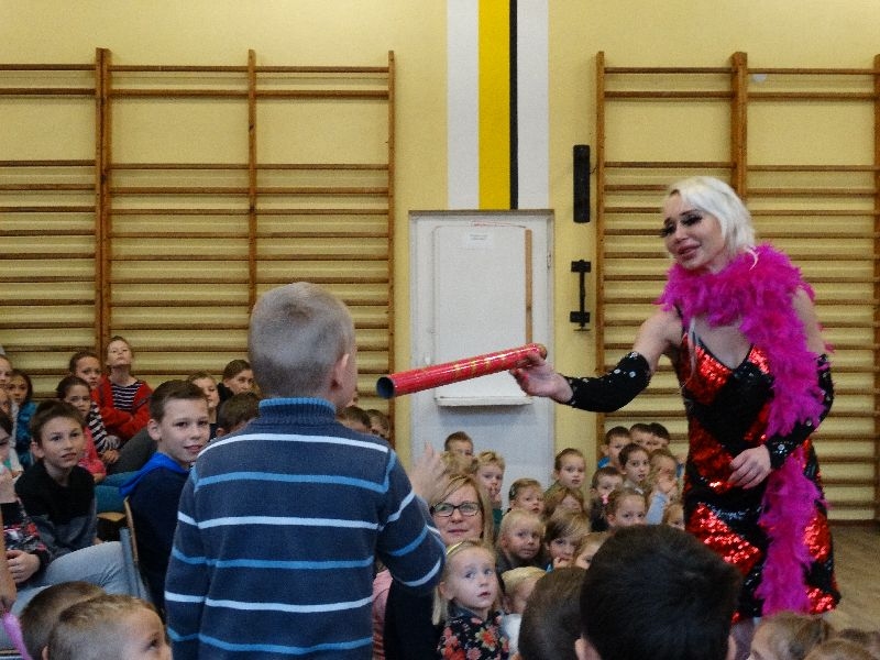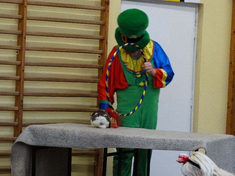 W tym dniu przybyła do nas dwuosobowa grupa cyrkowa ,która pokazała swoje umiejętności cyrkowe ,a szczególnie pani ,która popisywała się sprawnością i umiejętnościami żonglowania kółkiem hula hop. Mieli też swoje zwierzątka (króliki) ,które różniły się od tradycyjnych znanych ras i były specjalnie tresowane do wykonywania niektórych sztuczek m.in. przeskakiwania przez kółka i pchania wybranych zabawek. Ponadto było też kilka sztuczek magicznych z chusteczkami. Nasi uczniowie mogli także zademonstrować swoje umiejętności kręcenia kółkami hula hop. Na koniec uczniowie pod nadzorem prowadzącego wykonali pewną ewolucje gimnastyczną ,która polegała na utrzymaniu tzw. czworokąta przez kilka sekund .