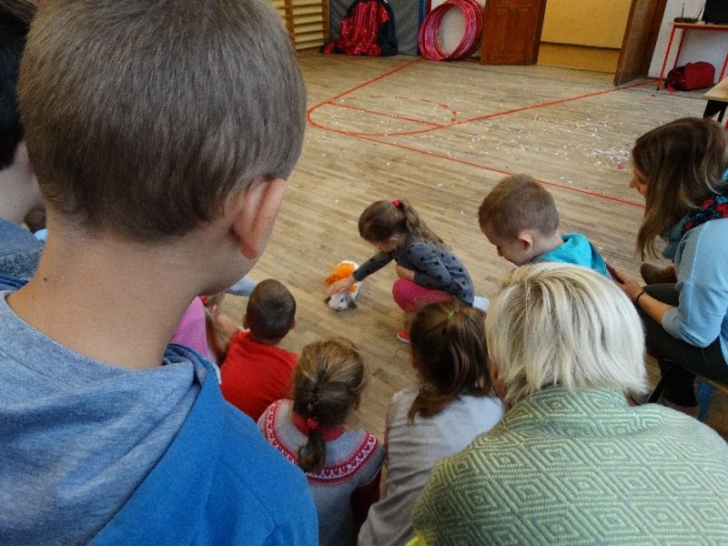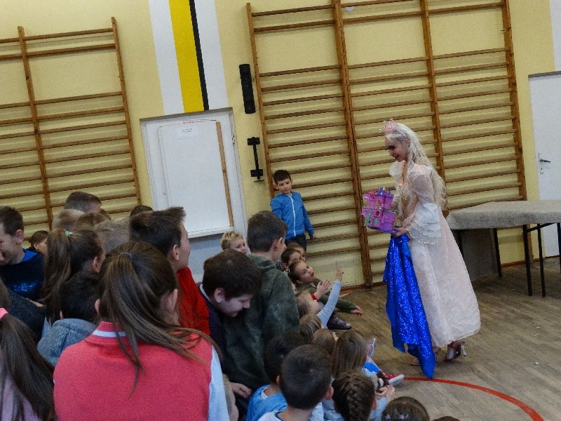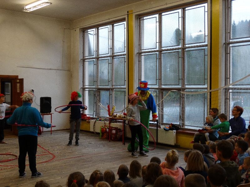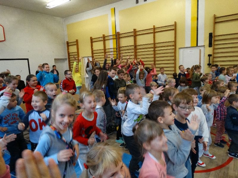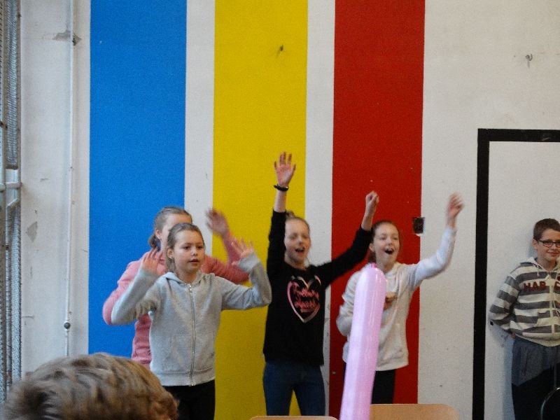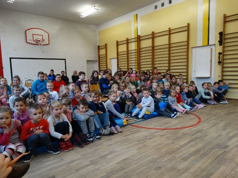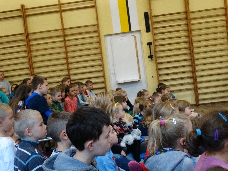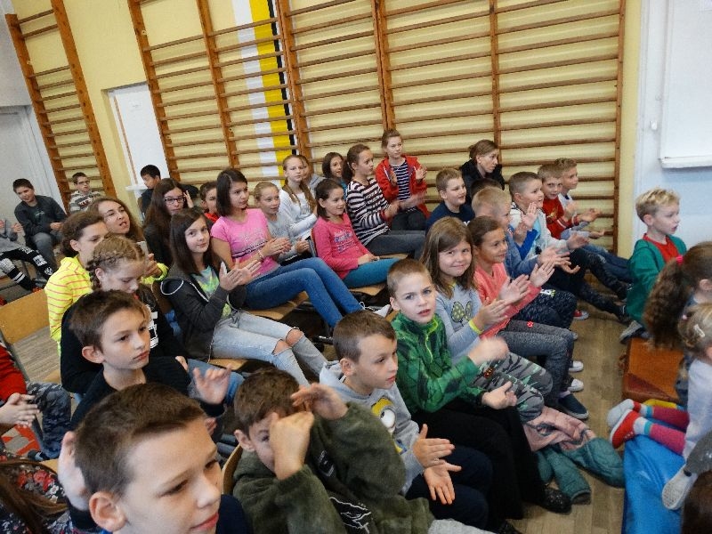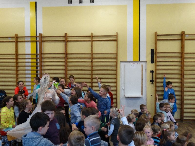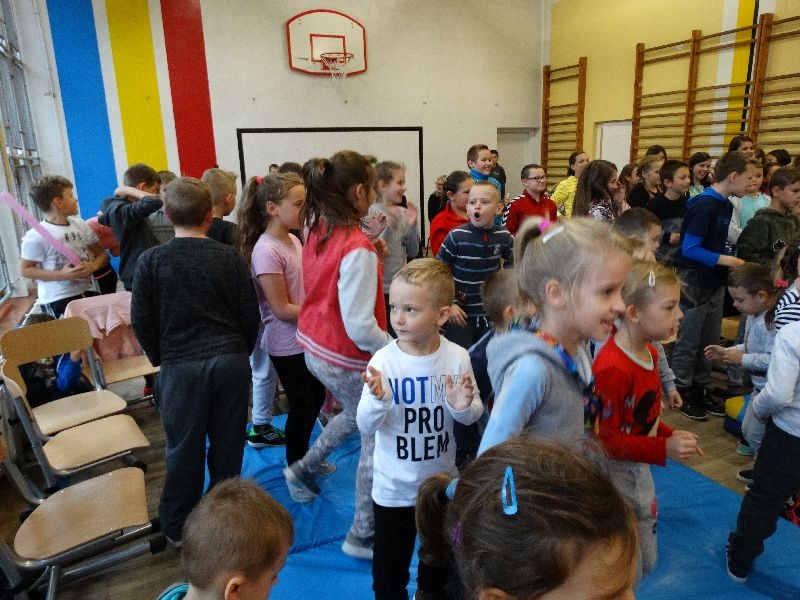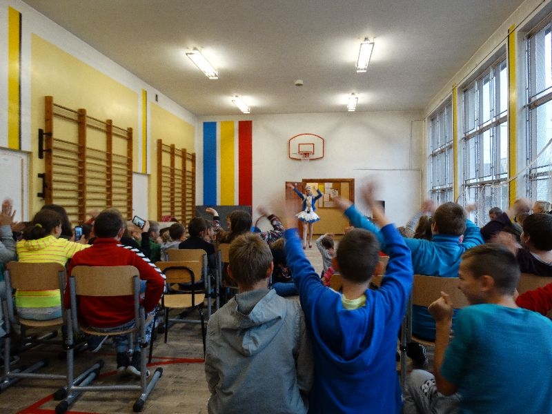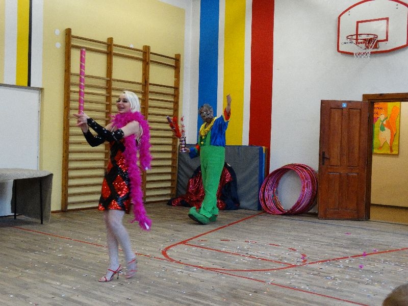 W tym dniu przybyła do nas dwuosobowa grupa cyrkowa ,która pokazała swoje umiejętności cyrkowe ,a szczególnie pani ,która popisywała się sprawnością i umiejętnościami żonglowania kółkiem hula hop. Mieli też swoje zwierzątka (króliki) ,które różniły się od tradycyjnych znanych ras i były specjalnie tresowane do wykonywania niektórych sztuczek m.in. przeskakiwania przez kółka i pchania wybranych zabawek. Ponadto było też kilka sztuczek magicznych z chusteczkami. Nasi uczniowie mogli także zademonstrować swoje umiejętności kręcenia kółkami hula hop. Na koniec uczniowie pod nadzorem prowadzącego wykonali pewną ewolucje gimnastyczną ,która polegała na utrzymaniu tzw. czworokąta przez kilka sekund .