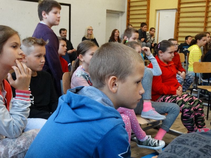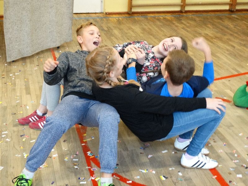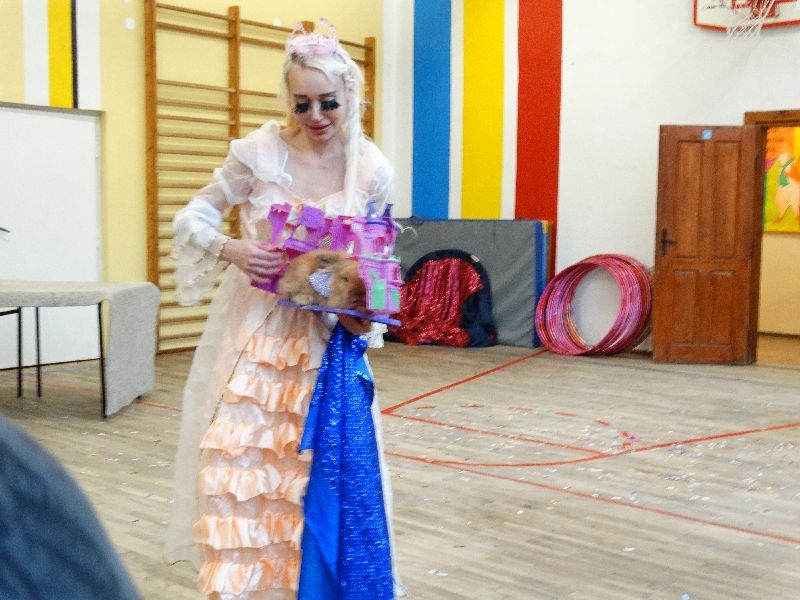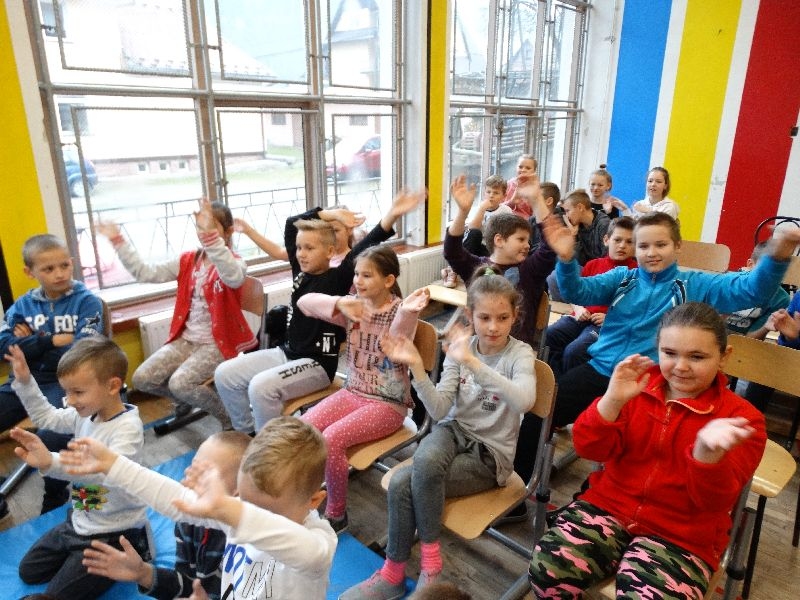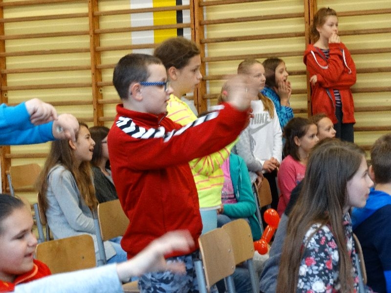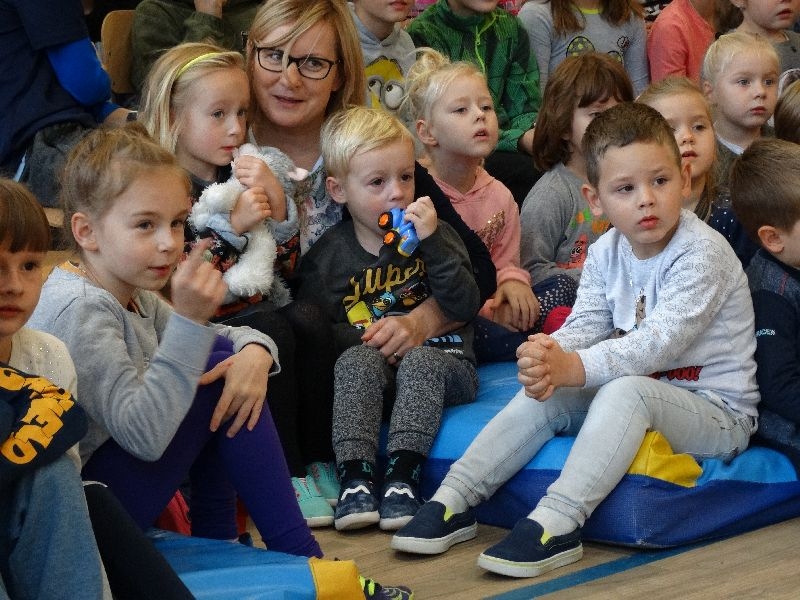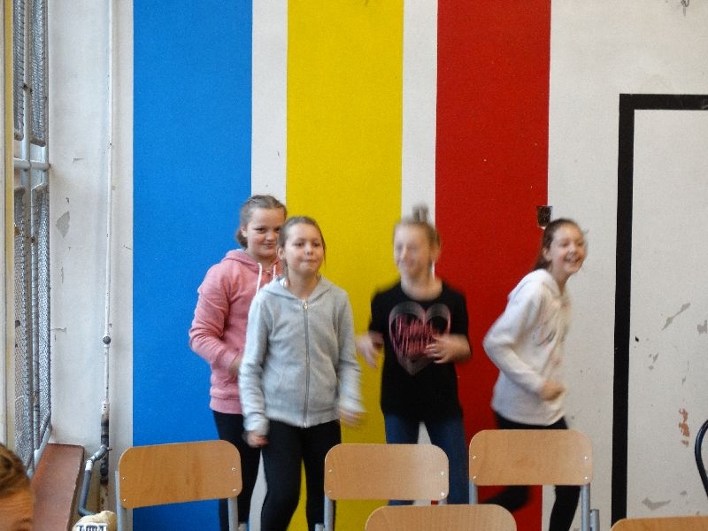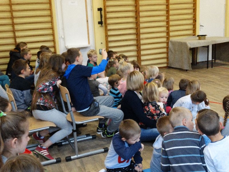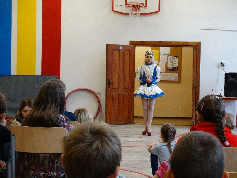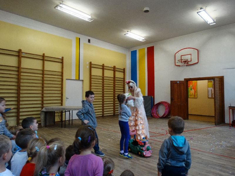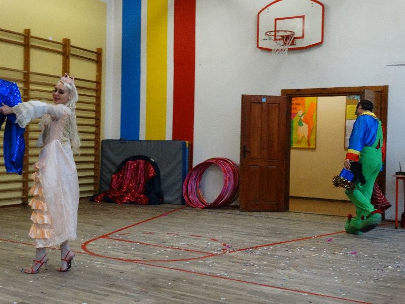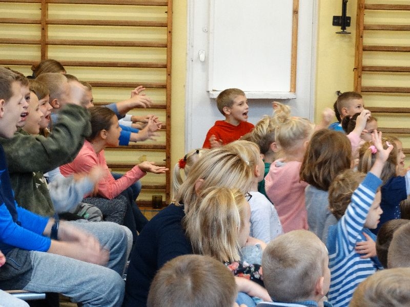 W tym dniu przybyła do nas dwuosobowa grupa cyrkowa ,która pokazała swoje umiejętności cyrkowe ,a szczególnie pani ,która popisywała się sprawnością i umiejętnościami żonglowania kółkiem hula hop. Mieli też swoje zwierzątka (króliki) ,które różniły się od tradycyjnych znanych ras i były specjalnie tresowane do wykonywania niektórych sztuczek m.in. przeskakiwania przez kółka i pchania wybranych zabawek. Ponadto było też kilka sztuczek magicznych z chusteczkami. Nasi uczniowie mogli także zademonstrować swoje umiejętności kręcenia kółkami hula hop. Na koniec uczniowie pod nadzorem prowadzącego wykonali pewną ewolucje gimnastyczną ,która polegała na utrzymaniu tzw. czworokąta przez kilka sekund .