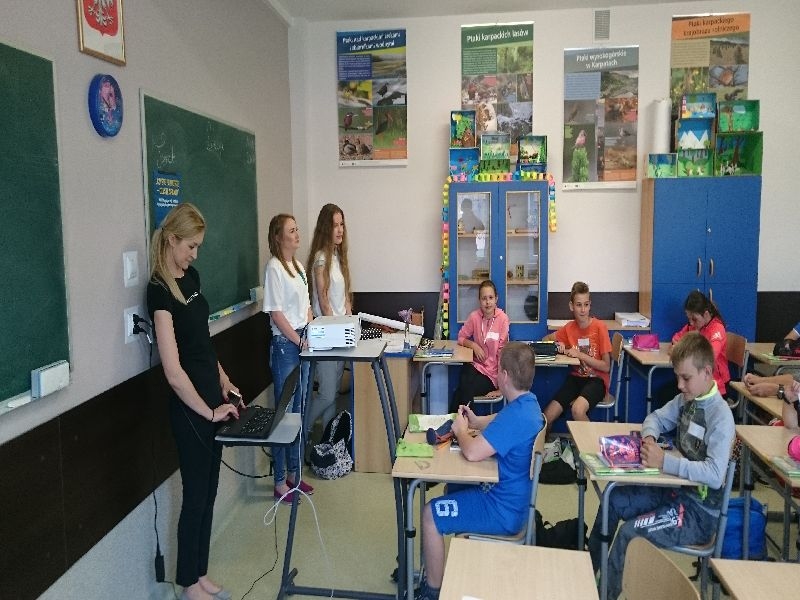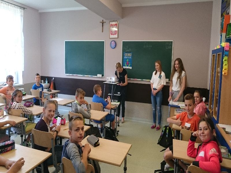 11 maja w naszej szkole odbyły się warsztaty edukacyjne w ramach programu edukacji ekologicznej, mającej na celu ograniczanie zjawiska smogu i niskiej emisji „ Czyste powietrze-czysta sprawa”. Celem programu jest przeciwdziałanie traktowania odpadów jako paliwa, zwiększanie stanu wiedzy związanej ze źródłami zanieczyszczeń w najbliższym otoczeniu oraz podejmowanie działań zwiększających świadomość zagrożeń związanych ze smogiem. Zajęcia dla klasy piątej zostały poprowadzone przez wolontariuszki Katolickiego Centrum Edukacji KANA w Nowym Sączu- Aleksandrę Malczak oraz Izabelę Maślankę, absolwentki naszej szkoły. Zajęcia miały formę warsztatów na które przeznaczono 2 godziny zajęć dydaktycznych. Wprowadzeniem do tematu była wykreślanka wyrazowa w grupach, po rozwiązaniu której uczniowie odgadywali hasło. Następnie uczniowie tworzyli mapę skojarzeniową w której wyrażeniem kluczowym było hasło „Niska emisja”. Po krótkiej dyskusji uczniowie mieli okazje obejrzeć dwa filmy pt:” Niska emisja” i „Kwaśne deszcze” . Kolejnym etapem zajęć było tworzenie osobistego oraz klasowego planu mobilności, gdzie uczniowie zaznaczali w jaki sposób przemieszczają się z domu do szkoły w ciągu całego tygodnia. Ostatnim zadaniem były teksty o tematyce ekologicznej , z którym grupy zapoznawały się a następnie wyznaczeni liderzy przekazywali najważniejsze informacje pozostałym grupom . Podsumowaniem zajęć był Quiz grupowy, po którym wszyscy uczniowie zostali nagrodzeni dyplomem, odznakami oraz drobnymi gadżetami. Bardzo dziękujemy Aleksandrze oraz Izabeli za przeprowadzenie warsztatów , oraz przekazanie wielu cennych informacji , ponieważ dzięki nim klasa piata może poszczycić się mianem KLASY CZYSTEGO POWIETRZA.