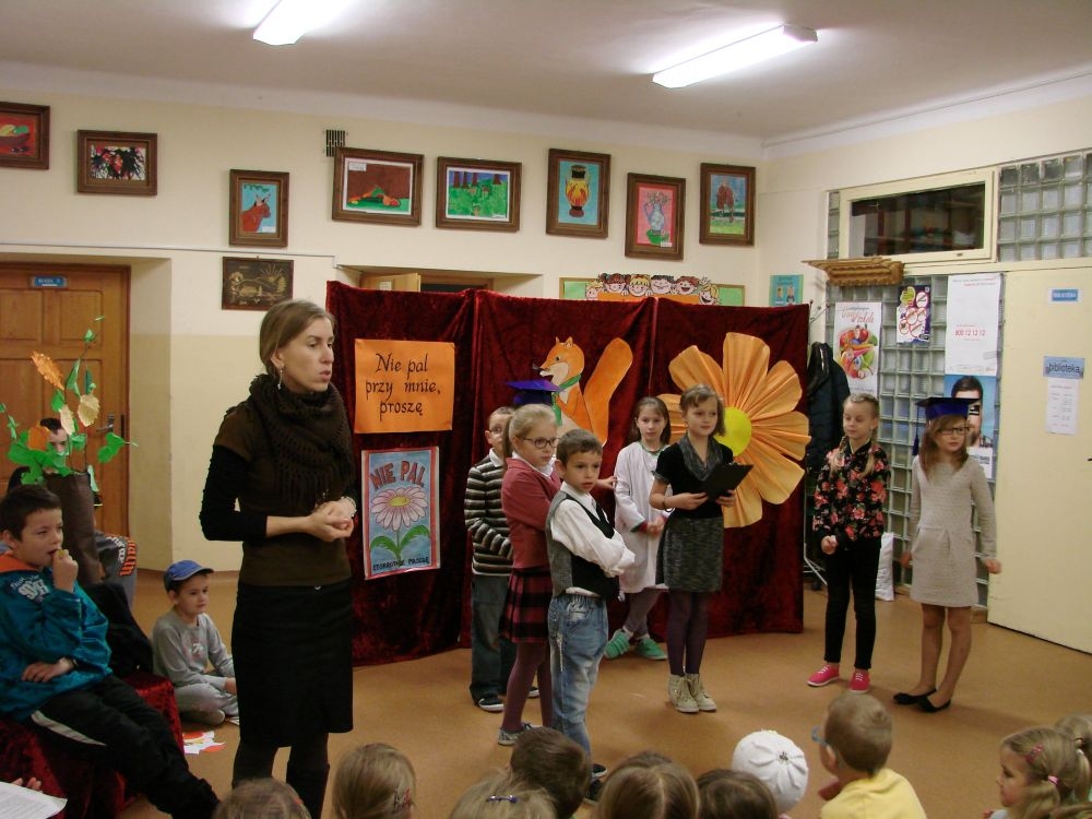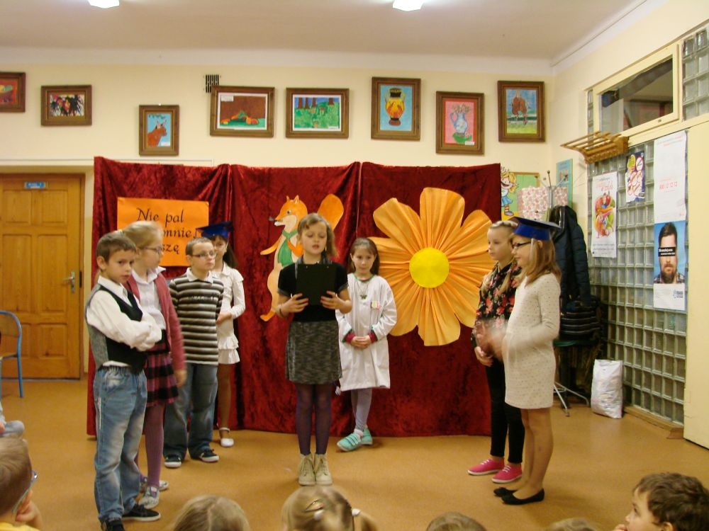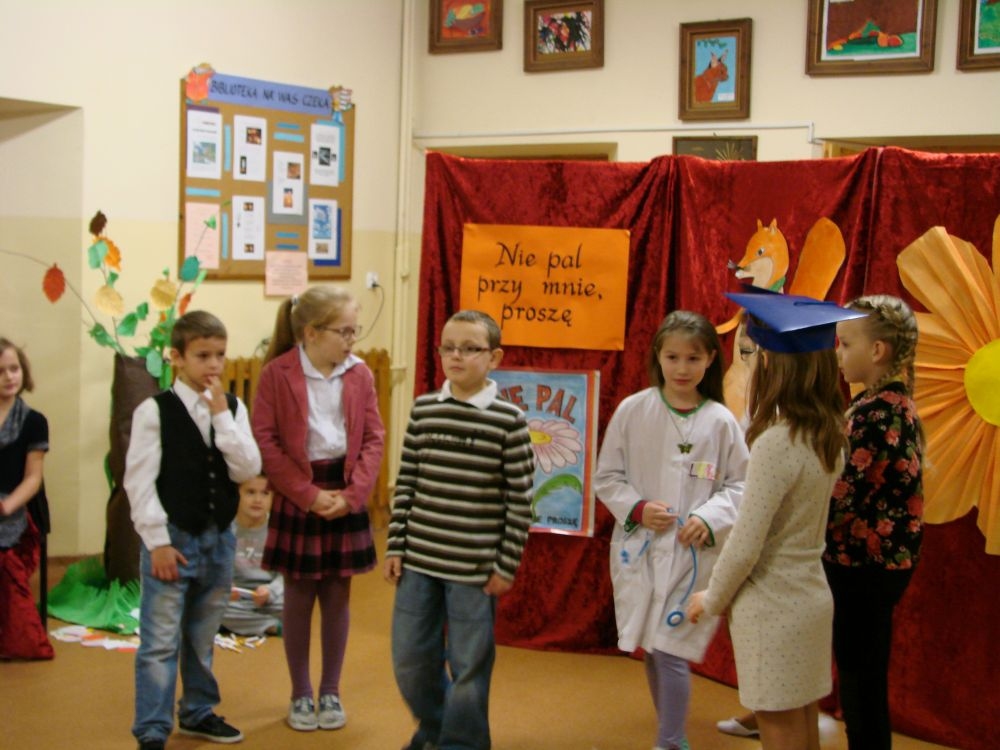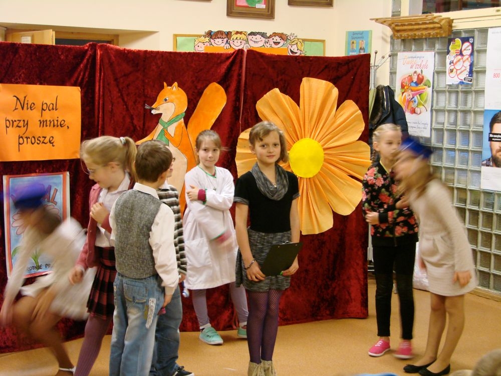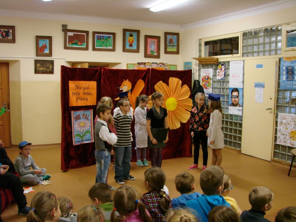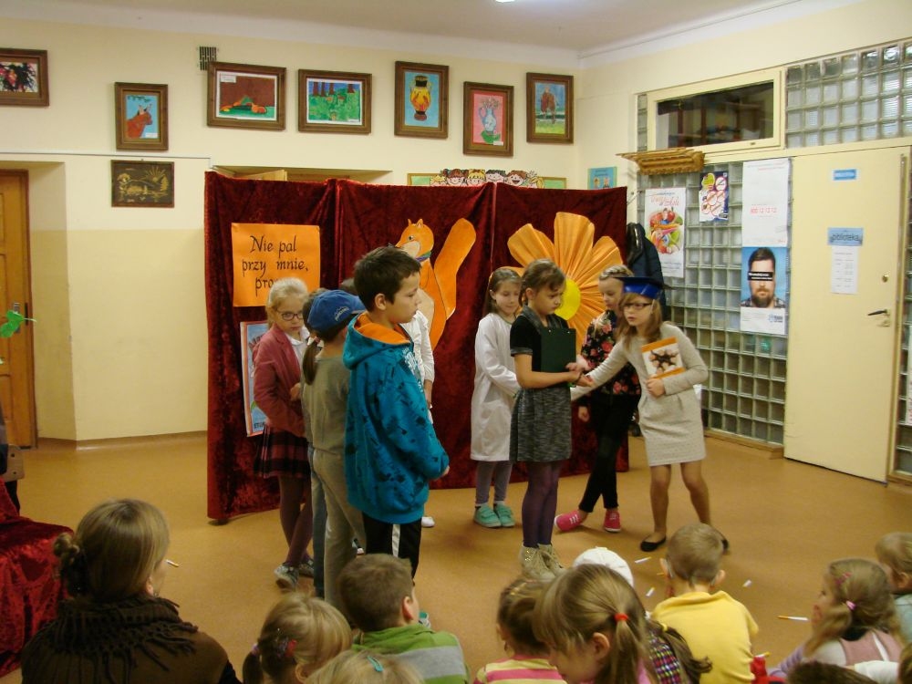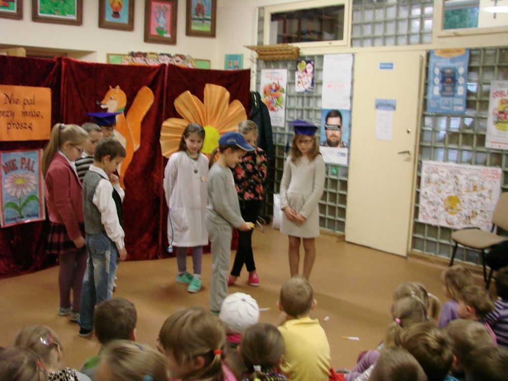 W Szkole Podstawowej w Kosarzyskach, w roku 2014/2015, realizujemy program edukacji antytytoniowej: „Nie pal przy mnie, proszę”. Jednym z elementów programu była inscenizacja zatytułowana „Papieros- to nie to!”. Dramę odegrały dzieci klasy III- 20 listopada, a więc w Światowy Dzień Rzucania Palenia. Inscenizacja ukazała losy palaczy, zarówno tych czynnych, jak i biernych. Niestety nie pomógł im nawet lekarz, który mógł tylko przestrzec przed paleniem i zachęcić uczniów do porozmawiania z rodzicami, starszymi, znajomymi, którzy palą, by rzucili ten straszny nałóg, niszczący nie tylko siebie, ale i innych. Bohaterowie naszej szkolnej scenki, demonstracyjnie zniszczyli papierosy, będące rekwizytami w odgrywanej dramie. Jednak dla palaczy nie jest to sprawa tak łatwa. Więc dobra rada dla wszystkich: lepiej trzymać się z dala od dymu papierosowego oraz od samego wroga- papierosa.