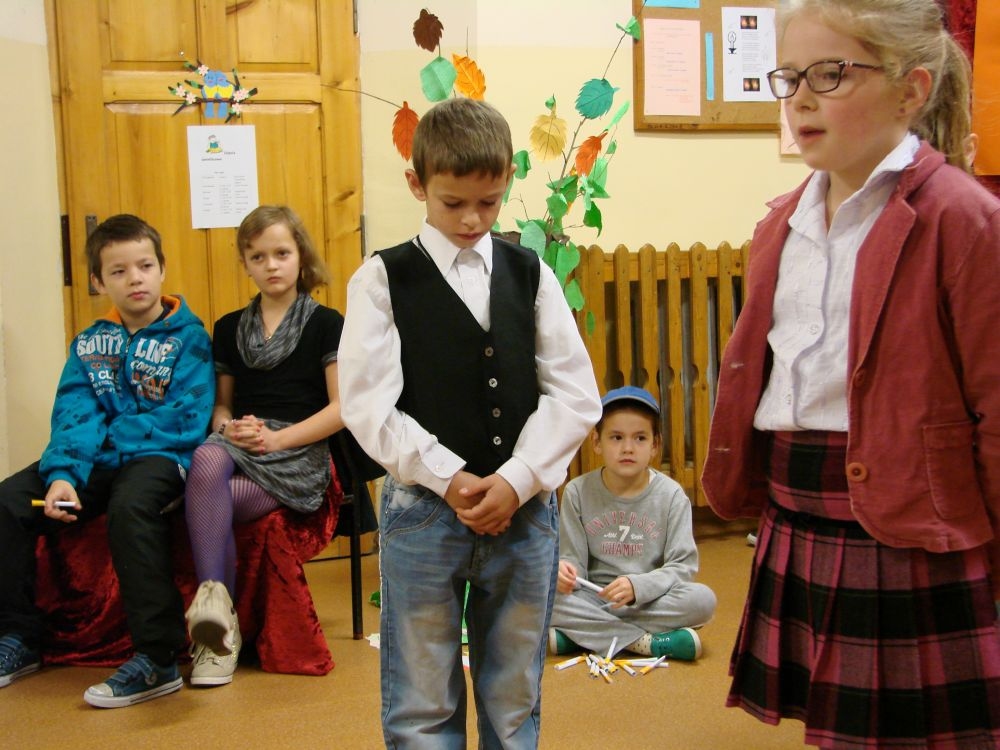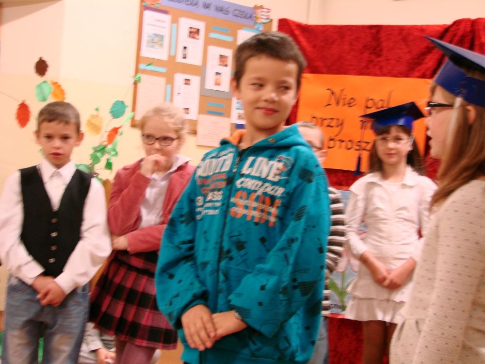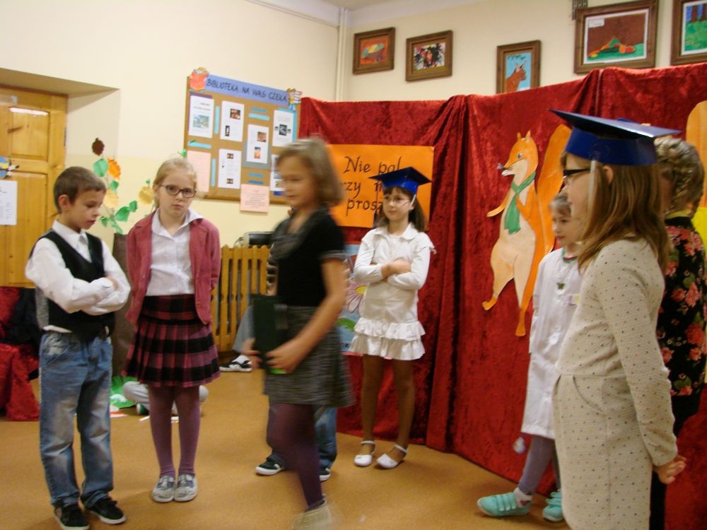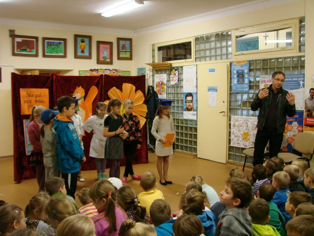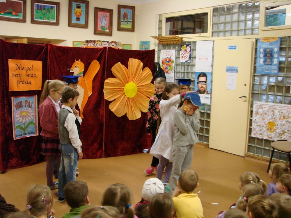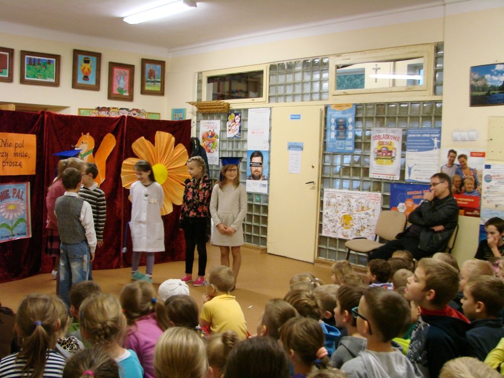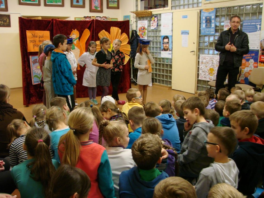 W Szkole Podstawowej w Kosarzyskach, w roku 2014/2015, realizujemy program edukacji antytytoniowej: „Nie pal przy mnie, proszę”. Jednym z elementów programu była inscenizacja zatytułowana „Papieros- to nie to!”. Dramę odegrały dzieci klasy III- 20 listopada, a więc w Światowy Dzień Rzucania Palenia. Inscenizacja ukazała losy palaczy, zarówno tych czynnych, jak i biernych. Niestety nie pomógł im nawet lekarz, który mógł tylko przestrzec przed paleniem i zachęcić uczniów do porozmawiania z rodzicami, starszymi, znajomymi, którzy palą, by rzucili ten straszny nałóg, niszczący nie tylko siebie, ale i innych. Bohaterowie naszej szkolnej scenki, demonstracyjnie zniszczyli papierosy, będące rekwizytami w odgrywanej dramie. Jednak dla palaczy nie jest to sprawa tak łatwa. Więc dobra rada dla wszystkich: lepiej trzymać się z dala od dymu papierosowego oraz od samego wroga- papierosa.