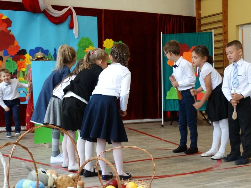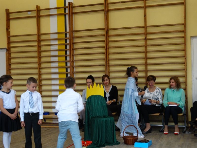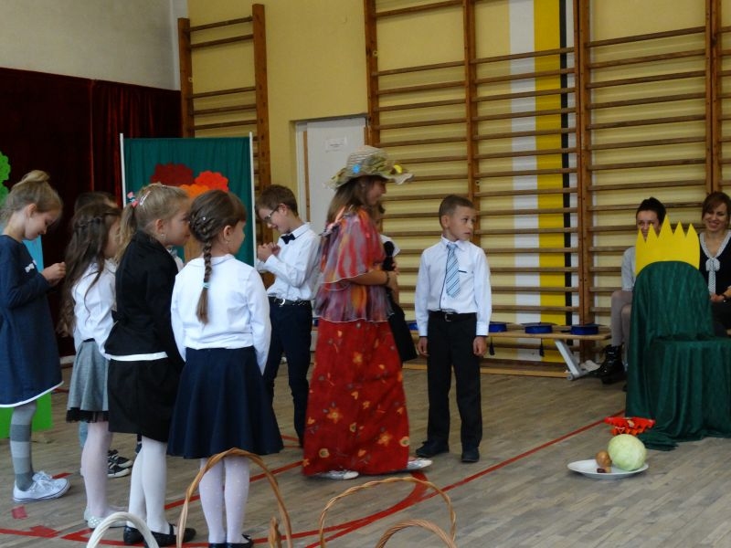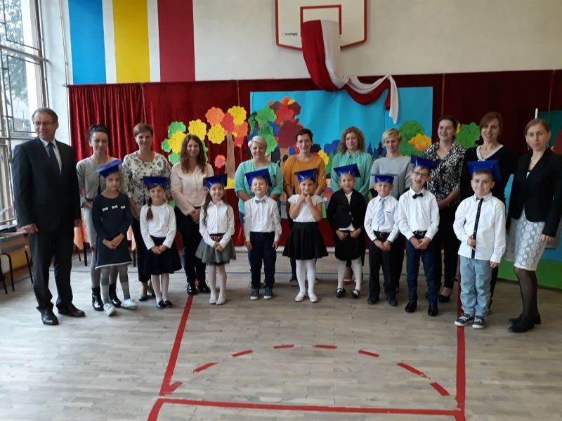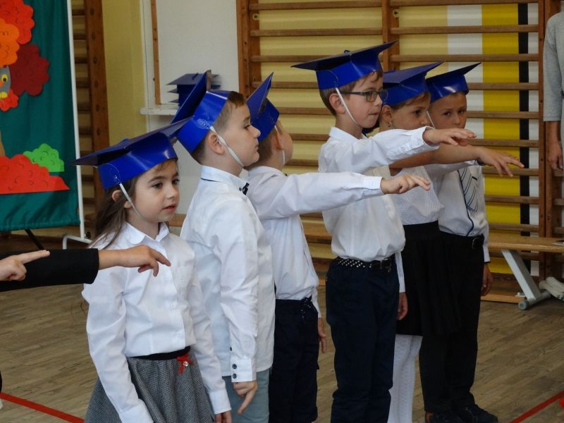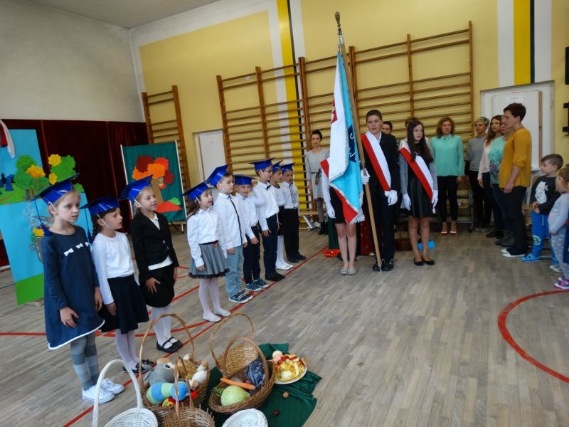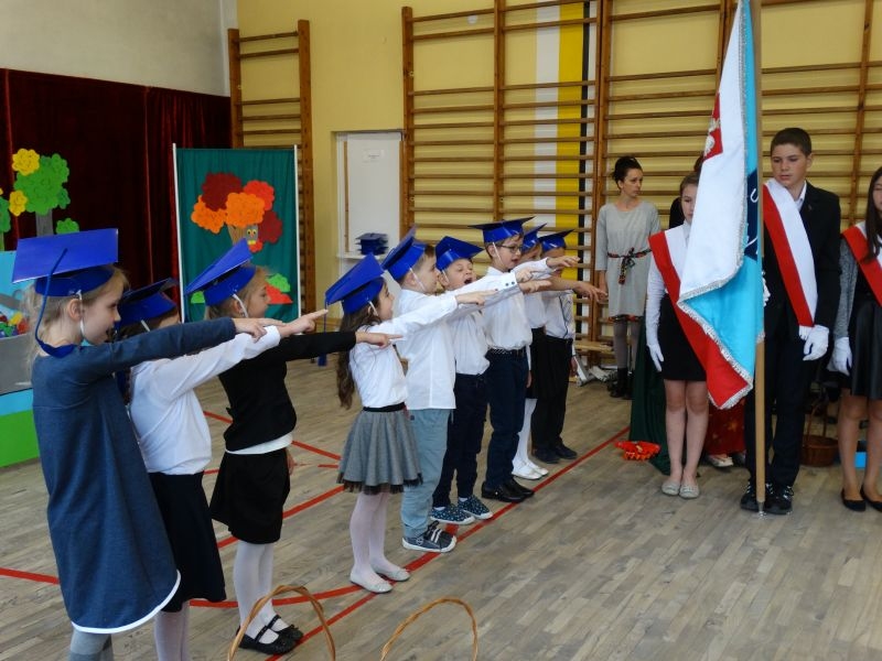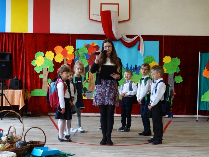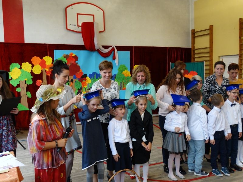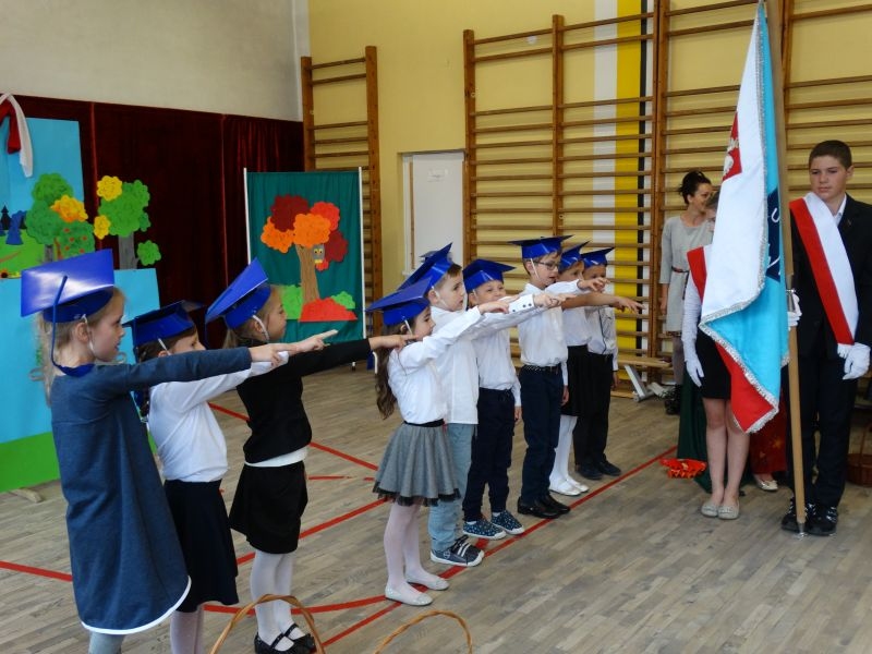 W dniu 27 września odbyła się w naszej szkole uroczystość Ślubowania klasy I. Do grona „nowych uczniów” dołączyło 5 dziewczynek i 4 chłopców. Uczniowie pokazali się od jak najlepszej strony. Przedstawiając zalety Jesieni, którą zaprosili na swoją uroczystość opowiedzieli o zdrowym stylu życia, witaminach ukrytych w owocach i warzywach. W przedstawieniu wziął udział również Wiatr, który poprowadził dzieci przez leśne tajemnice zwierząt gromadzących zapasy na zimę. Dzieci przeliczały dary jesieni, recytowały wiersze, tańczyły polkę, walczyka, krakowiaka, oberka…. śpiewając przy tym głośno i donośnie. Przeżywający zmagania swoich pociech Rodzice także w pewnym momencie dołączyli się do przedstawienia wykonując zadania przygotowane przez dzieci, jak również zadając zagadki każdemu z pierwszoklasistów. Po przedstawieniu, Pan Dyrektor - Marian Dobosz , pasował każdego z osobna na Ucznia naszej szkoły. Posłużył się w tej czynności ogromnym ołówkiem, który zostanie w pamięci każdego przywołanego do „katedry Przywódcy” szkoły. Dzieci z dumą wypowiedziały słowa ślubowania…. Na koniec otrzymały mnóstwo niespodzianek od swoich młodszych i starszych kolegów i koleżanek. Gościły się także podczas uroczystości w klasie.