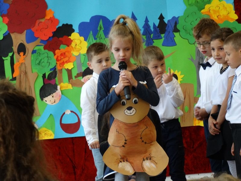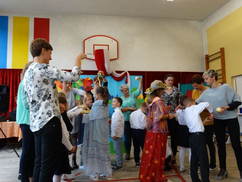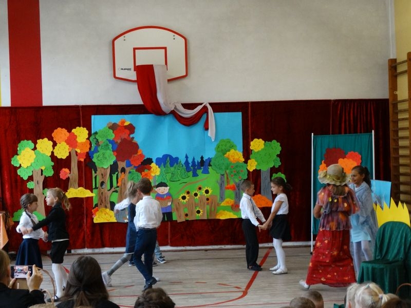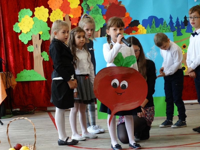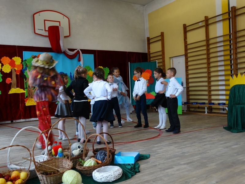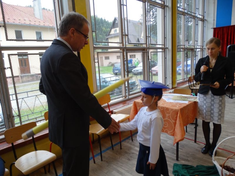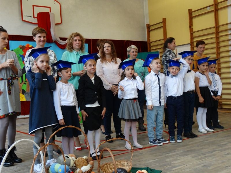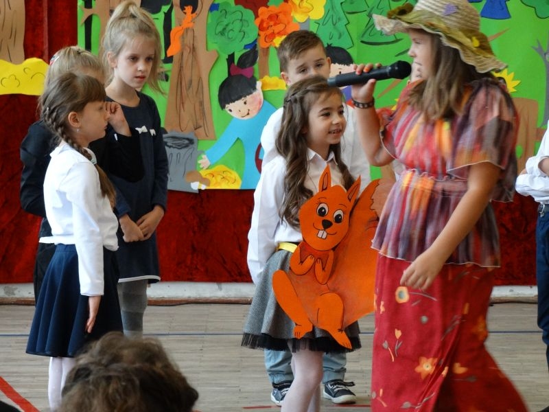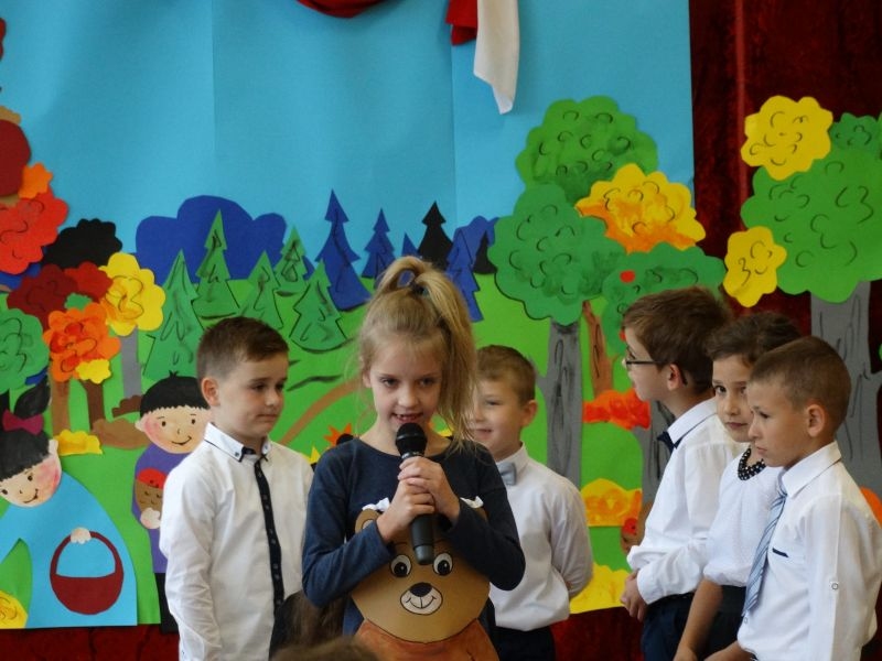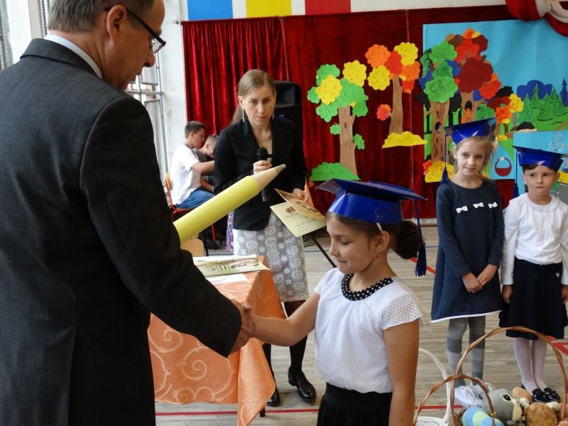 W dniu 27 września odbyła się w naszej szkole uroczystość Ślubowania klasy I. Do grona „nowych uczniów” dołączyło 5 dziewczynek i 4 chłopców. Uczniowie pokazali się od jak najlepszej strony. Przedstawiając zalety Jesieni, którą zaprosili na swoją uroczystość opowiedzieli o zdrowym stylu życia, witaminach ukrytych w owocach i warzywach. W przedstawieniu wziął udział również Wiatr, który poprowadził dzieci przez leśne tajemnice zwierząt gromadzących zapasy na zimę. Dzieci przeliczały dary jesieni, recytowały wiersze, tańczyły polkę, walczyka, krakowiaka, oberka…. śpiewając przy tym głośno i donośnie. Przeżywający zmagania swoich pociech Rodzice także w pewnym momencie dołączyli się do przedstawienia wykonując zadania przygotowane przez dzieci, jak również zadając zagadki każdemu z pierwszoklasistów. Po przedstawieniu, Pan Dyrektor - Marian Dobosz , pasował każdego z osobna na Ucznia naszej szkoły. Posłużył się w tej czynności ogromnym ołówkiem, który zostanie w pamięci każdego przywołanego do „katedry Przywódcy” szkoły. Dzieci z dumą wypowiedziały słowa ślubowania…. Na koniec otrzymały mnóstwo niespodzianek od swoich młodszych i starszych kolegów i koleżanek. Gościły się także podczas uroczystości w klasie.