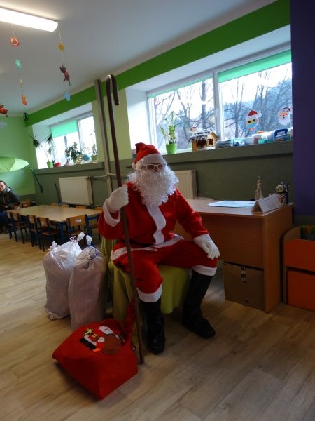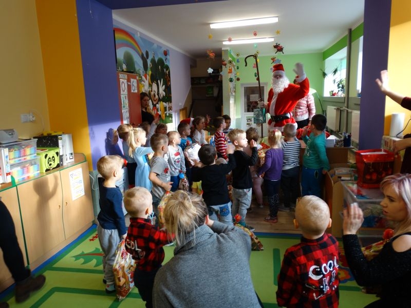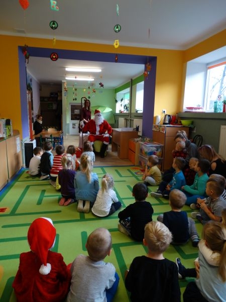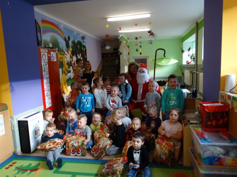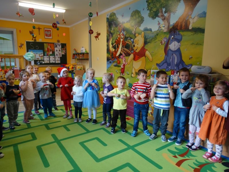 i wyczekiwanego gościa, św. Mikołaja. Wizyta świętego Mikołaja w naszym przedszkolu, to jeden z najbardziej oczekiwanych przez dzieci dni w roku. Przygotowują się do niego starannie. Przedszkolaki przygotowały wiersz oraz piosenkę, które zaprezentowały przed wyjątkowym gościem. Dzieci uwielbiają te przygotowania i mimo, że zajmują im one wiele czasu, robią to z wielką przyjemnością. Nadszedł wreszcie długo oczekiwany dzień. Wszystkie dzieci już od samego rana z wielką niecierpliwością spoglądały na drzwi, nasłuchiwały „Mikołajowych” dzwoneczków. Wszyscy bardzo przeżywali to spotkanie. Dzieci dzielnie zaśpiewały przygotowaną piosenkę i rozmawiały z Mikołajem, oczywiście chwaliły się, że są bardzo grzeczne . Mikołaj wręczył każdemu dziecku wspaniały prezent i musiał się pożegnać, ponieważ czekały na niego jeszcze inne dzieci. Przedszkolaki długo wspominały ten dzień, wyglądając przy tym przez okno w nadziei, że jeszcze zobaczą mknące po niebie sanie Mikołaja.