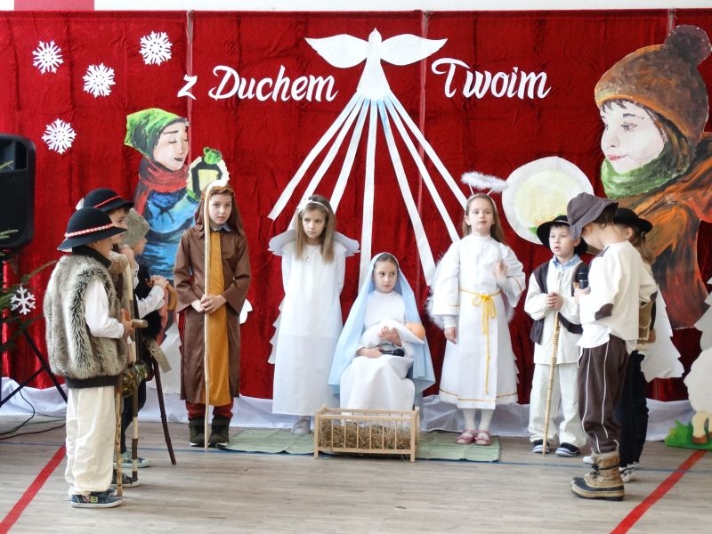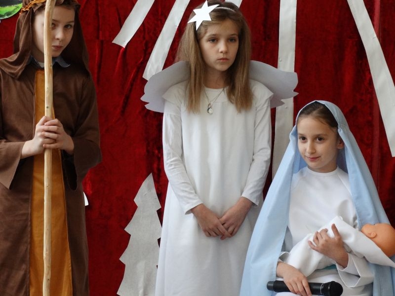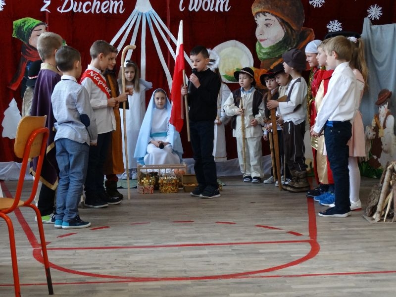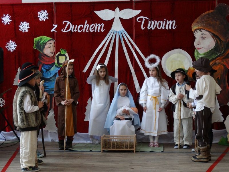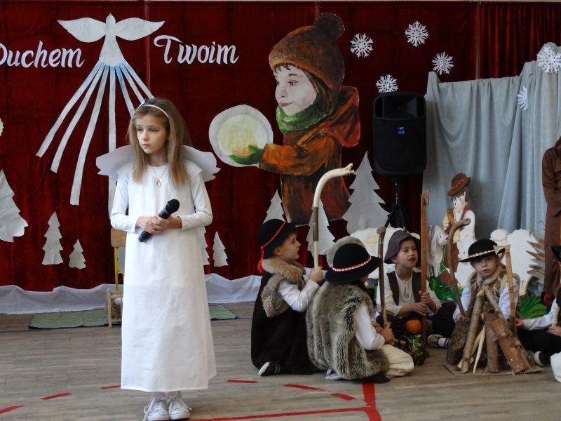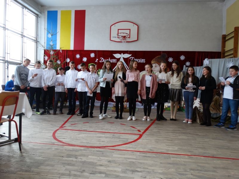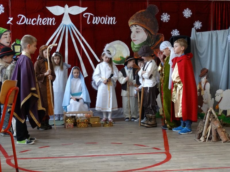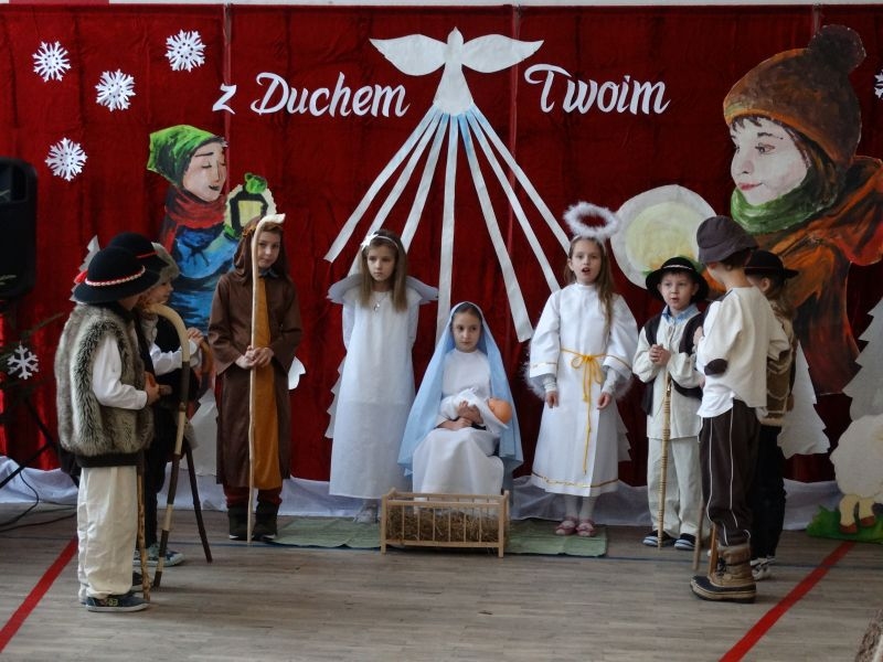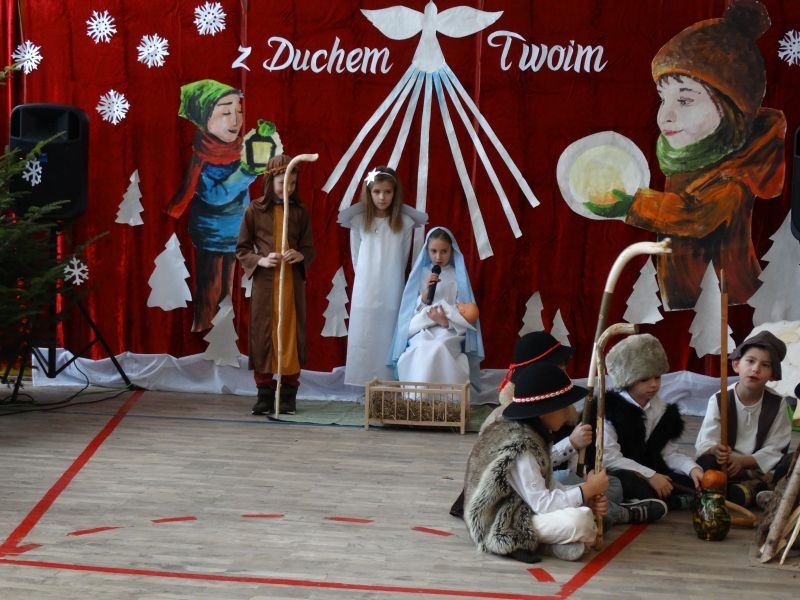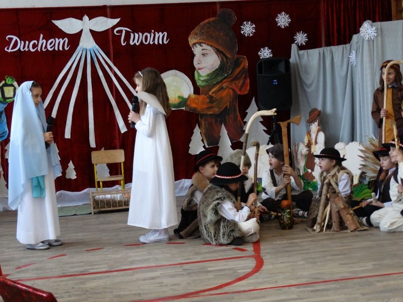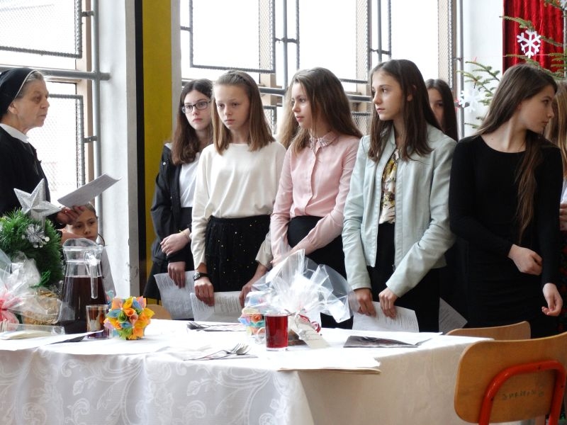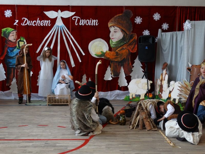 W dniu 21.12.2018 r. w naszej szkole odbyły się tradycyjne Jasełka ,które obrazowały nadejście nowonarodzonego Jezusa Chrystusa. Przedstawiła je młodsza grupa uczniów, która została przygotowana przy współpracy nauczycieli z klas młodszych. Koordynowała to wszystko siostra Agnieszka. Następnie połamano się tradycyjnym opłatkiem składając sobie wzajemnie życzenia świąteczno – noworoczne. W dalszej kolejności odbyła się chyba największa wigilia szkolna w MiG Piwniczna Zdrój bo zasiadło do stołu około 150 uczestników. Zaprezentowano świąteczne stroiki konkursowe i nagrodzono najlepsze.Na koniec każda z klas zaśpiewała po jednej wybranej kolędzie.