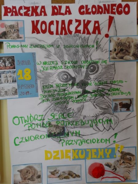 Uczniowie z klas siódmej oraz ósmej i ich rodzice upiekli pyszne ciasta, które następnie były tłumnie kupowane przez dzieci, nauczycieli oraz pozostałych pracowników szkoły. Zebrano 380 złotych. Za powyższe fundusze zakupiono karmę dla kotów. Przekazano ją Towarzystwu Opieki nad Zwierzętami w Nowym Sączu. Wyżej wymienione działania pokazały wielką wrażliwość, a także zaangażowanie młodzieży w pomoc potrzebującym. Podkreśliły, że cierpienie