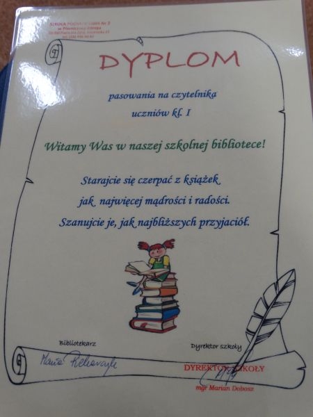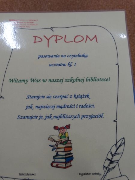 Zgodnie z tradycją naszej szkoły, dnia 28 lutego, odbyło się uroczyste pasowanie uczniów klasy I na czytelników biblioteki. Przejęci pierwszoklasiści, w obecności całej społeczności uczniowskiej, obejrzeli inscenizację przygotowaną przez koleżanki i kolegów z klas IV - VII. Gdy uczniowie udowodnili, że potrafią czytać i znają zasady obchodzenia się z książką, pan dyrektor pasował ich na czytelników biblioteki. Na zakończenie nowi czytelnicy otrzymali zakładki do książek oraz pamiątkowy dyplom.