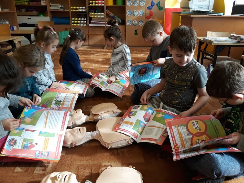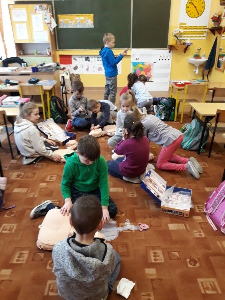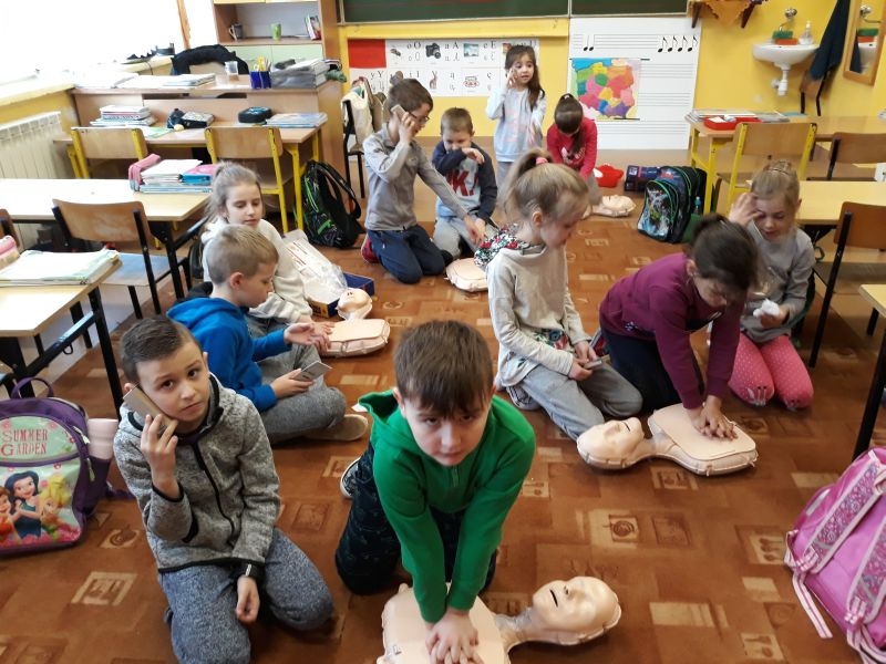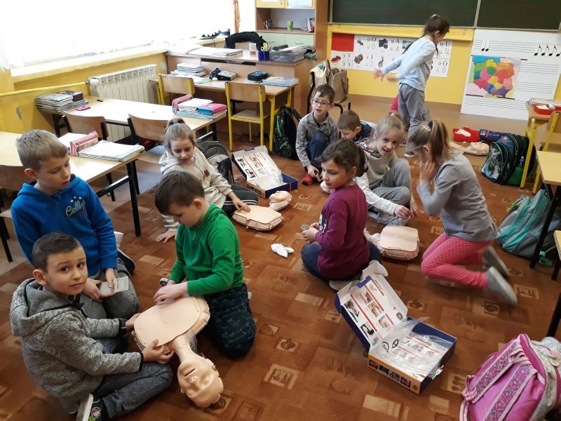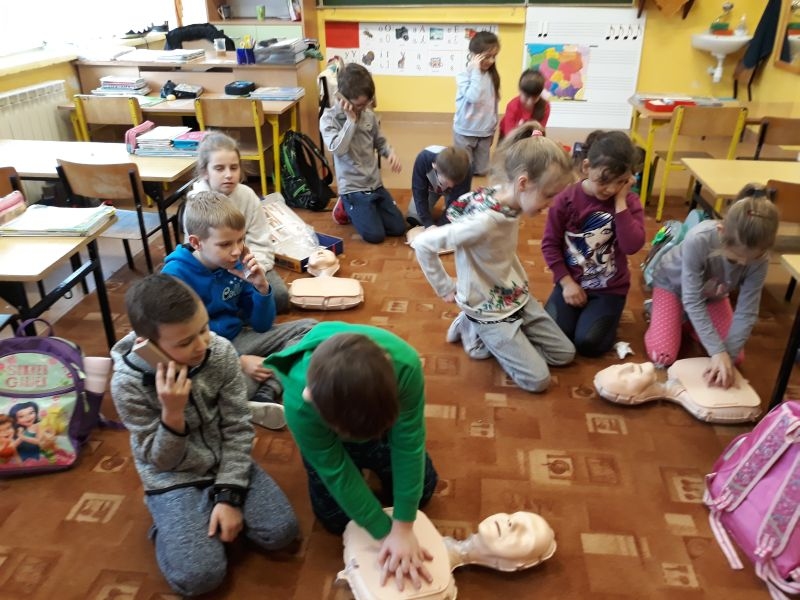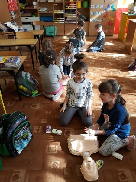 W marcu klasa I oraz klasa II uczyła się udzielania I pomocy. Najpierw odbył się słowny instruktaż, następnie dzieci obejrzały filmiki ilustrujące kolejność zachowań podczas ratowania życia. Później same (pod bacznym okiem nauczyciela) zmierzyły się z trudnym zadaniem. Dzieci nauczyły się też definicji pierwszej pomocy- która obejmuje zespół czynności podejmowanych w celu ratowania osoby w stanie nagłego zagrożenia zdrowotnego. Czynności te podejmuje osoba znajdująca się na miejscu zdarzenia. Dzieci wiedzą, że ich głównym zadaniem podczas pojawienia się niebezpieczeństwa jest wykonanie telefonu na pogotowie, policję bądź straż pożarną, w zależności od sytuacji. Pierwszo i drugoklasiści wiedzą, jakie są etapy postępowania w razie nagłego, niebezpiecznego zdarzenia. Brzmią one następująco: