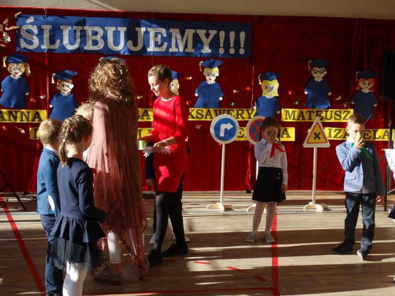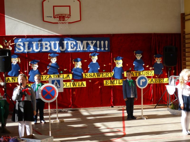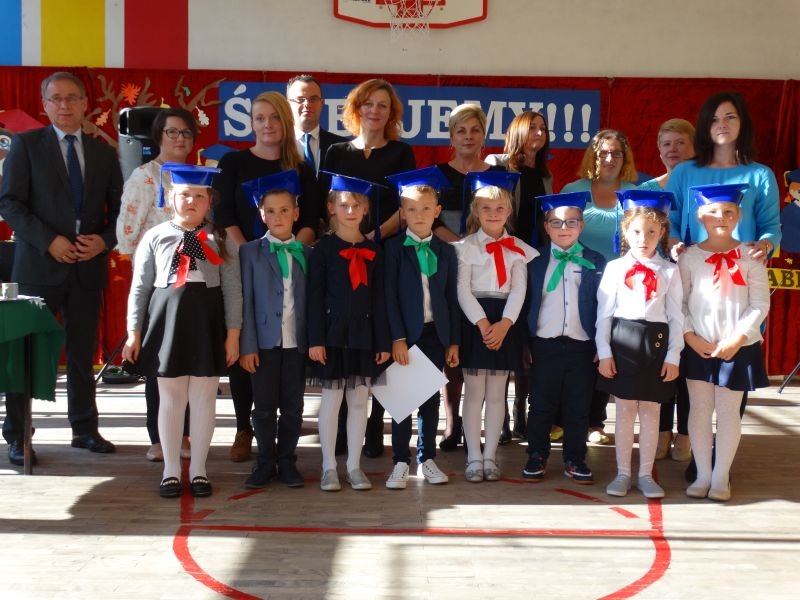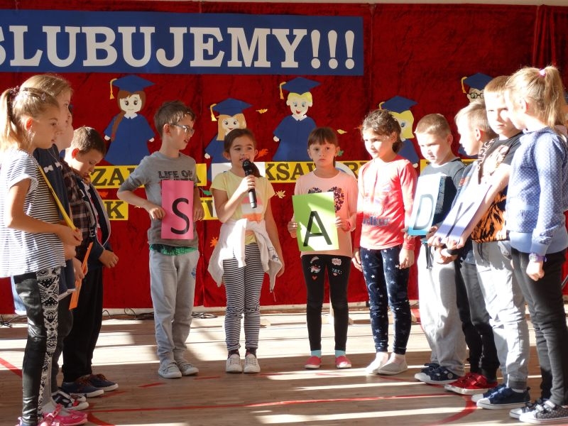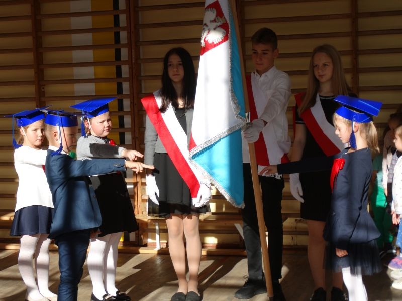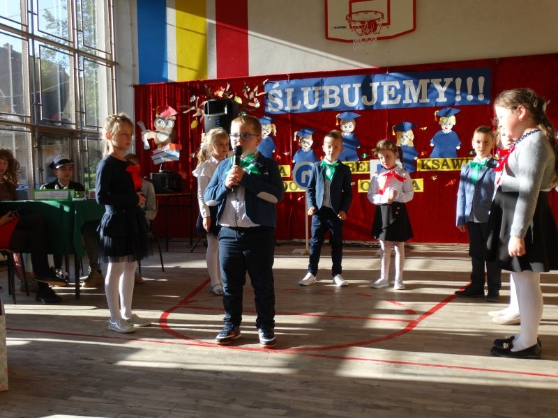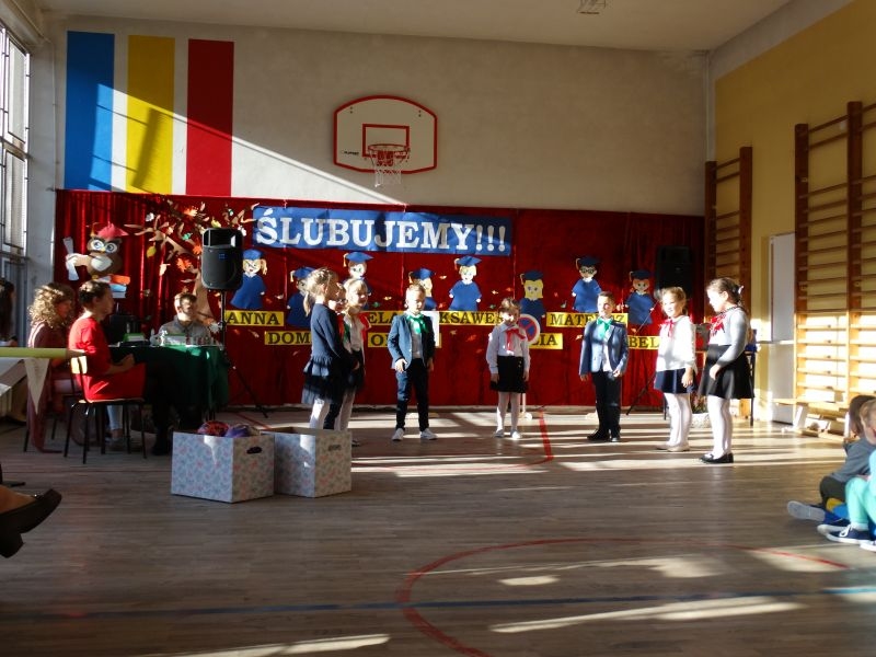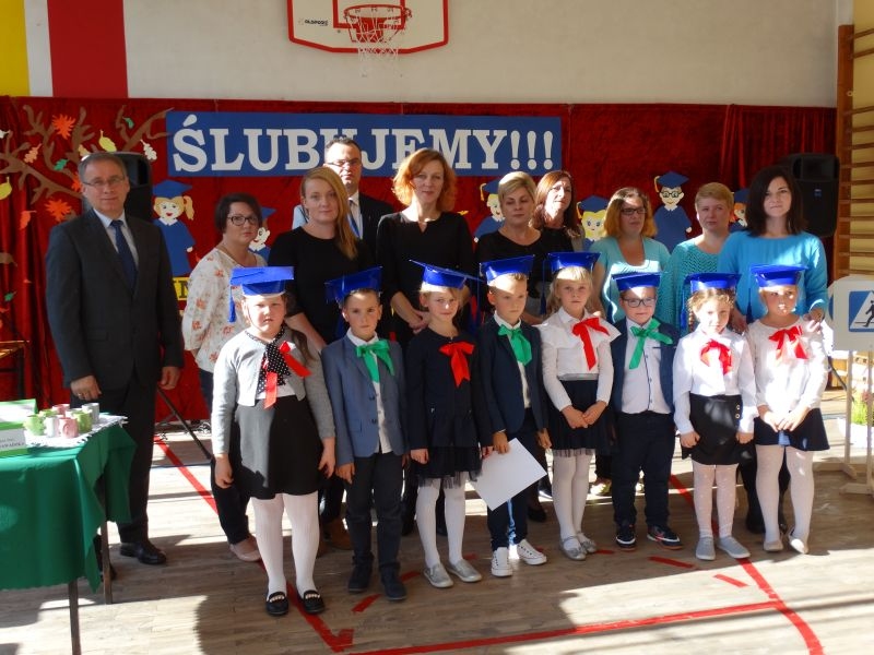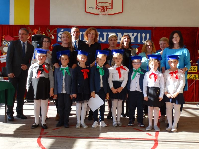 10 października od samego rana w Szkole Podstawowej nr 2 w Kosarzyskach panowała podniosła atmosfera .Dzieci ubrane w świąteczny strój galowy, przepiękna dekoracja na sali gimnastycznej, przygotowany sprzęt nagłaśniający - to wszystko po to, aby ślubowanie pierwszaków wypadło jak najbardziej uroczyście. Ośmioro małych uczniów, w tym pięć dziewczynek i trzech chłopców zaprezentowało się po raz pierwszy na scenie wśród całej społeczności szkolnej oraz wzruszonych rodziców. Znajomość przepisów ruchu drogowego, pięknie zaśpiewane piosenki, przyjaźń i koleżeństwo w grupie rówieśniczej to dowód, że dzieci są gotowe do sumiennej pracy w szkole i wiedzą, że czeka ich więcej obowiązków oraz pilna praca. Występom dzieci przyglądała się komisja, składająca się z uczniów starszych klas, którzy wcielili się w role: Doroty Zawadzkiej – superniani, Magdy Gessler – znawczyni kuchni i smacznego odżywiania , komendanta Policji- czuwającego nad bezpieczeństwem dzieci oraz generała Wojska Polskiego .Dzieci wzięły udział w teście dla Pierwszaka, który zdali celująco. Po części artystycznej w niezwykle podniosłej atmosferze, przed pocztem sztandarowym pierwszacy ślubowali być dobrymi Polakami, godnie reprezentować swoją szkołę, swym zachowaniem i nauką sprawiać radość rodzicom i nauczycielom. Po złożeniu ślubowania pan dyrektor Marian Dobosz dokonał symbolicznego pasowania na ucznia. "Pasuję Cię na ucznia" - mówił pan dyrektor, dotykając ołówkiem - jak czarodziejską różdżką ramion swoich podopiecznych. Nie zabrakło życzeń i prezentów od rodziców oraz wszystkich uczniów. W klasie czekała na pierwszoklasistów niespodzianka , przygotowana przez rodziców- kolorowo udekorowana balonikami i serpentynami sala oraz słodki poczęstunek. Ten dzień , pełen wrażeń i wzruszeń na długo zapadnie w pamięci wszystkich zebranych.. Wszystkim dzieciom życzymy sukcesów w dalszej nauce, a rodzicom zadowolenia ze swoich pociech. Do grona społeczności szkolnej wstąpili: Izabela Broniszewska, Oliwia Jaworska, Emilia Lichoń, Mateusz Maślanka, Anna Pawlik, Dominik Smajdor, Ksawery Wojciechowski oraz Izabela Wójcik.