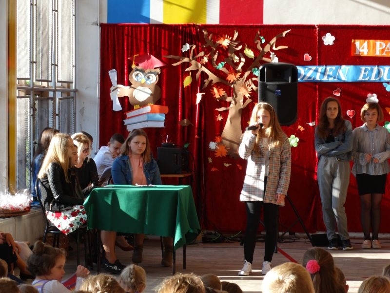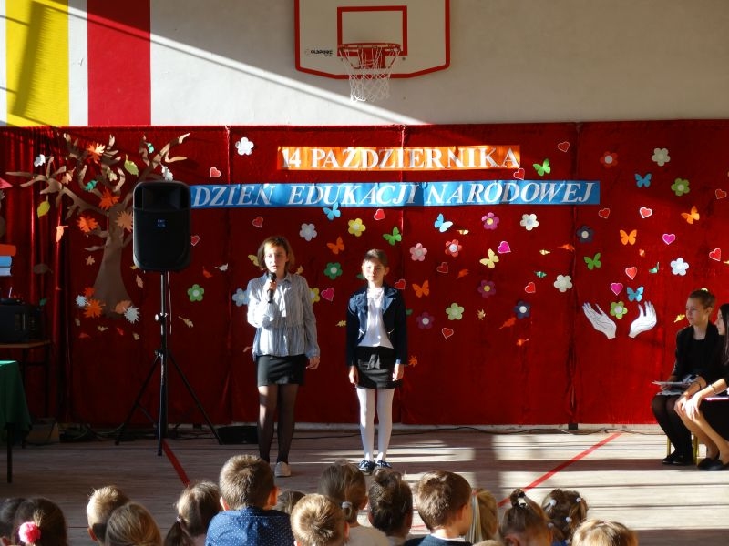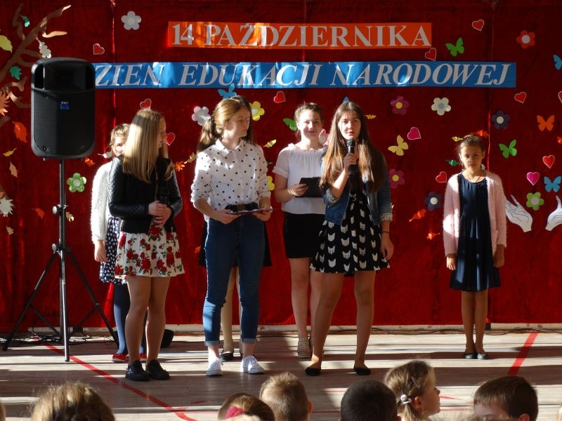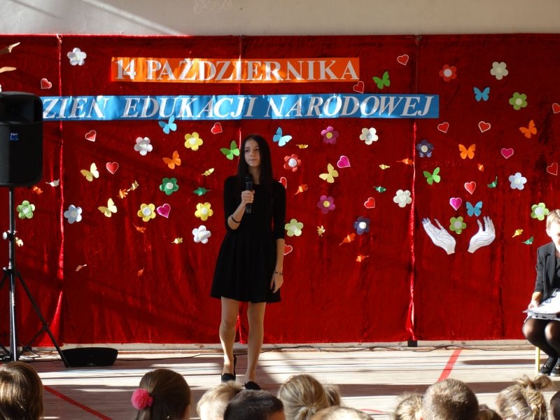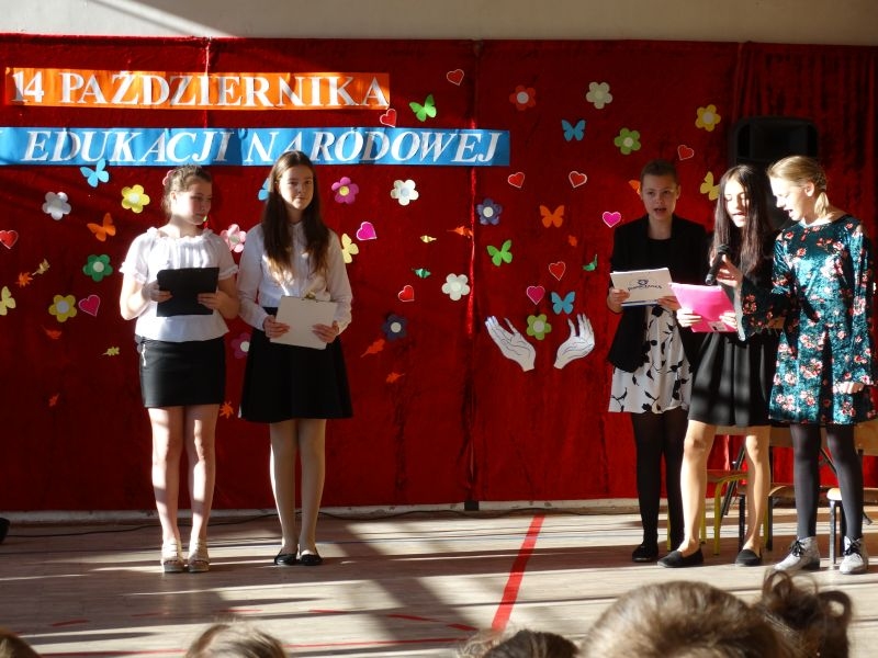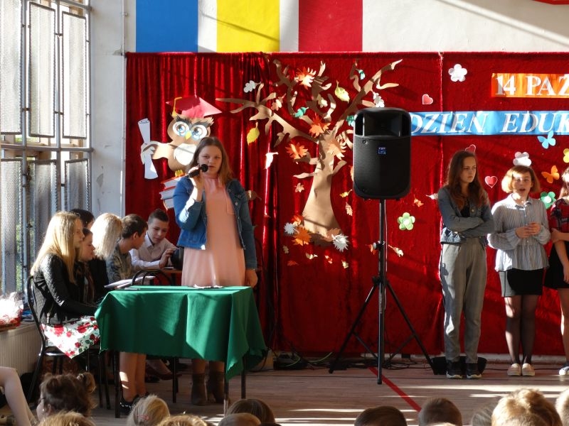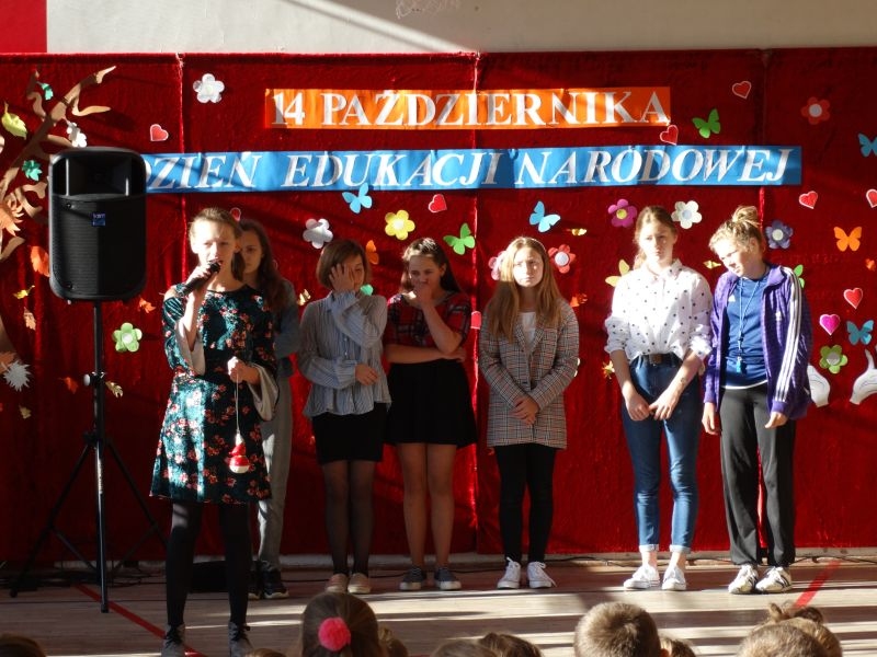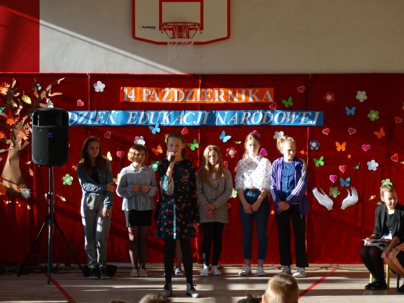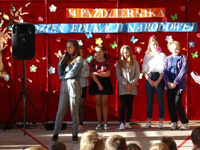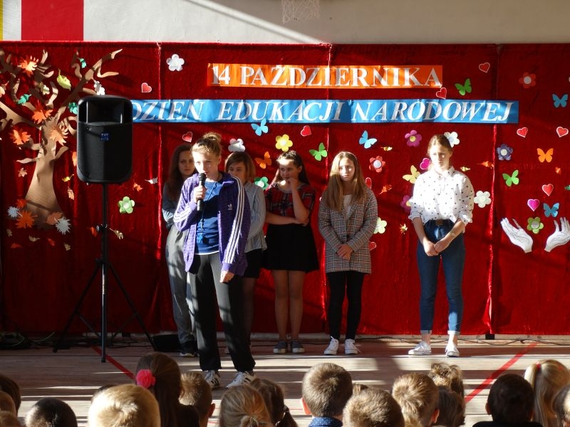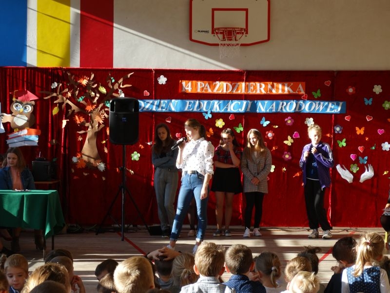 Tym wierszem 11 października 2019 roku, rozpoczęła się uroczysta akademia z okazji Święta Edukacji Narodowej. Cała społeczność szkolna spotkała się na przedstawieniu przygotowanym przez uczniów klas V-VIII. Poprzez deklamację pięknych wierszy, młodzi artyści wyrazili podziękowanie swoim nauczycielom za zaangażowanie, wytrwałość, każdą radę, chwilę rozmowy, za codzienny przykład jak być mądrym i dobrym człowiekiem. Nie zabrakło również pięknych nastrojowych piosenek wykonanych przez uzdolnione wokalnie uczennice z klasy VII – Aleksandrę Lichoń, Oliwię Miechurską i Ewelinę Wielocha.