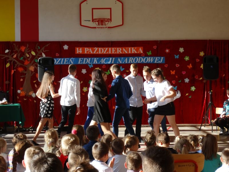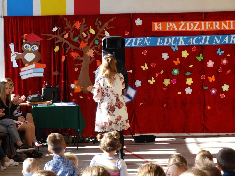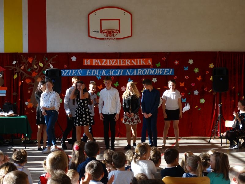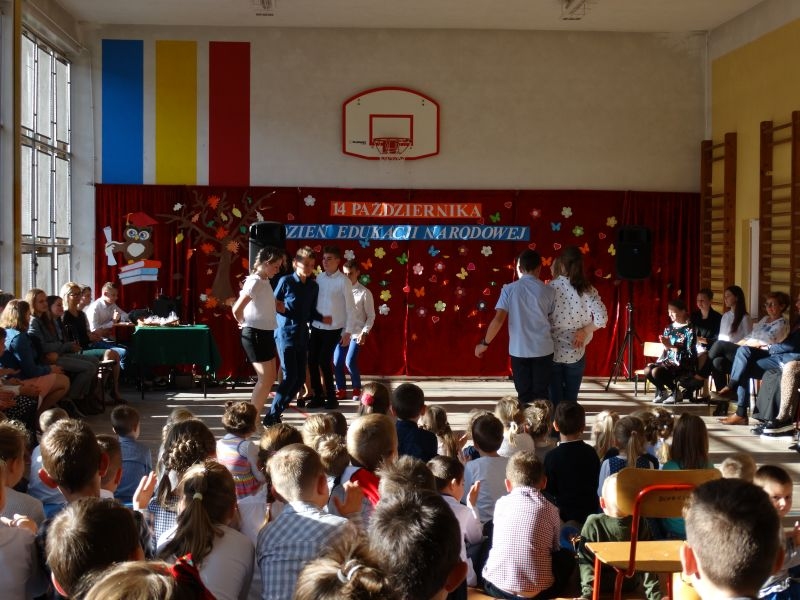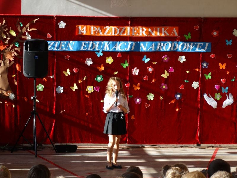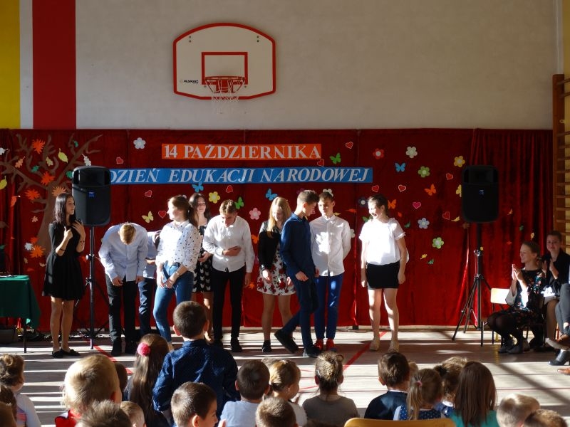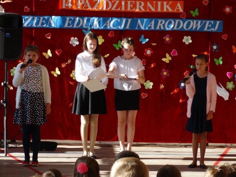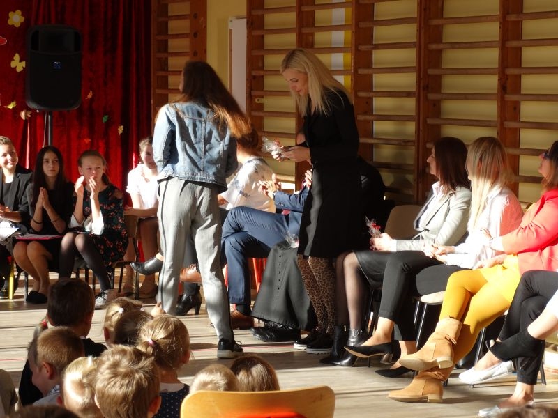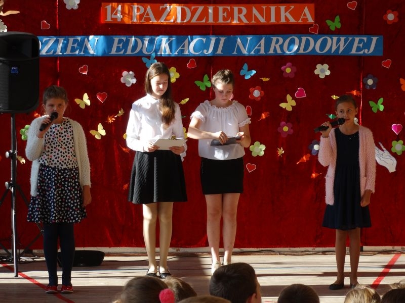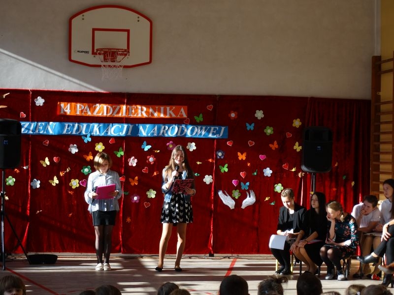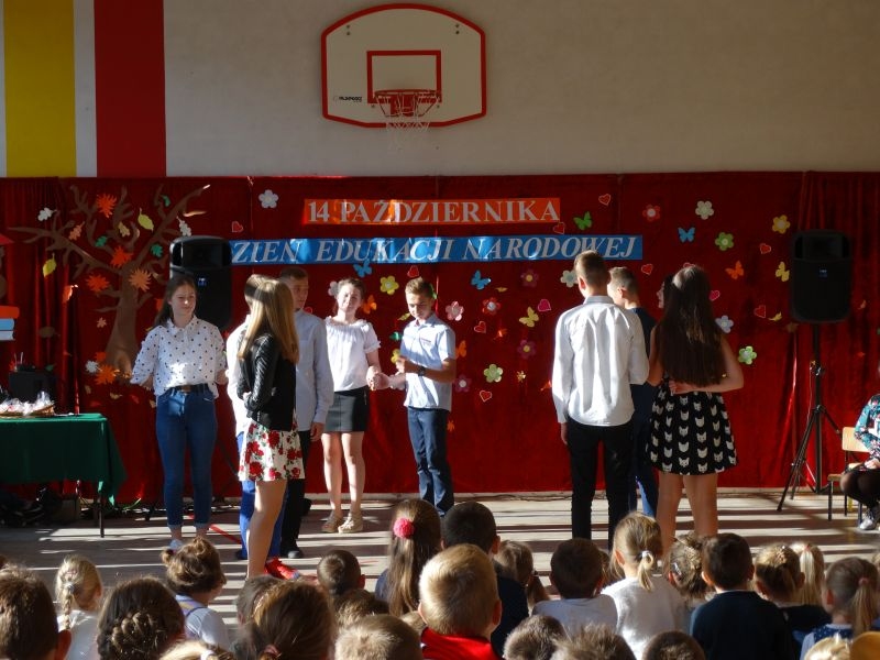 Tym wierszem 11 października 2019 roku, rozpoczęła się uroczysta akademia z okazji Święta Edukacji Narodowej. Cała społeczność szkolna spotkała się na przedstawieniu przygotowanym przez uczniów klas V-VIII. Poprzez deklamację pięknych wierszy, młodzi artyści wyrazili podziękowanie swoim nauczycielom za zaangażowanie, wytrwałość, każdą radę, chwilę rozmowy, za codzienny przykład jak być mądrym i dobrym człowiekiem. Nie zabrakło również pięknych nastrojowych piosenek wykonanych przez uzdolnione wokalnie uczennice z klasy VII – Aleksandrę Lichoń, Oliwię Miechurską i Ewelinę Wielocha.