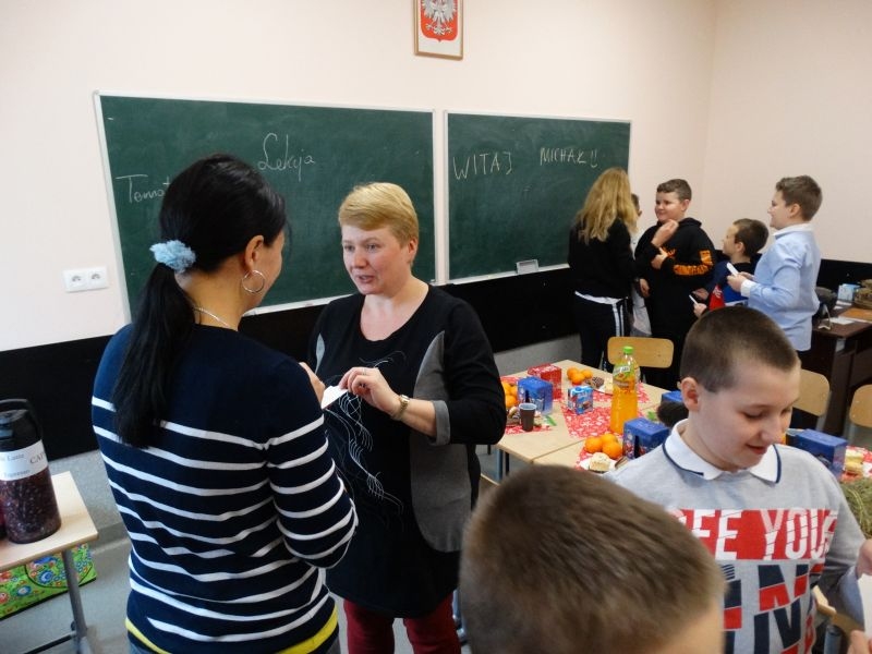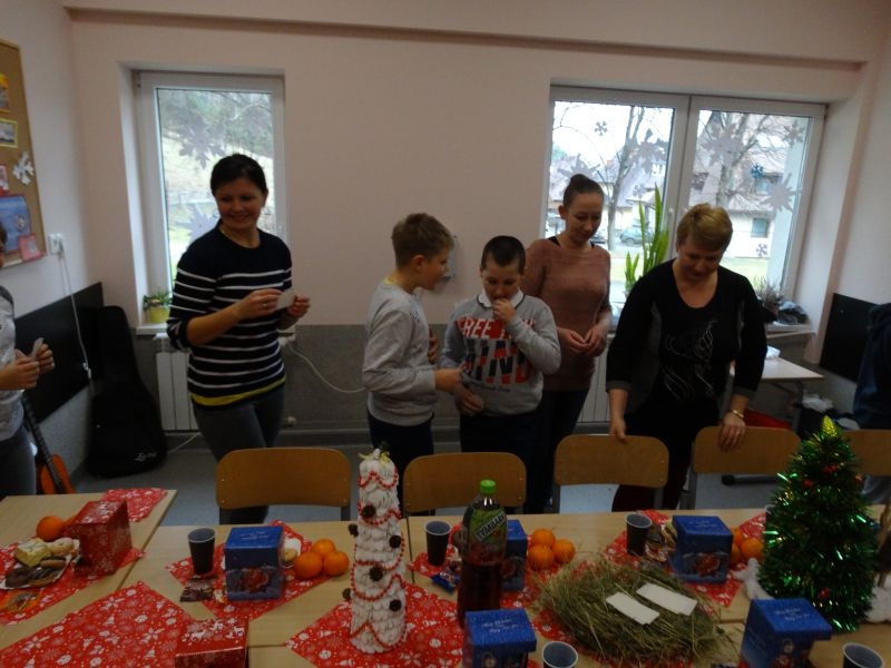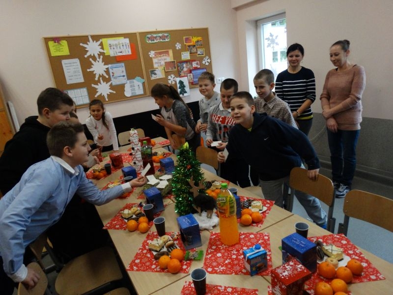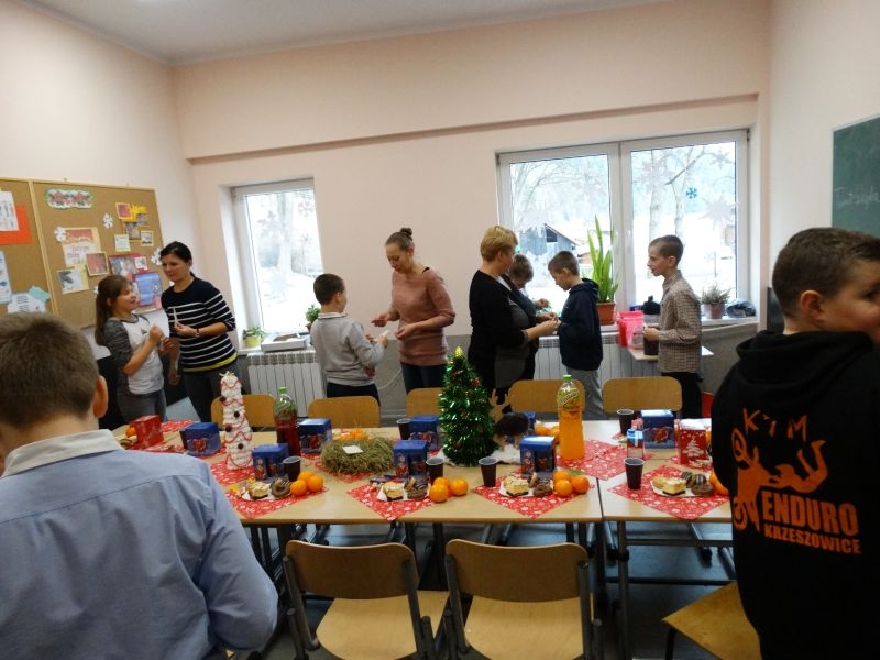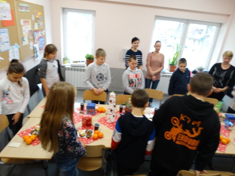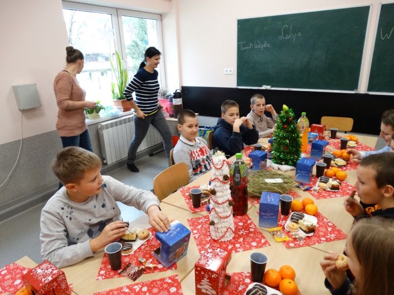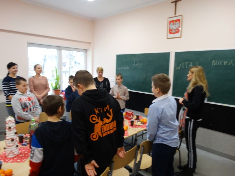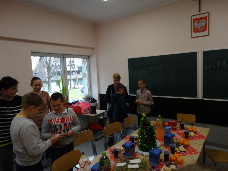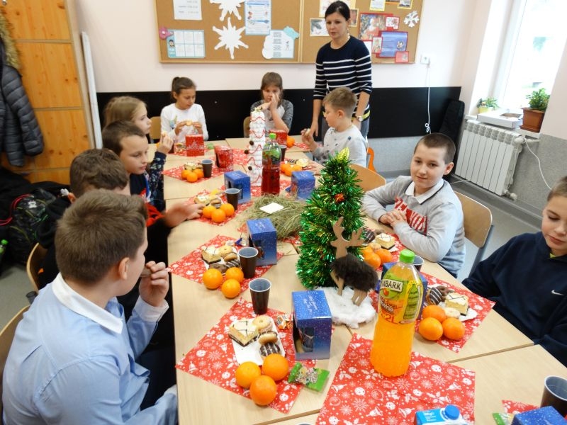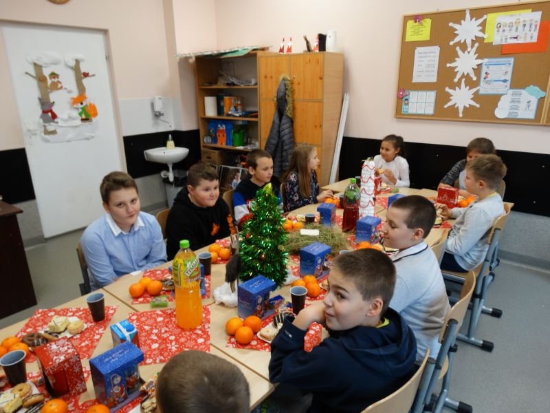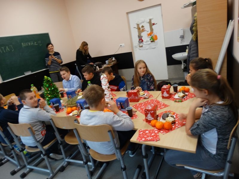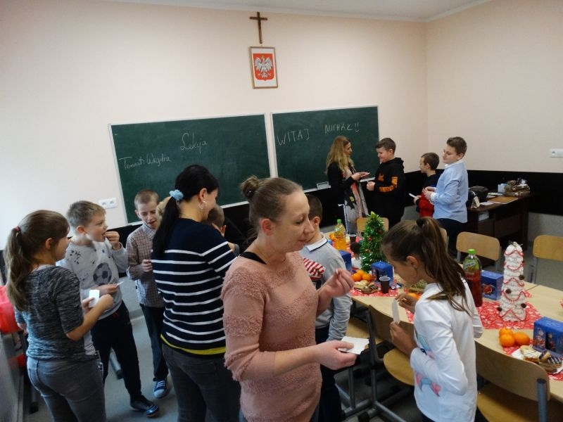 W tym dniu klasa V zorganizowała klasową wigilię na którą zaproszono ucznia tej klasy Michała Franczyka ,który ze względów zdrowotnych nie mógł uczęszczać do szkoły przez kilka miesięcy. Była to miła niespodzianka dla tego ucznia i znów mógł się spotkać ze swoimi koleżankami , kolegami i porozmawiać na różne tematy. Byli też obecni rodzice, którzy pomogli zorganizować to spotkanie pod względem kulinarnym . Zaproszono dyr.szk. i uczestniczyła też wychowawczyni klasy p.Agata Świeboda. Składano sobie wzajemnie życzenia łamiąc się symbolicznym opłatkiem i uczniowie mieli okazję posłuchać kolęd i pastorałek. Jedna z uczennic na gitarze zagrała kilka z nich.