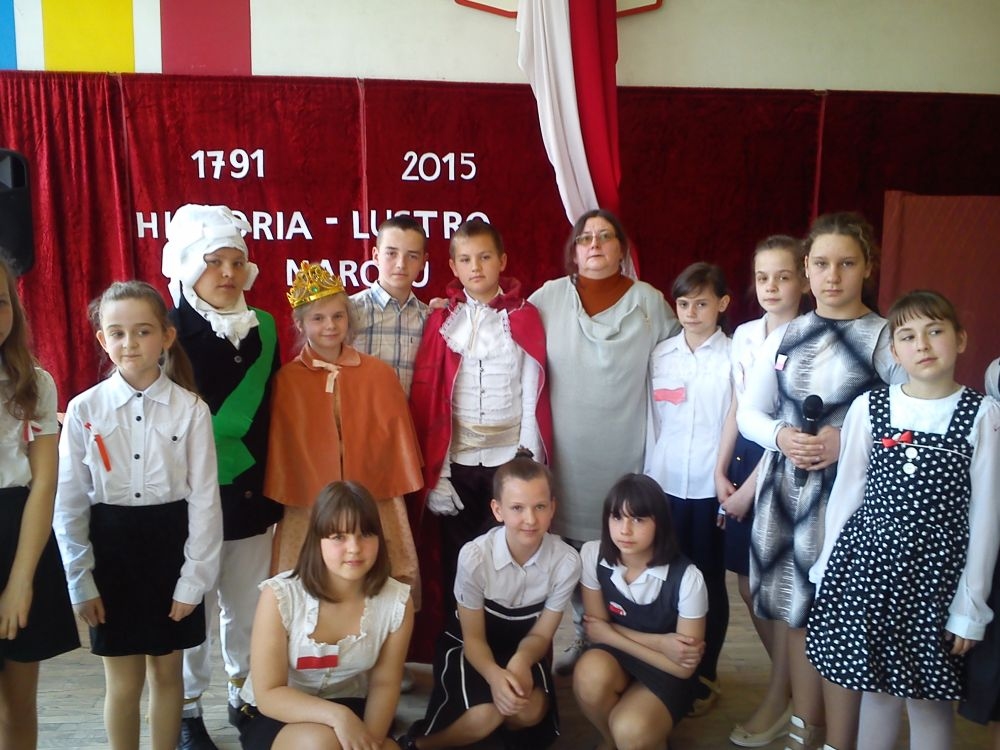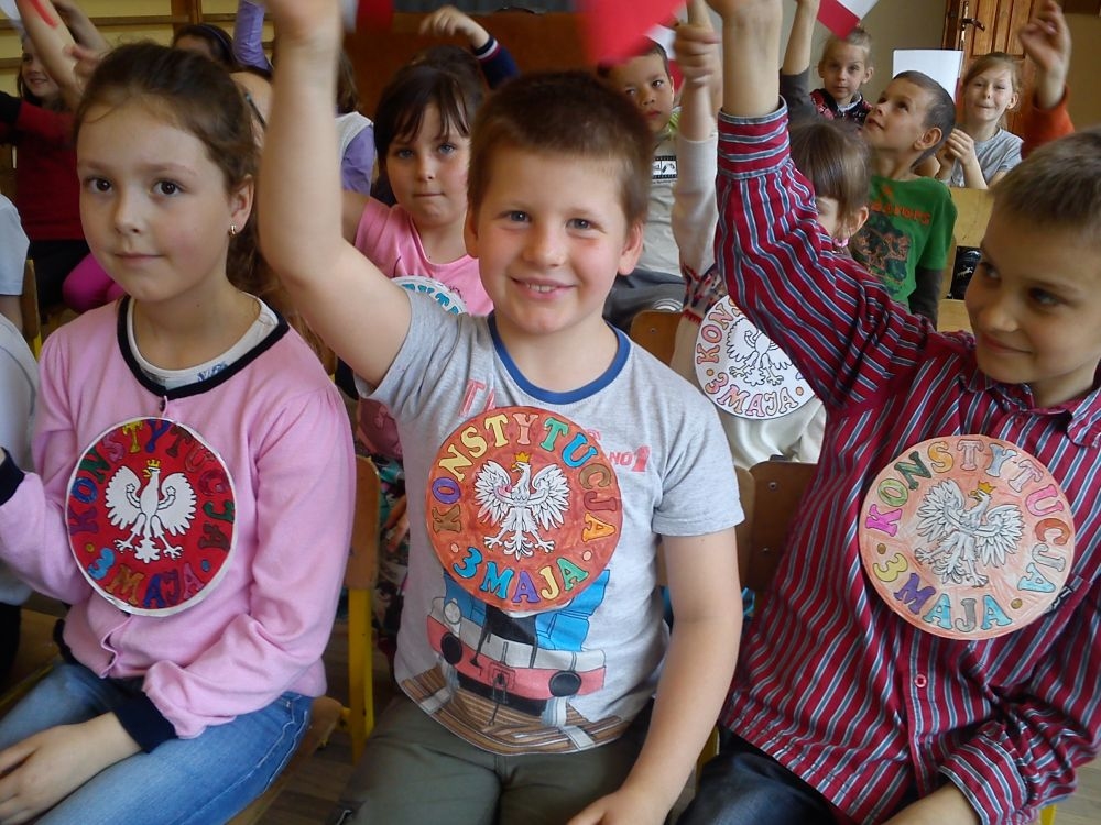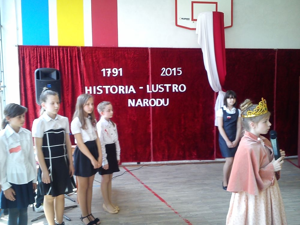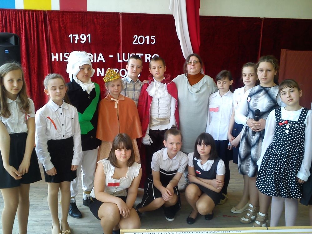 30 kwietnia - jak co roku – uczniowie naszej szkoły uroczystą akademią uczcili kolejną rocznicę uchwalenia Konstytucji 3 – go Maja. Motto imprezy brzmiało: „Historia – lustro narodu”. Uczniowie klas IV – VI przybliżyli szkolnej społeczności fragment dziejów Polski, dotyczący okresu zaborów oraz powołania do życia Konstytucji 3 – go Maja. Na scenie pojawili się: caryca Katarzyna, król pruski Fryderyk oraz ambasador rosyjski. Aktorzy byli ubrani w charakterystyczne dla epoki kostiumy, które przygotowali przy pomocy rodziców. Teksty wygłaszane przez uczniów zostały dopełnione scenkami dramowymi i utworami muzycznymi, niosącymi głębokie przesłanie. Wśród melodii znalazły się współczesne piosenki takich zespołów jak: Róże Europy, Raz, Dwa, Trzy.