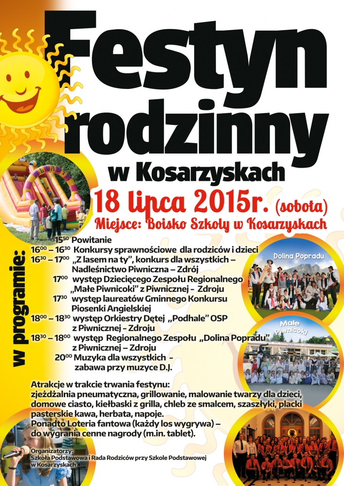 Drukuj Powrót do poprzedniej strony Festyn Rodzinny 10.07.2015 18:59 Treść ZAPRASZAMY W imieniu Dyrekcji, Nauczycieli oraz Rady Rodziców Szkoły Podstawowej w Kosarzyskach zapraszamy na Festyn Rodzinny,który odbędzie się w sobotę 18 lipca 2015 r.