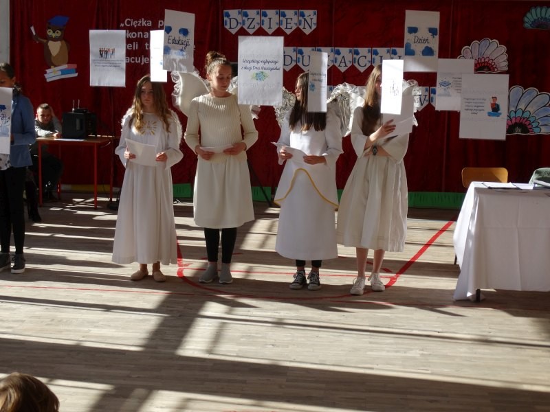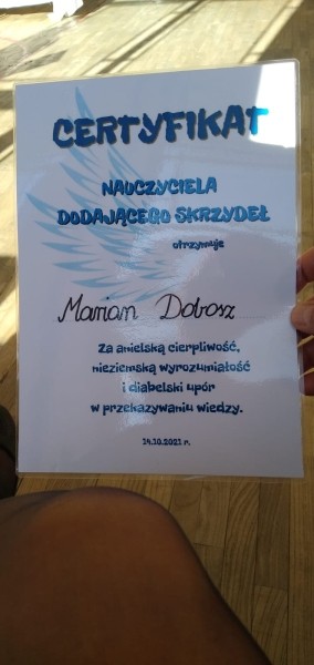 Wszyscy nauczyciele otrzymali od uczniów pamiątkowe Certyfikaty tzw. ,,Nauczyciela dodającego skrzydeł za anielską cierpliwość, nieziemską wyrozumiałość i diabelski upór w przekazywaniu wiedzy”