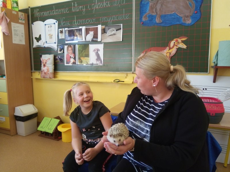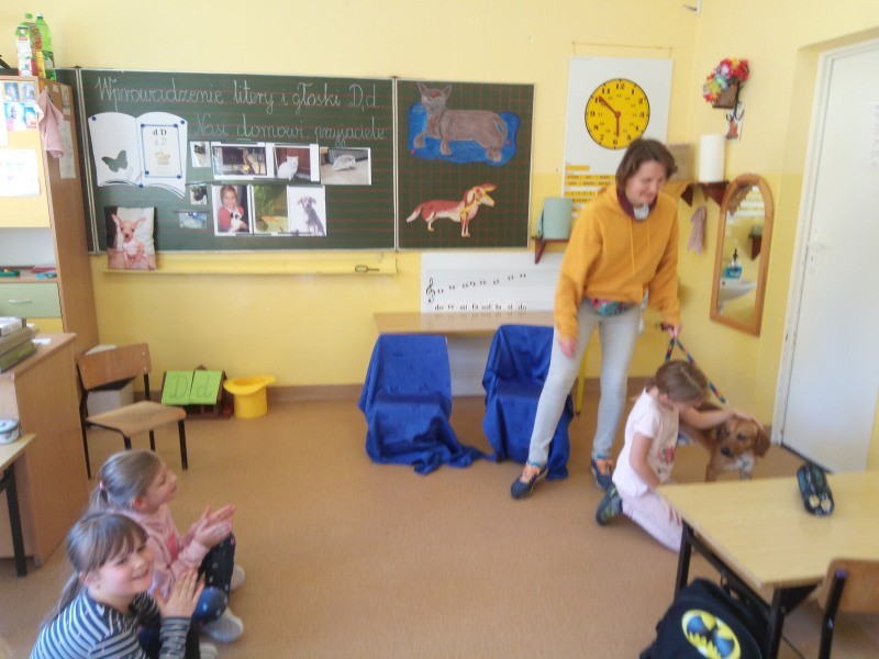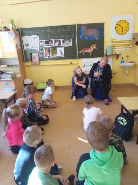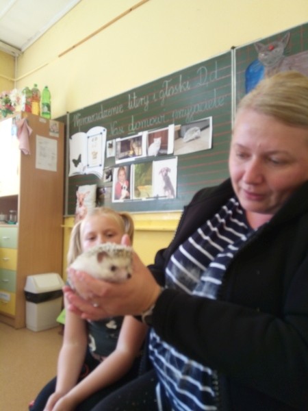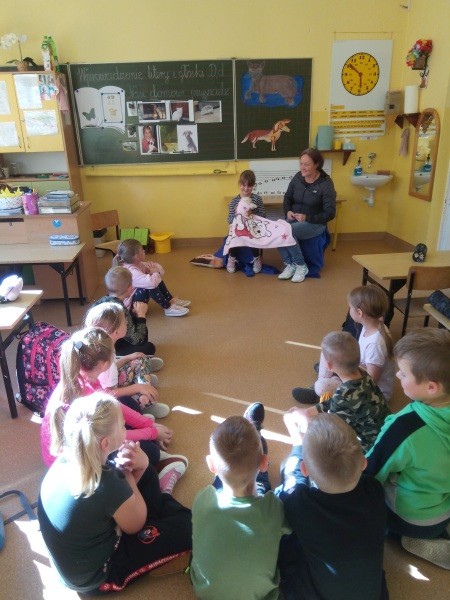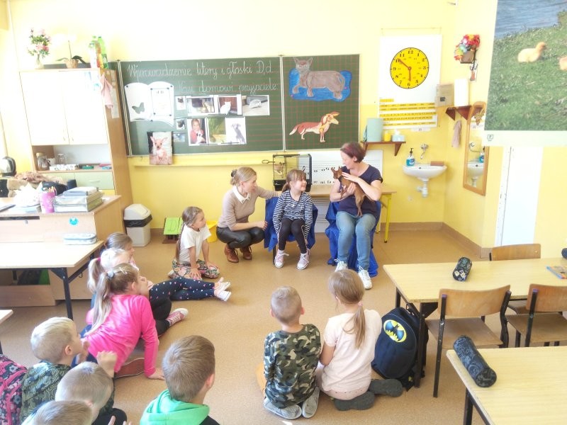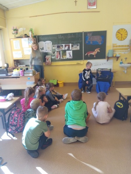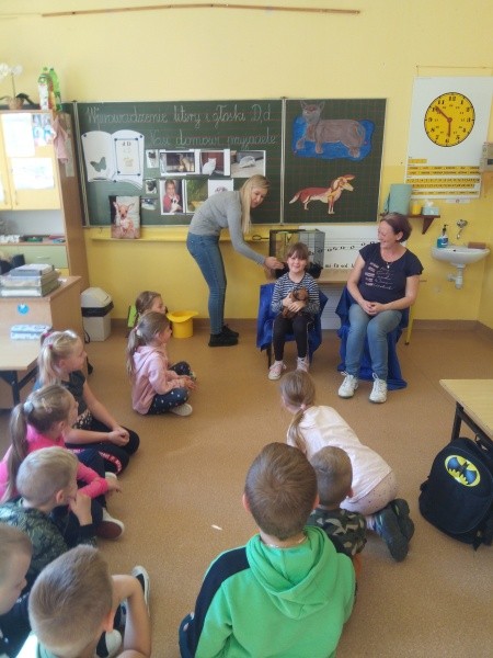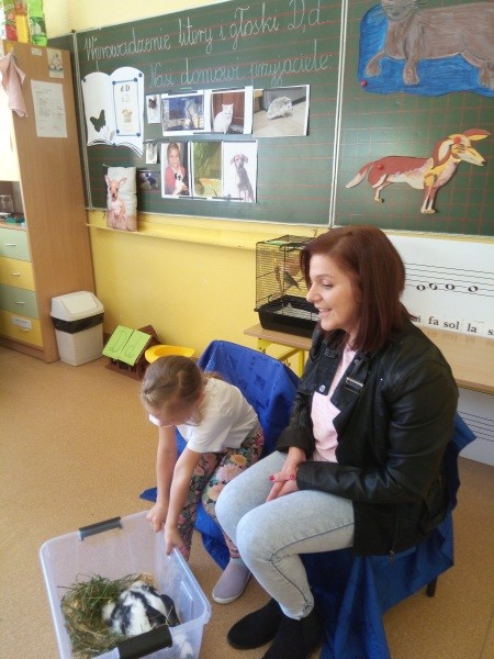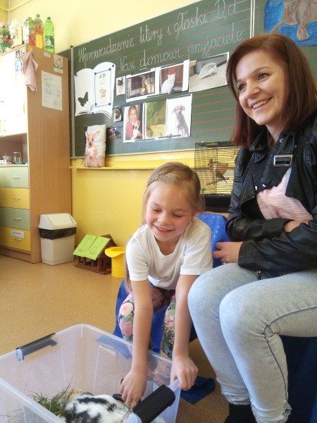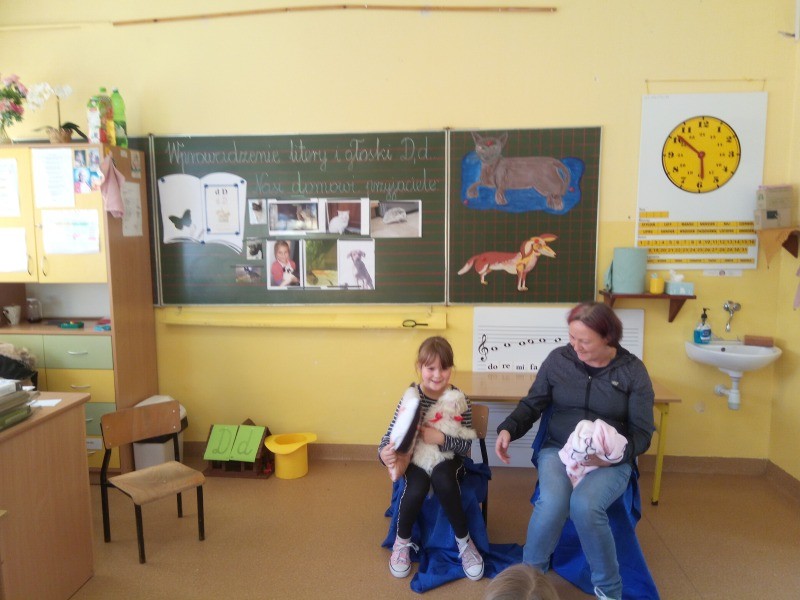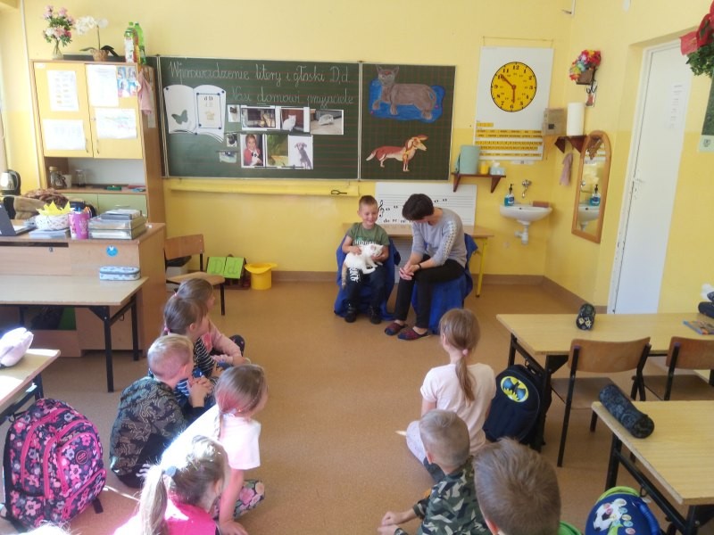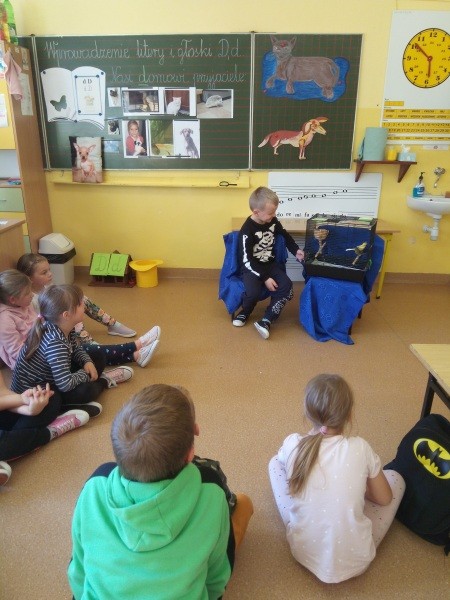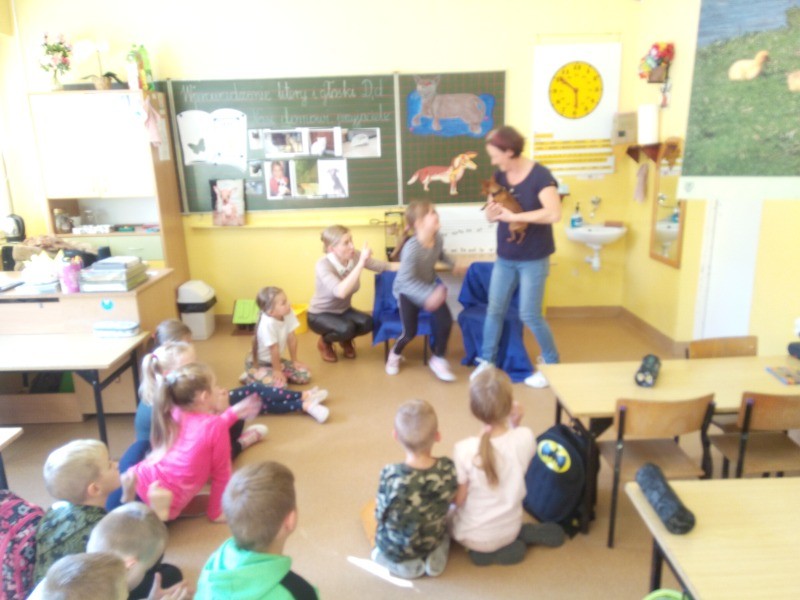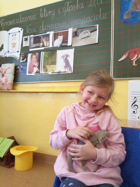 W naszej klasie, pierwszej klasie wre nauka, praca wre… Przyjaciele wśród przyjaciół dzisiaj odnajdują się. Dzień wyjątkowy zarówno dla dzieci , jak i ich zwierzęcych ulubieńców. Lekcje poświęcone powyższej tematyce. Dzieci przychodzą do szkoły zaabsorbowane faktem, że w swoich plecakach posiadają piękne fotografie, opisy, a nawet poduszki przedstawiające ulubione zwierzątko, które znajduje się pod ich szczególną pieczą. Takie ,z którym są związane poprzez sympatię, wspólne historie i wydarzenia. Zwierzątka, z którymi chciałyby spędzić czas w szkole….ale wiadomo… Nie mogą ich przynieść ze sobą, bo…. albo są zbyt duże, albo niebezpieczne…. albo mogą nam przeszkadzać w nauce… Trudno. Muszą wystarczyć inne pomoce niżeli zwierzątko we własnej postaci. W dniu dzisiejszym odwiedza nas Pan Dyrektor. Obserwuje jak się uczymy, w jaki sposób z zapałem opowiadamy o naszych pupilach. Chwali nas za zaangażowanie w naukę. Jesteśmy podniesieni na duchu, docenieni, szczęśliwi. Ktoś nam jednak zaczyna przeszkadzać. Co to takiego? Czyżby ktoś zapomniał wyłączyć dzwonek w telefonie? Nie... , nie…, nic bardziej mylnego. To z ukrycia wyłaniają się kanarki Szymona. Co za odwiedziny. O jakże łatwiej teraz opowiedzieć o swoich ulubieńcach, którzy sprawiają wrażenie, jakby dyskutowały z nami. Ale czy to koniec przyjemności? „Tylko Szymon jest wyróżniony?”, „ Czy to sprawiedliwe?”- wtrącają dzieci jeden po drugim. Nawet Gabrysia ma nos na kwintę. Na szczęście Pani Małgosia ma w torebce niezawodną różdżkę, więc próbujemy…. I jest.. W drzwiach staje Marszal- czworonożny olbrzym. Czy się cieszyć, czy uciekać? Nie ma się czego obawiać. Za zwierzem wchodzi opiekun w Osobie mamy Konrada…. Następnie Masza- piesek haski –niespodzianka dla naszej Madzi. Tuż za nim prezentuje się Gaja – maleństwo Martuni. W dalszej kolejności podąża Chłystek – czworonóg Gabrysi. Czy jest tam jeszcze ktoś lub coś? Tak, oczywiście. Niespodziewanie wyłania się Reksio – kochane zwierzę Szymonka. Później , „O..o…o… co to za potwór?” – „Nie bójcie się”- uspokaja Julka- „To tylko agama brodata- moja jaszczurka”. Jakże dostojna i spokojna. Tuż za nią podąża Tuptuś- jeżyk pigmejski naszej Asieńki. Teraz czas na króliczka Skłikiego – prawie tak przytulnego jak Maja- jego właścicielka. Za królikiem śmiało kroczy Filemon- kot Wojtusia. „Oj kotku uciekaj, uciekaj, bo za tobą wchodzą rybki….A raczej wpływają. Nie chcemy tu kłopotów. A czyje one są?” Ich obecność uspokaja nas tak samo jak cichutki Wojtuś- one muszą być Jego własnością. Każdego pierwszoklasistę odwiedził dzisiaj jego ulubieniec. Był to bardzo miły prezent przygotowany w tajemnicy przed dziećmi. Dziękujemy Rodzicom za trud i zaangażowanie.