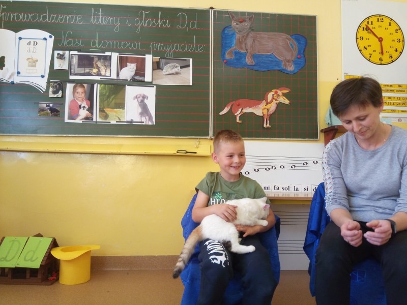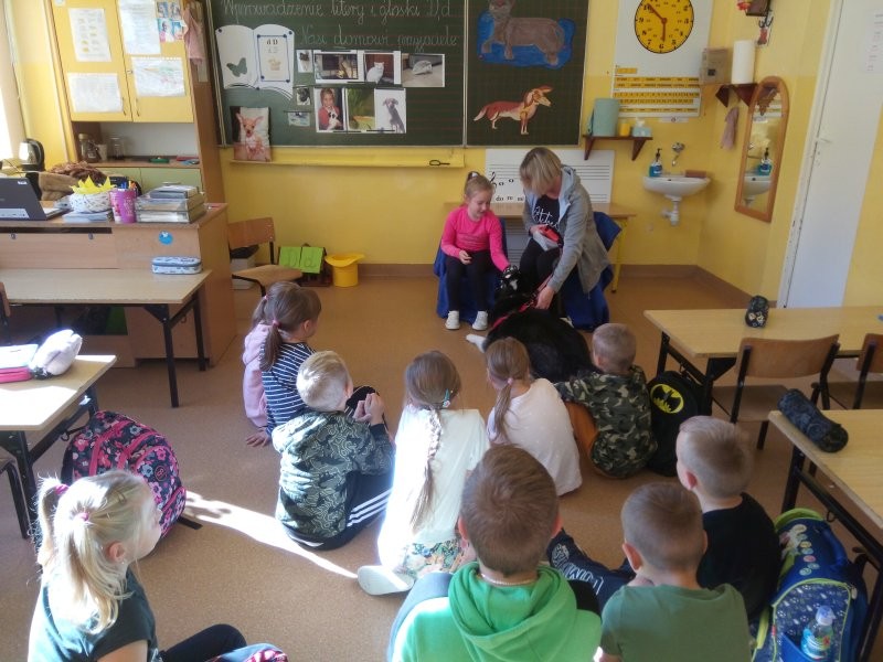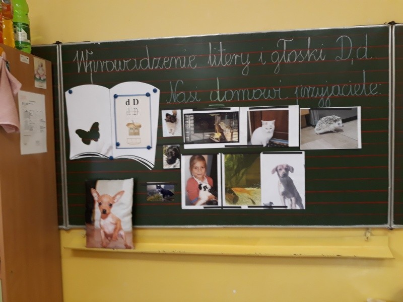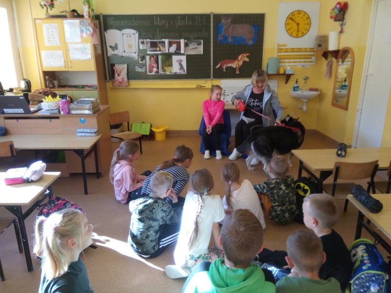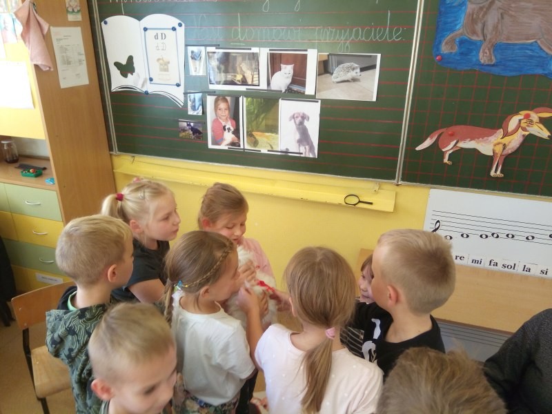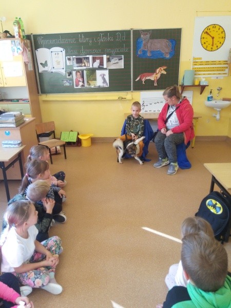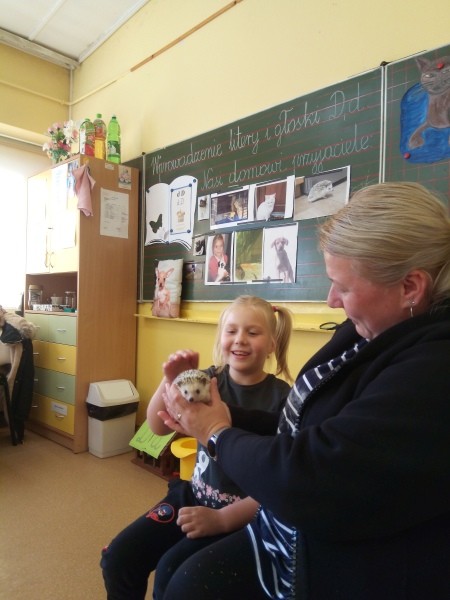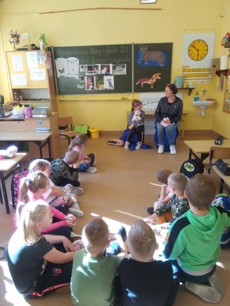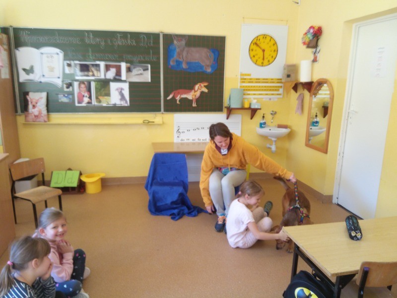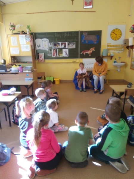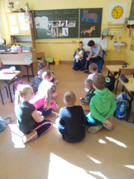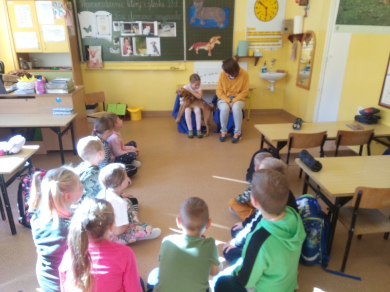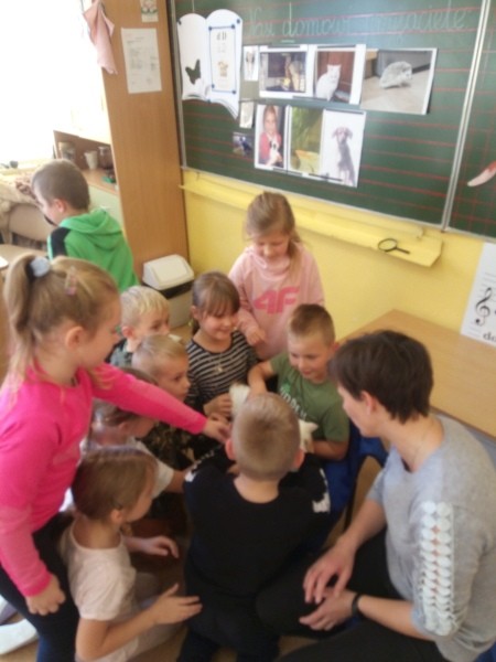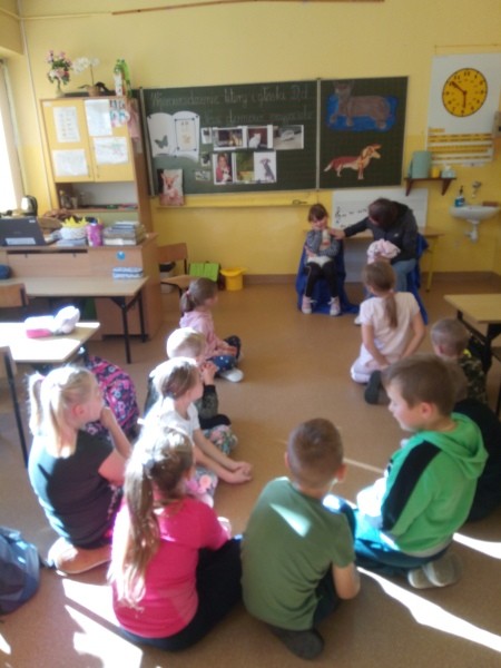 W naszej klasie, pierwszej klasie wre nauka, praca wre… Przyjaciele wśród przyjaciół dzisiaj odnajdują się. Dzień wyjątkowy zarówno dla dzieci , jak i ich zwierzęcych ulubieńców. Lekcje poświęcone powyższej tematyce. Dzieci przychodzą do szkoły zaabsorbowane faktem, że w swoich plecakach posiadają piękne fotografie, opisy, a nawet poduszki przedstawiające ulubione zwierzątko, które znajduje się pod ich szczególną pieczą. Takie ,z którym są związane poprzez sympatię, wspólne historie i wydarzenia. Zwierzątka, z którymi chciałyby spędzić czas w szkole….ale wiadomo… Nie mogą ich przynieść ze sobą, bo…. albo są zbyt duże, albo niebezpieczne…. albo mogą nam przeszkadzać w nauce… Trudno. Muszą wystarczyć inne pomoce niżeli zwierzątko we własnej postaci. W dniu dzisiejszym odwiedza nas Pan Dyrektor. Obserwuje jak się uczymy, w jaki sposób z zapałem opowiadamy o naszych pupilach. Chwali nas za zaangażowanie w naukę. Jesteśmy podniesieni na duchu, docenieni, szczęśliwi. Ktoś nam jednak zaczyna przeszkadzać. Co to takiego? Czyżby ktoś zapomniał wyłączyć dzwonek w telefonie? Nie... , nie…, nic bardziej mylnego. To z ukrycia wyłaniają się kanarki Szymona. Co za odwiedziny. O jakże łatwiej teraz opowiedzieć o swoich ulubieńcach, którzy sprawiają wrażenie, jakby dyskutowały z nami. Ale czy to koniec przyjemności? „Tylko Szymon jest wyróżniony?”, „ Czy to sprawiedliwe?”- wtrącają dzieci jeden po drugim. Nawet Gabrysia ma nos na kwintę. Na szczęście Pani Małgosia ma w torebce niezawodną różdżkę, więc próbujemy…. I jest.. W drzwiach staje Marszal- czworonożny olbrzym. Czy się cieszyć, czy uciekać? Nie ma się czego obawiać. Za zwierzem wchodzi opiekun w Osobie mamy Konrada…. Następnie Masza- piesek haski –niespodzianka dla naszej Madzi. Tuż za nim prezentuje się Gaja – maleństwo Martuni. W dalszej kolejności podąża Chłystek – czworonóg Gabrysi. Czy jest tam jeszcze ktoś lub coś? Tak, oczywiście. Niespodziewanie wyłania się Reksio – kochane zwierzę Szymonka. Później , „O..o…o… co to za potwór?” – „Nie bójcie się”- uspokaja Julka- „To tylko agama brodata- moja jaszczurka”. Jakże dostojna i spokojna. Tuż za nią podąża Tuptuś- jeżyk pigmejski naszej Asieńki. Teraz czas na króliczka Skłikiego – prawie tak przytulnego jak Maja- jego właścicielka. Za królikiem śmiało kroczy Filemon- kot Wojtusia. „Oj kotku uciekaj, uciekaj, bo za tobą wchodzą rybki….A raczej wpływają. Nie chcemy tu kłopotów. A czyje one są?” Ich obecność uspokaja nas tak samo jak cichutki Wojtuś- one muszą być Jego własnością. Każdego pierwszoklasistę odwiedził dzisiaj jego ulubieniec. Był to bardzo miły prezent przygotowany w tajemnicy przed dziećmi. Dziękujemy Rodzicom za trud i zaangażowanie.