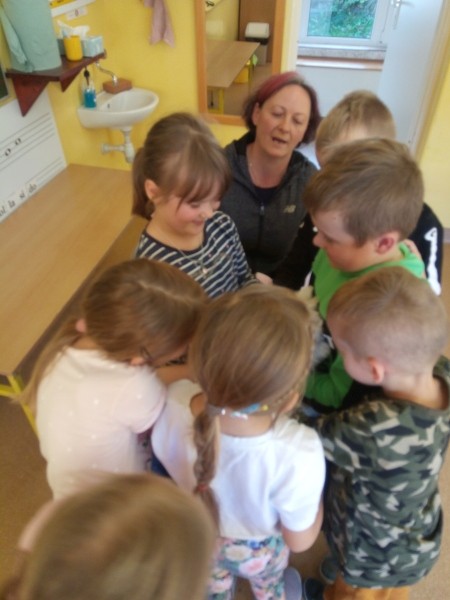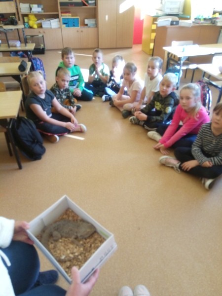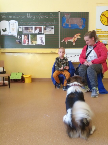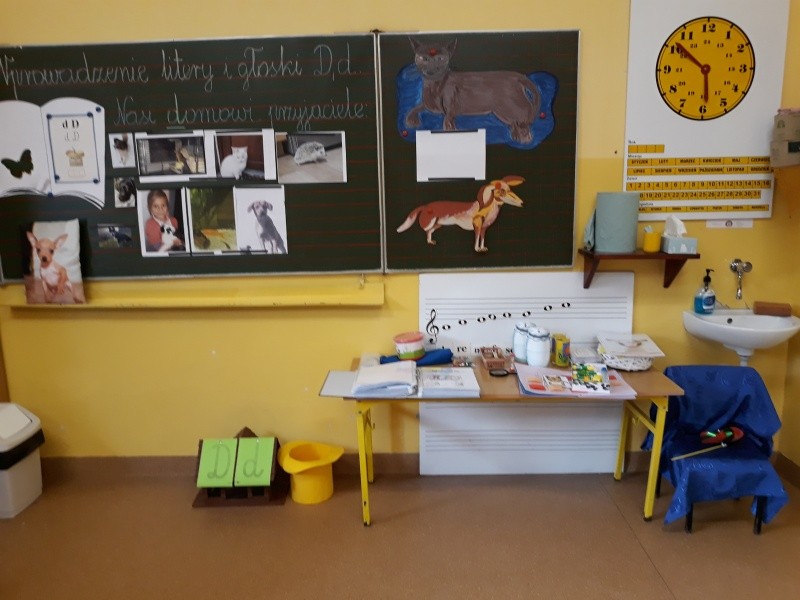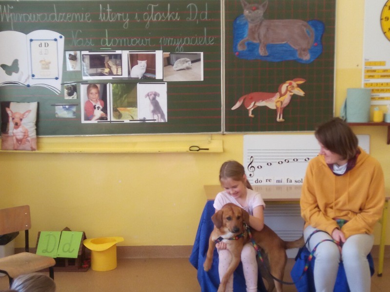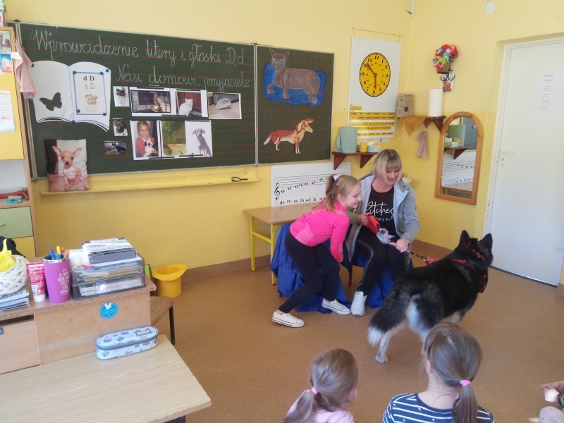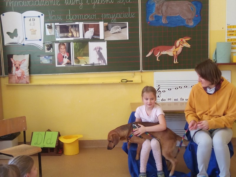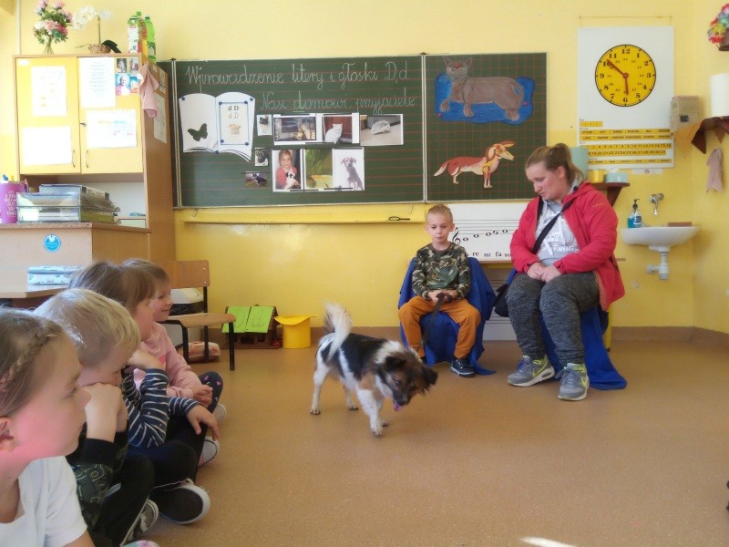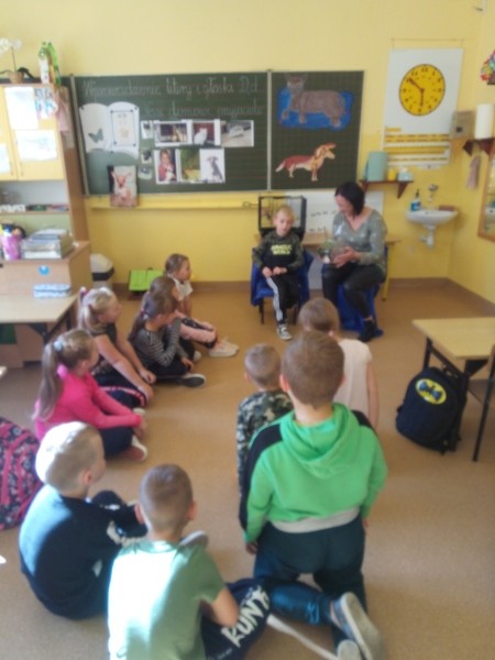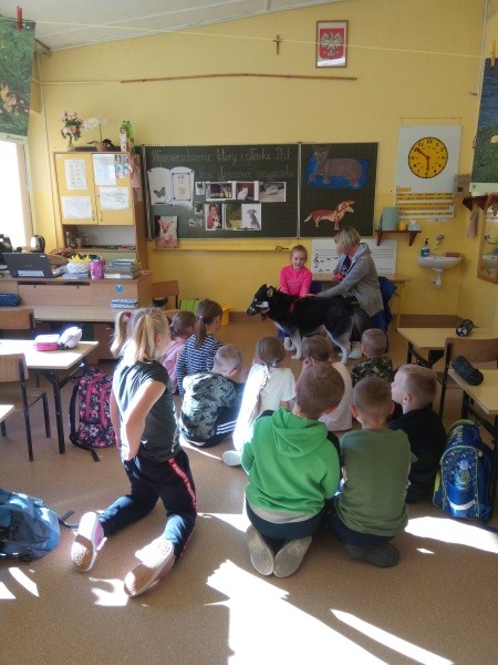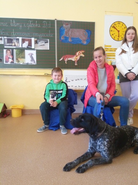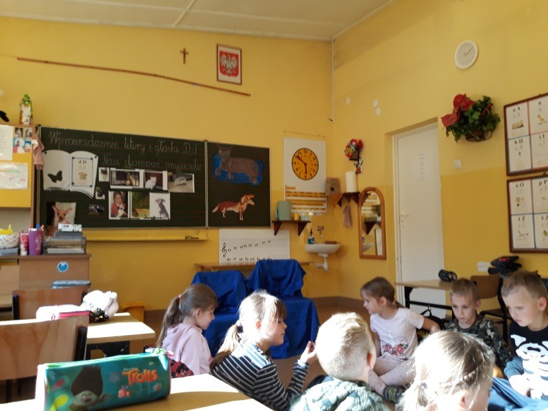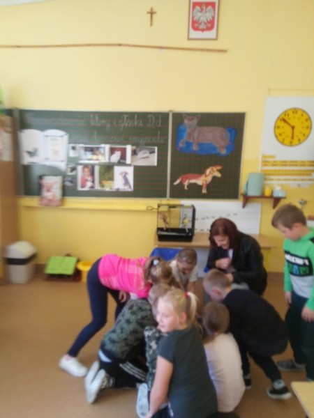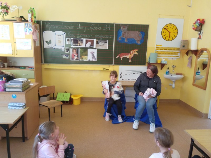 W naszej klasie, pierwszej klasie wre nauka, praca wre… Przyjaciele wśród przyjaciół dzisiaj odnajdują się. Dzień wyjątkowy zarówno dla dzieci , jak i ich zwierzęcych ulubieńców. Lekcje poświęcone powyższej tematyce. Dzieci przychodzą do szkoły zaabsorbowane faktem, że w swoich plecakach posiadają piękne fotografie, opisy, a nawet poduszki przedstawiające ulubione zwierzątko, które znajduje się pod ich szczególną pieczą. Takie ,z którym są związane poprzez sympatię, wspólne historie i wydarzenia. Zwierzątka, z którymi chciałyby spędzić czas w szkole….ale wiadomo… Nie mogą ich przynieść ze sobą, bo…. albo są zbyt duże, albo niebezpieczne…. albo mogą nam przeszkadzać w nauce… Trudno. Muszą wystarczyć inne pomoce niżeli zwierzątko we własnej postaci. W dniu dzisiejszym odwiedza nas Pan Dyrektor. Obserwuje jak się uczymy, w jaki sposób z zapałem opowiadamy o naszych pupilach. Chwali nas za zaangażowanie w naukę. Jesteśmy podniesieni na duchu, docenieni, szczęśliwi. Ktoś nam jednak zaczyna przeszkadzać. Co to takiego? Czyżby ktoś zapomniał wyłączyć dzwonek w telefonie? Nie... , nie…, nic bardziej mylnego. To z ukrycia wyłaniają się kanarki Szymona. Co za odwiedziny. O jakże łatwiej teraz opowiedzieć o swoich ulubieńcach, którzy sprawiają wrażenie, jakby dyskutowały z nami. Ale czy to koniec przyjemności? „Tylko Szymon jest wyróżniony?”, „ Czy to sprawiedliwe?”- wtrącają dzieci jeden po drugim. Nawet Gabrysia ma nos na kwintę. Na szczęście Pani Małgosia ma w torebce niezawodną różdżkę, więc próbujemy…. I jest.. W drzwiach staje Marszal- czworonożny olbrzym. Czy się cieszyć, czy uciekać? Nie ma się czego obawiać. Za zwierzem wchodzi opiekun w Osobie mamy Konrada…. Następnie Masza- piesek haski –niespodzianka dla naszej Madzi. Tuż za nim prezentuje się Gaja – maleństwo Martuni. W dalszej kolejności podąża Chłystek – czworonóg Gabrysi. Czy jest tam jeszcze ktoś lub coś? Tak, oczywiście. Niespodziewanie wyłania się Reksio – kochane zwierzę Szymonka. Później , „O..o…o… co to za potwór?” – „Nie bójcie się”- uspokaja Julka- „To tylko agama brodata- moja jaszczurka”. Jakże dostojna i spokojna. Tuż za nią podąża Tuptuś- jeżyk pigmejski naszej Asieńki. Teraz czas na króliczka Skłikiego – prawie tak przytulnego jak Maja- jego właścicielka. Za królikiem śmiało kroczy Filemon- kot Wojtusia. „Oj kotku uciekaj, uciekaj, bo za tobą wchodzą rybki….A raczej wpływają. Nie chcemy tu kłopotów. A czyje one są?” Ich obecność uspokaja nas tak samo jak cichutki Wojtuś- one muszą być Jego własnością. Każdego pierwszoklasistę odwiedził dzisiaj jego ulubieniec. Był to bardzo miły prezent przygotowany w tajemnicy przed dziećmi. Dziękujemy Rodzicom za trud i zaangażowanie.