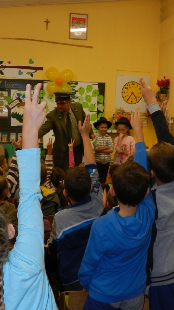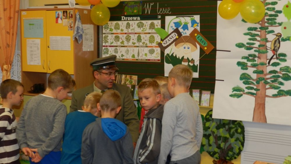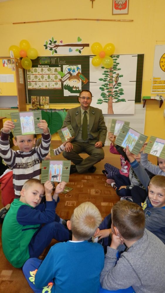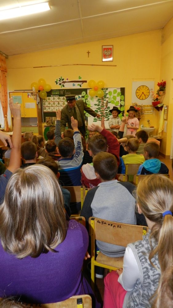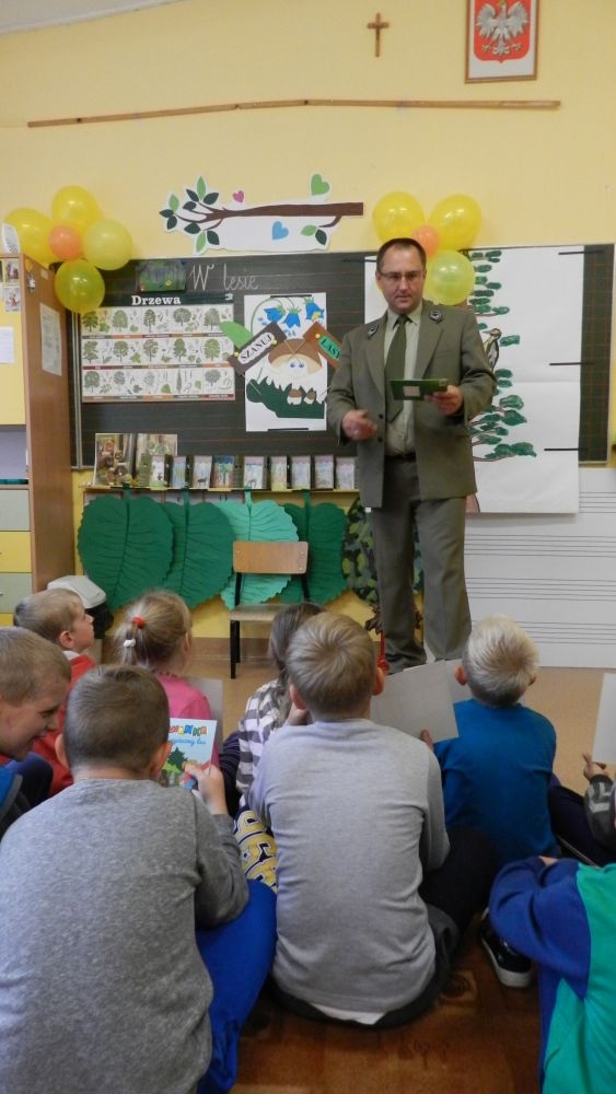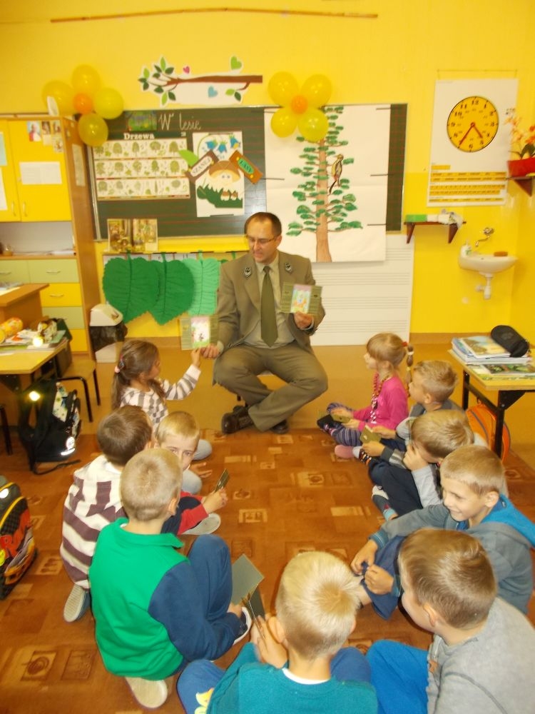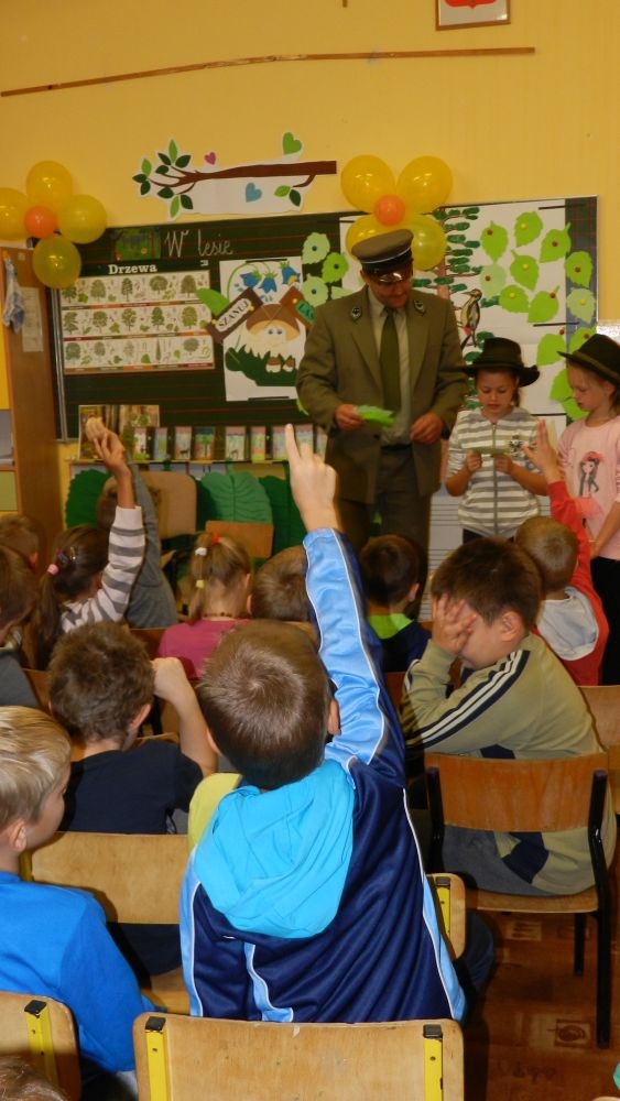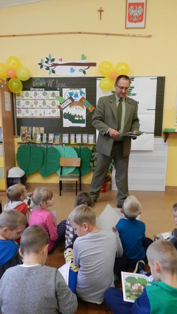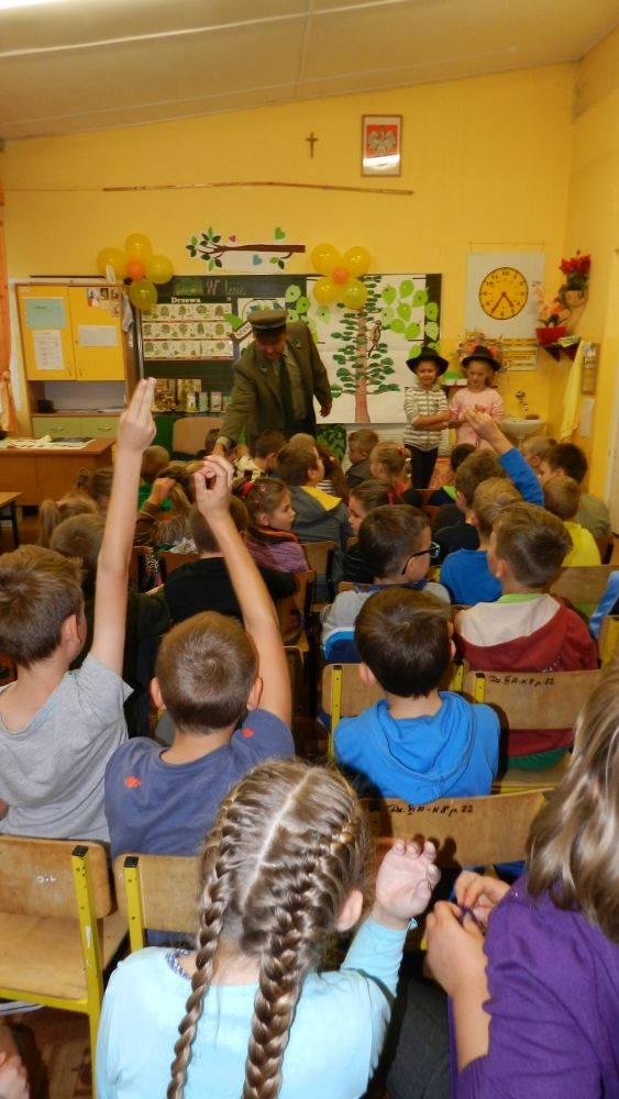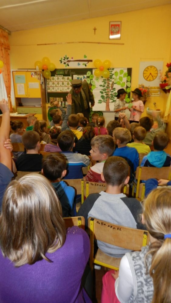 W październikowy poranek do szkoły w Kosarzyskach zawitał leśnik- Roman Rams. Wprowadził On uczniów klas I, II, III w świat tajników nadpopradzkiej przyrody, bliskiej dzieciom ze względu na zamieszkanie, ale jeszcze nie do końca zgłębionej przez małych przyrodników. Pan Roman Rams opowiedział dzieciom o lesie, jego walorach przyrodniczych, korzyściach jakie niesie dla człowieka i innych organizmów żywych. W pogadankę aktywnie angażowali się uczniowie, na żywo zadając pytania lub udzielając odpowiedzi na leśne zagadki. Kiedy dzieci zapoznały się z walorami lasu i umiały wyjaśnić, co znaczy, że „las jest przyjacielem człowieka”, przyszedł czas, by zastanowić się, co my ludzie, możemy uczynić, by odwdzięczyć się przyrodzie, lasowi za okazywane dobra i korzyści, jakie czerpiemy za jego pośrednictwem . Dzieci jednomyślnie stwierdziły, że chcą i będą przyjaciółmi lasu i wiedzą już, jak to zrobić. Po przeprowadzeniu zajęć edukacyjnych, dzieci wzięły udział w konkursach. Dla uczniów klasy I i II leśnik przygotował pytania w formie zagadek, które ukryte były na odwrocie kwiatów i jesiennych liści. Maluchy radziły sobie wyśmienicie z rymowanymi zagadkami. Dla dzieci starszych został przygotowany pisemny quiz, z trudniejszymi pytaniami. By złapać przysłowiowy i dosłowny oddech, uczniowie wyruszyli na zajęcia w terenie. Warsztaty leśne dały możliwość poznania etapów powstawania lasu i poznania trudu, jaki trzeba włożyć w to, by ludzie mogli korzystać i cieszyć się jego wieloaspektowymi walorami. Na spotkaniu w terenie, dzieci wielozmysłowo poznawały las, poprzez dotyk, węch, słuch i wzrokowe podziwianie przyrody. Uczniowie rozróżniali także gatunki drzew po ich korze, liściach i owocach. Poprzez leśne poszukiwania, pogadanki, pytania i odpowiedzi uczniowie zrozumieli sens cyklu powstawania lasu : „od nasionka do nasionka”. Po terenowych wojażach uczniowie powrócili do szkoły, gdzie ogłoszone zostały wyniki przeprowadzonych konkursów przyrodniczych. Ci najlepsi zostali uhonorowani nagrodami książkowymi, kolorowankami, notesami i gadżetami, przekazanymi przez Nadleśnictwo Piwniczna. Również nasz leśny edukator- Roman Rams został nagrodzony przez dzieci gromkimi brawami oraz własnoręcznie przygotowanymi „oknami na las”- które po rozchyleniu okiennic skrywały piękne krajobrazy naszej okolicy.