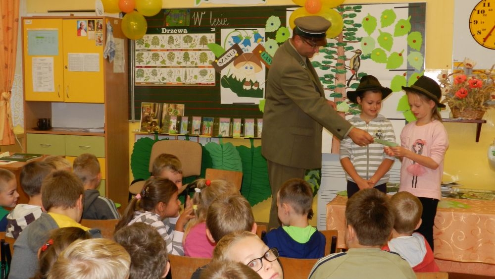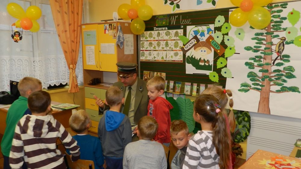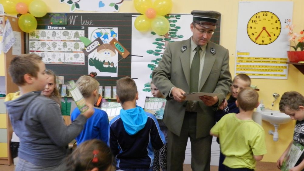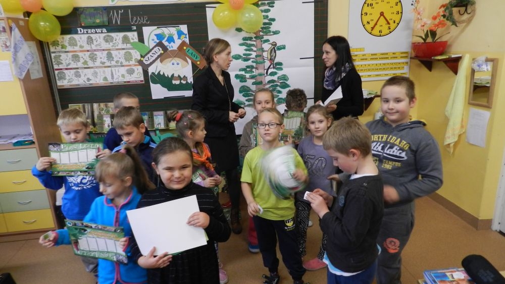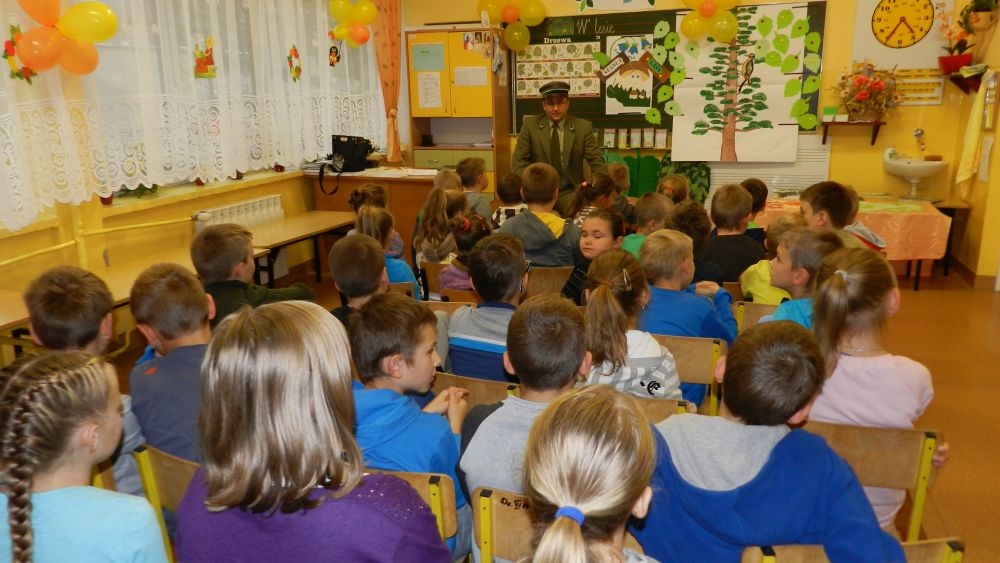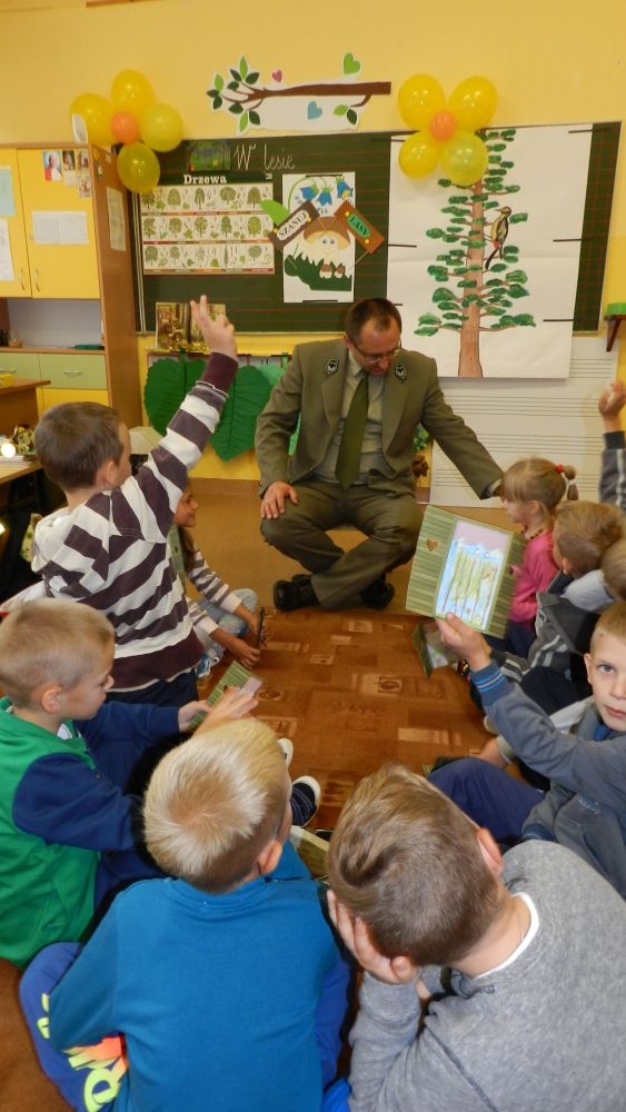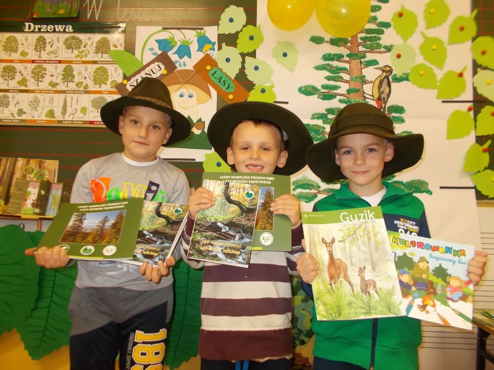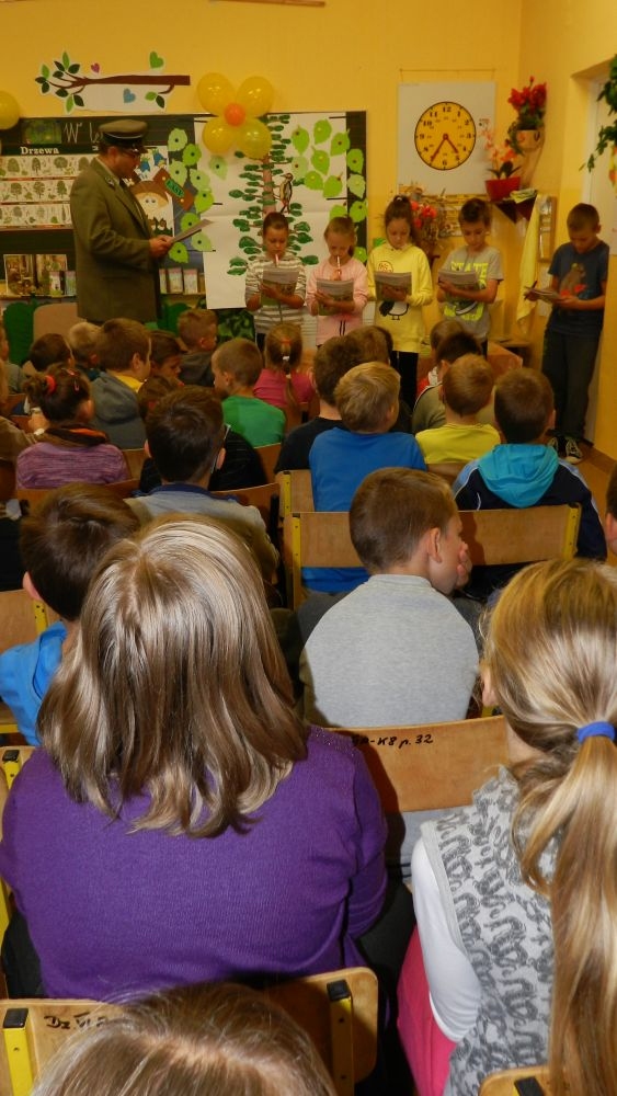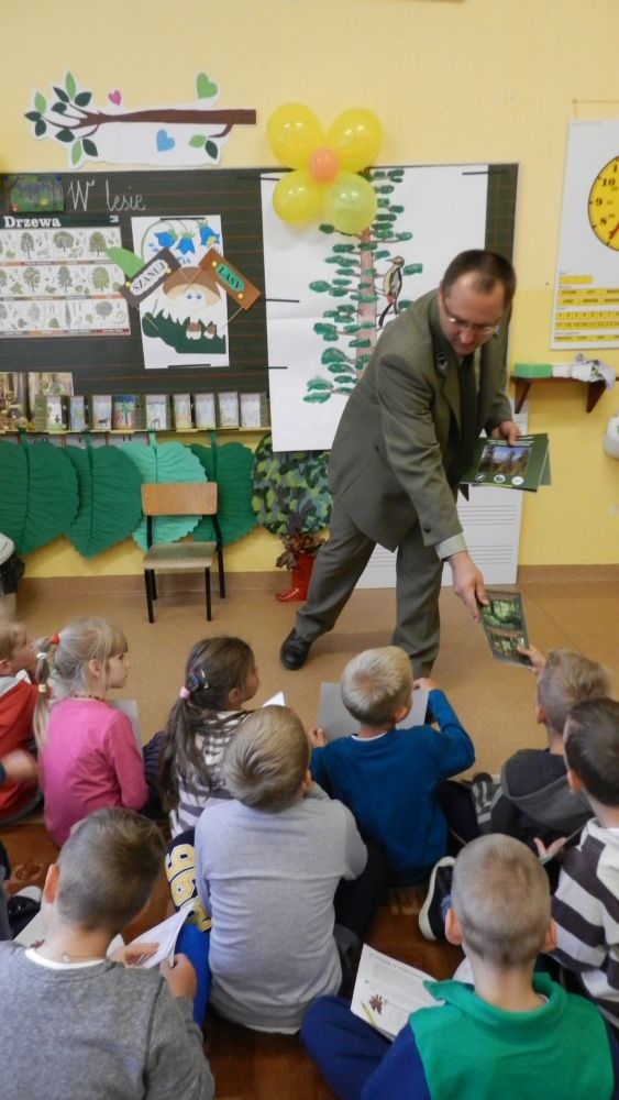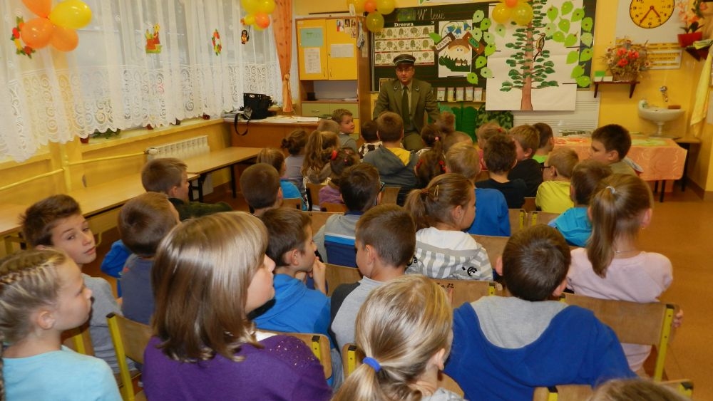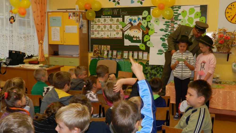 W październikowy poranek do szkoły w Kosarzyskach zawitał leśnik- Roman Rams. Wprowadził On uczniów klas I, II, III w świat tajników nadpopradzkiej przyrody, bliskiej dzieciom ze względu na zamieszkanie, ale jeszcze nie do końca zgłębionej przez małych przyrodników. Pan Roman Rams opowiedział dzieciom o lesie, jego walorach przyrodniczych, korzyściach jakie niesie dla człowieka i innych organizmów żywych. W pogadankę aktywnie angażowali się uczniowie, na żywo zadając pytania lub udzielając odpowiedzi na leśne zagadki. Kiedy dzieci zapoznały się z walorami lasu i umiały wyjaśnić, co znaczy, że „las jest przyjacielem człowieka”, przyszedł czas, by zastanowić się, co my ludzie, możemy uczynić, by odwdzięczyć się przyrodzie, lasowi za okazywane dobra i korzyści, jakie czerpiemy za jego pośrednictwem . Dzieci jednomyślnie stwierdziły, że chcą i będą przyjaciółmi lasu i wiedzą już, jak to zrobić. Po przeprowadzeniu zajęć edukacyjnych, dzieci wzięły udział w konkursach. Dla uczniów klasy I i II leśnik przygotował pytania w formie zagadek, które ukryte były na odwrocie kwiatów i jesiennych liści. Maluchy radziły sobie wyśmienicie z rymowanymi zagadkami. Dla dzieci starszych został przygotowany pisemny quiz, z trudniejszymi pytaniami. By złapać przysłowiowy i dosłowny oddech, uczniowie wyruszyli na zajęcia w terenie. Warsztaty leśne dały możliwość poznania etapów powstawania lasu i poznania trudu, jaki trzeba włożyć w to, by ludzie mogli korzystać i cieszyć się jego wieloaspektowymi walorami. Na spotkaniu w terenie, dzieci wielozmysłowo poznawały las, poprzez dotyk, węch, słuch i wzrokowe podziwianie przyrody. Uczniowie rozróżniali także gatunki drzew po ich korze, liściach i owocach. Poprzez leśne poszukiwania, pogadanki, pytania i odpowiedzi uczniowie zrozumieli sens cyklu powstawania lasu : „od nasionka do nasionka”. Po terenowych wojażach uczniowie powrócili do szkoły, gdzie ogłoszone zostały wyniki przeprowadzonych konkursów przyrodniczych. Ci najlepsi zostali uhonorowani nagrodami książkowymi, kolorowankami, notesami i gadżetami, przekazanymi przez Nadleśnictwo Piwniczna. Również nasz leśny edukator- Roman Rams został nagrodzony przez dzieci gromkimi brawami oraz własnoręcznie przygotowanymi „oknami na las”- które po rozchyleniu okiennic skrywały piękne krajobrazy naszej okolicy.